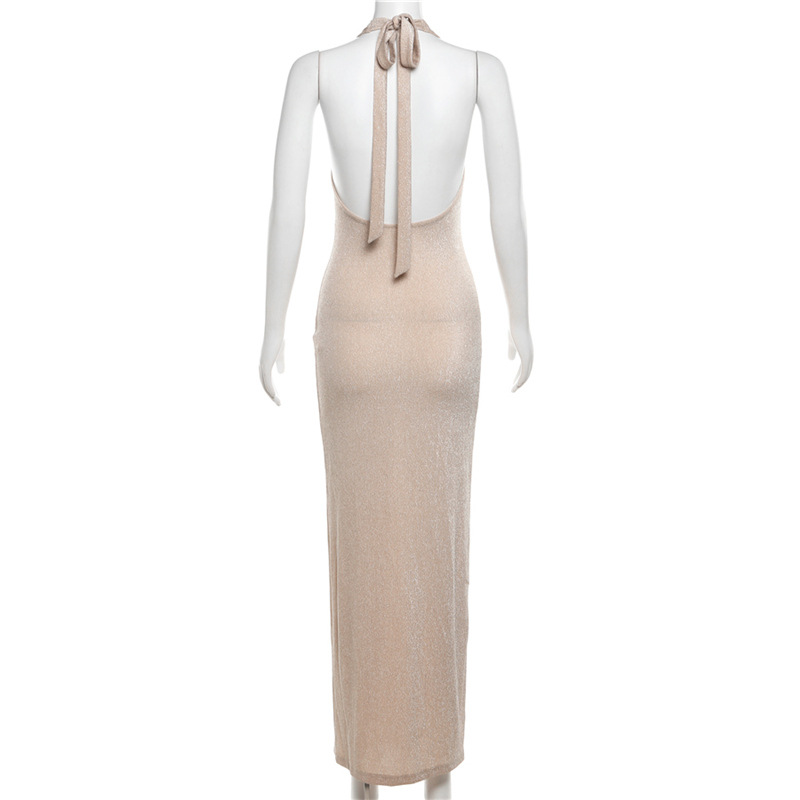 Elegant Halter Backless Tied V neck Slim Fit Dress Maxi Dress for
