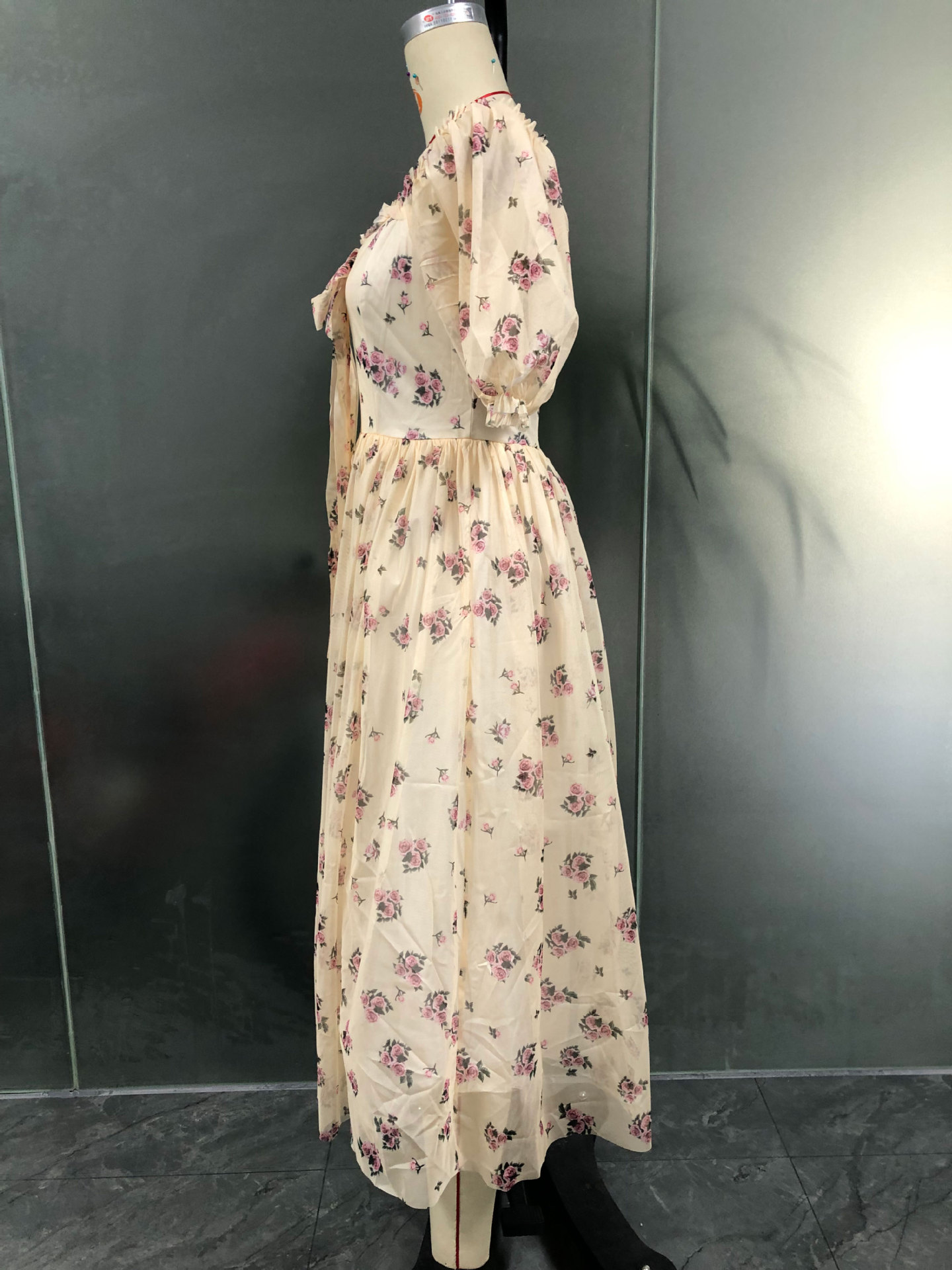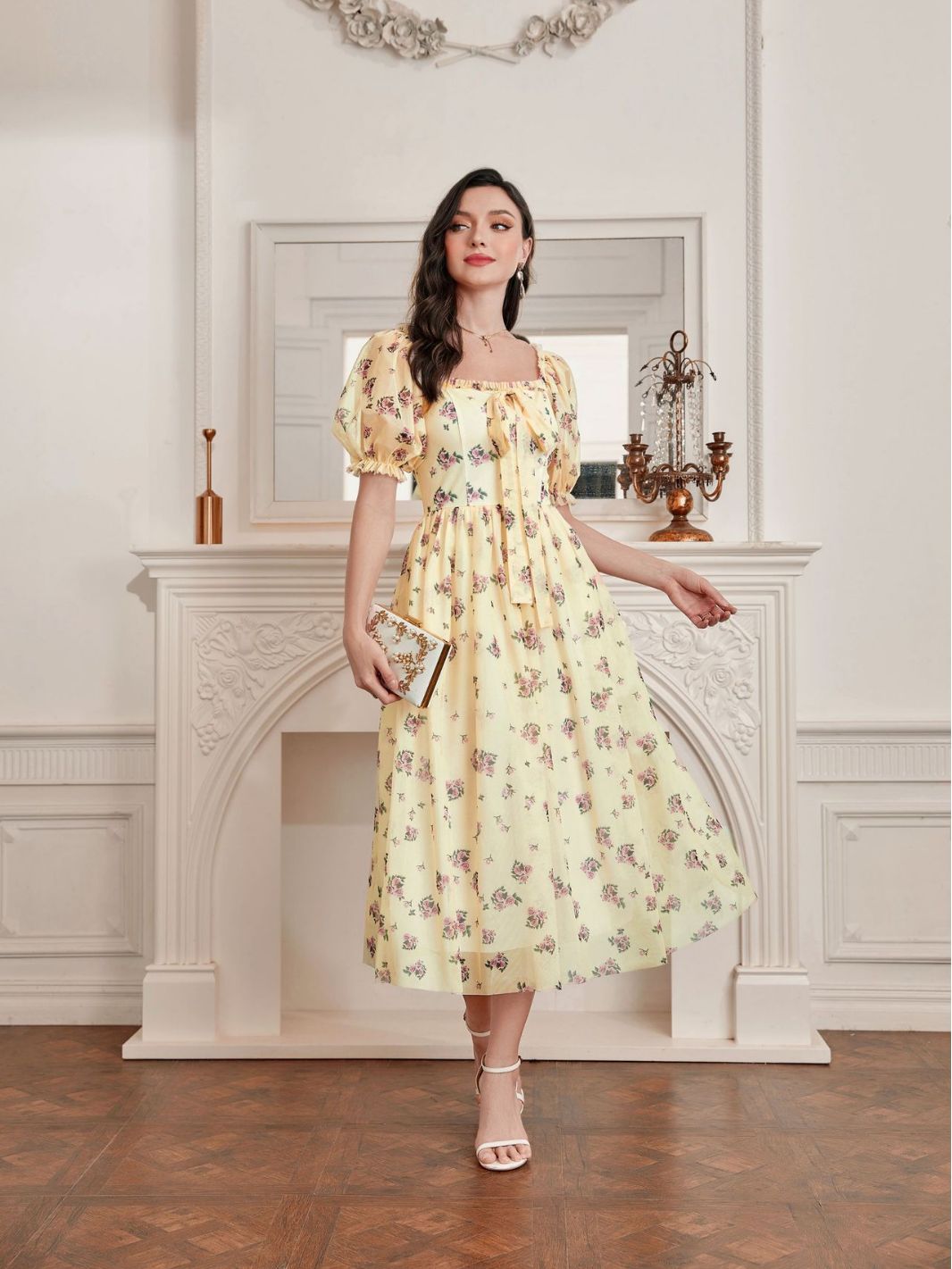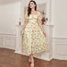 Elegant Mesh Square Collar Puff Sleeve High Waist Dress