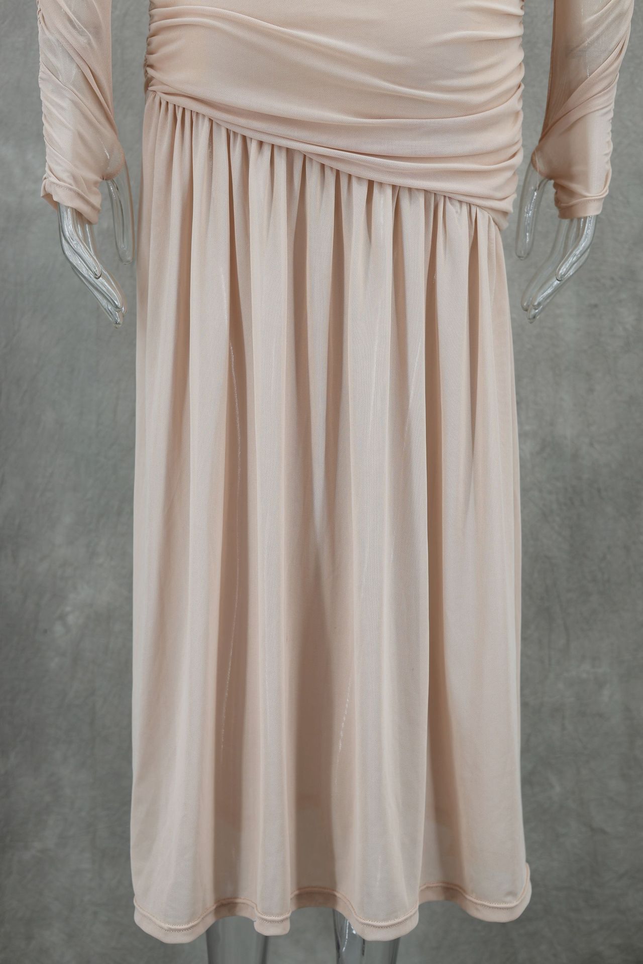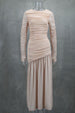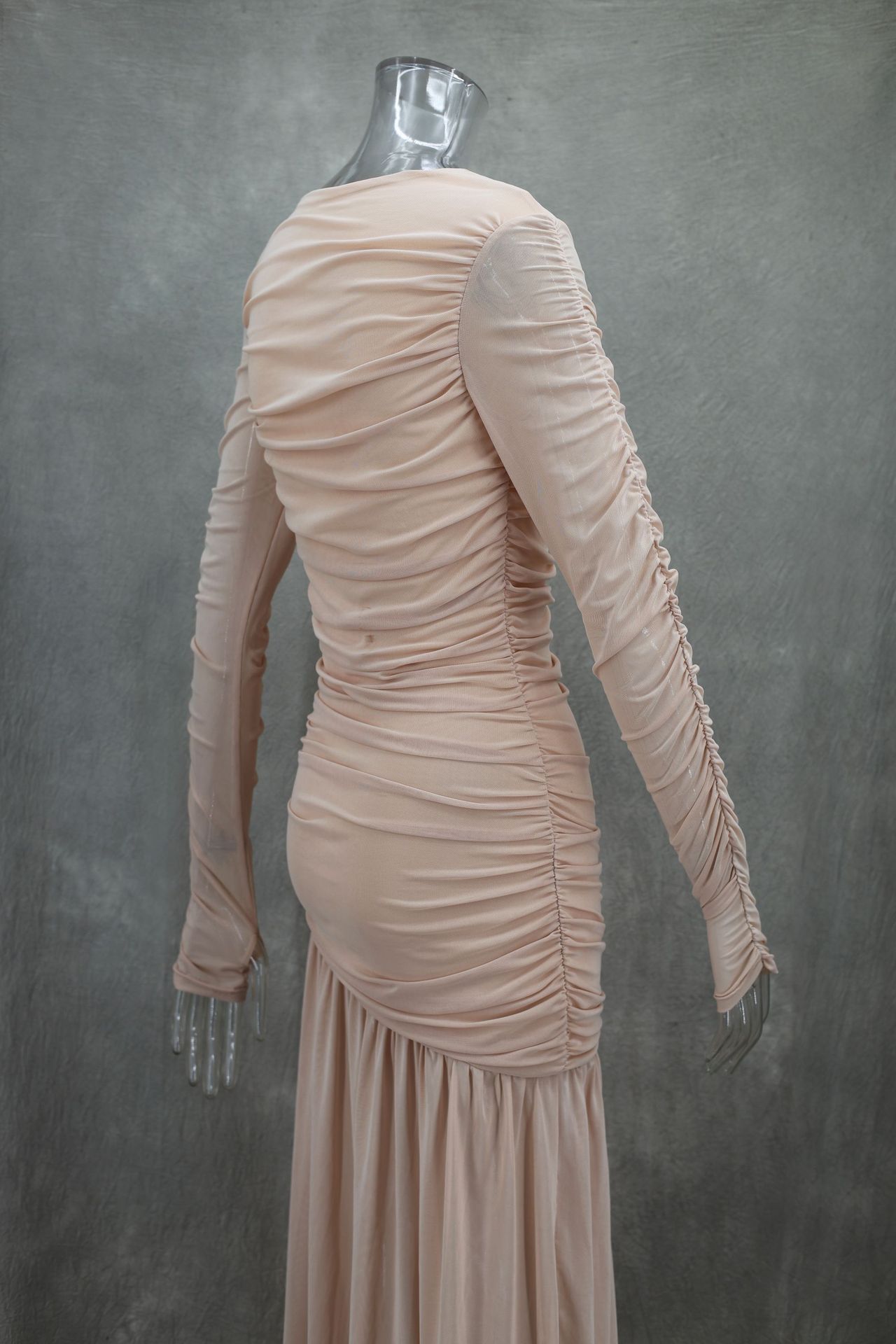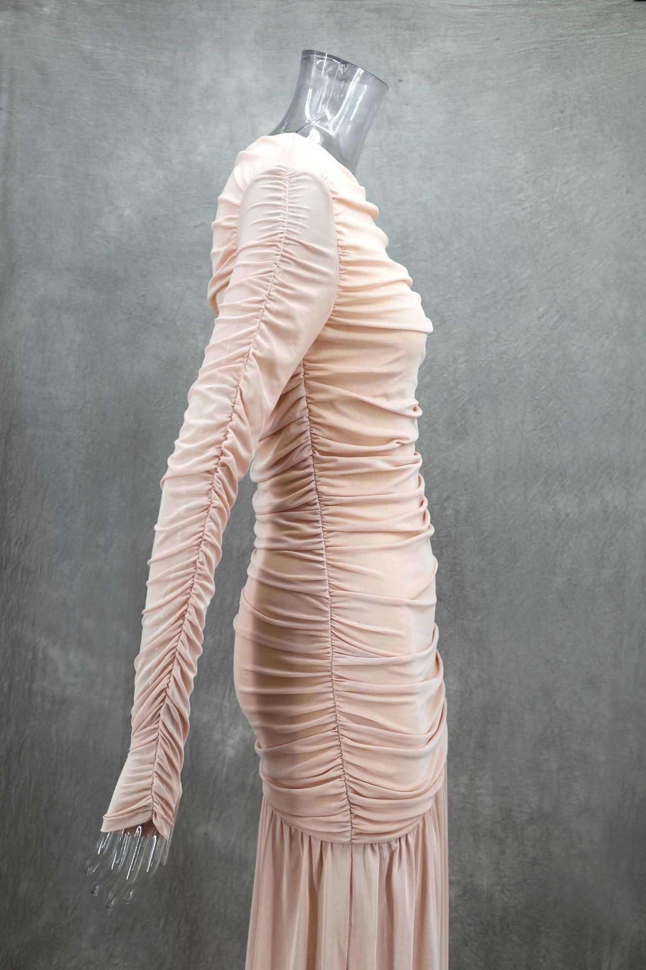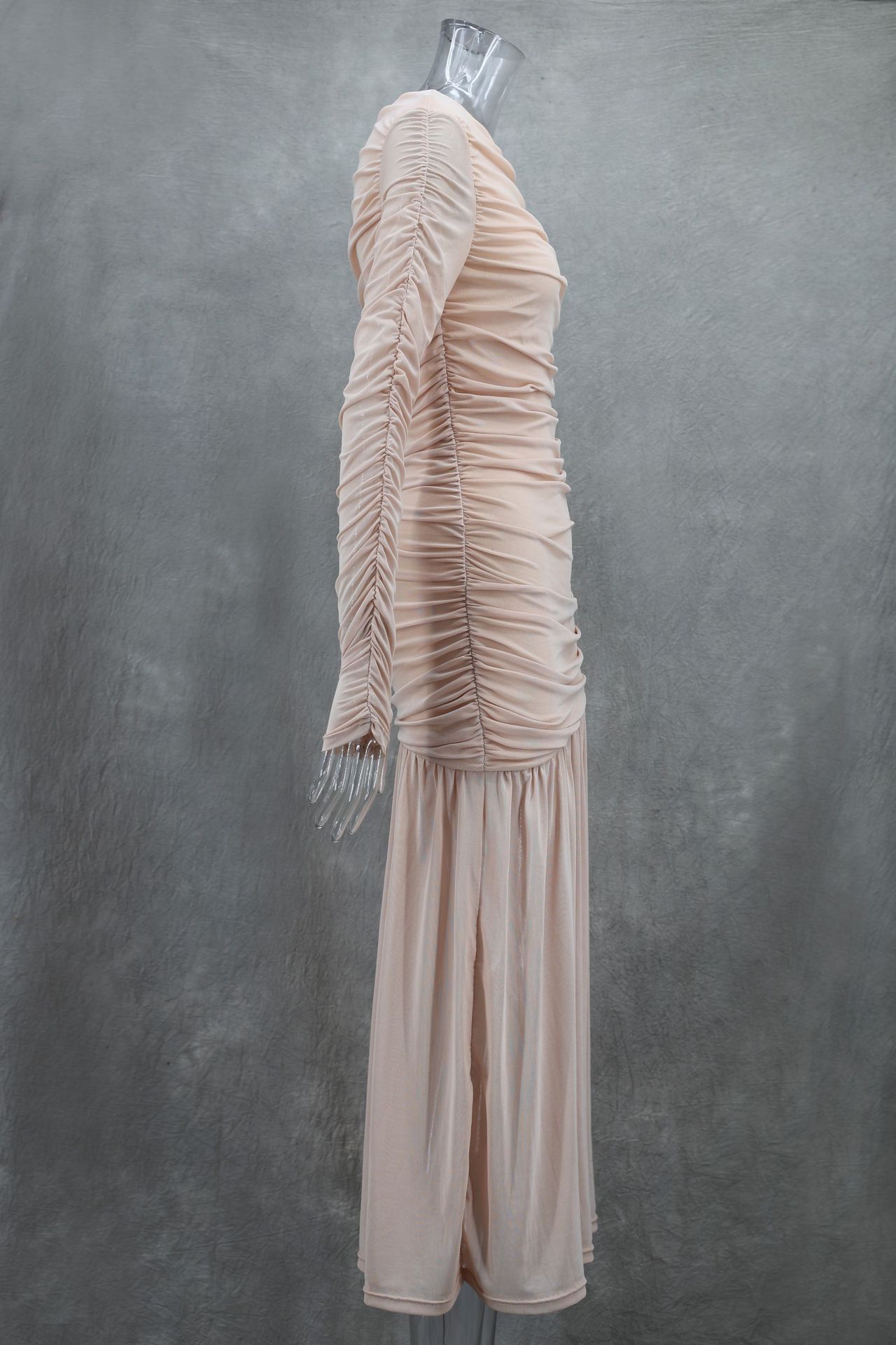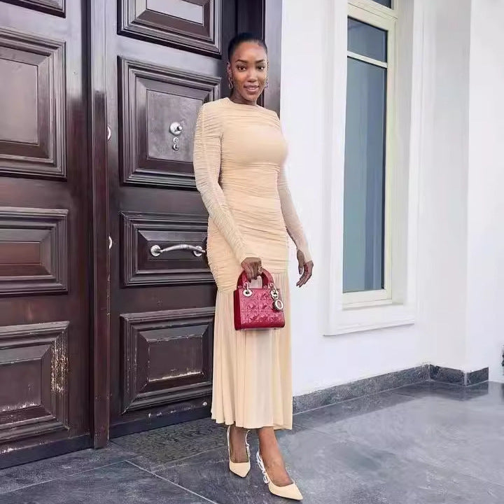 Elegant round Neck Long Sleeve Slim Fit Slimming Pleated Solid Color Maxi