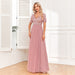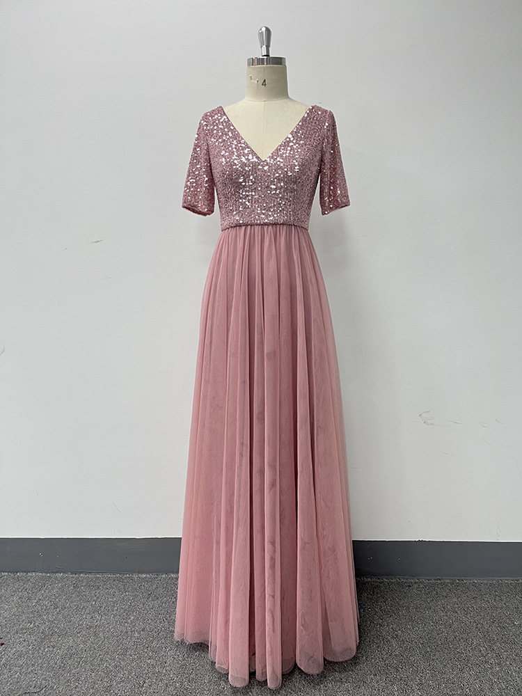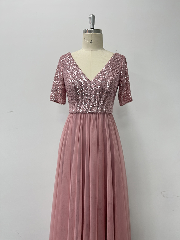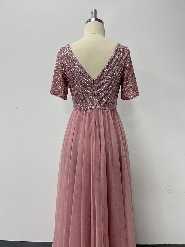 Elegant Short Sleeve Stitching Double V Neck A Line Tulle Evening Dress A Swing Sequined Dress
