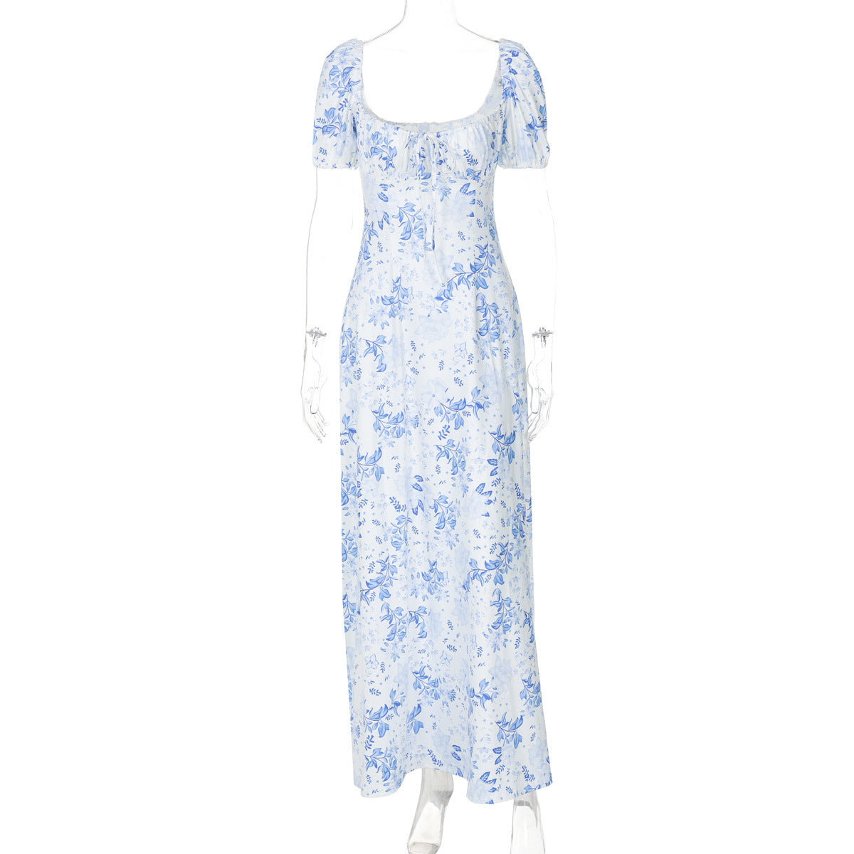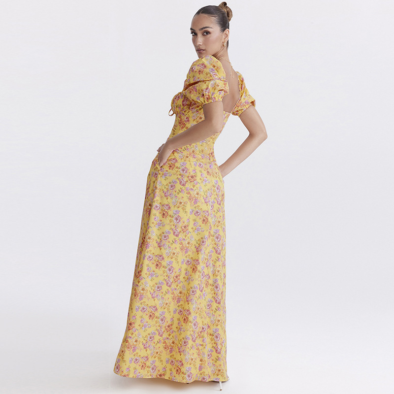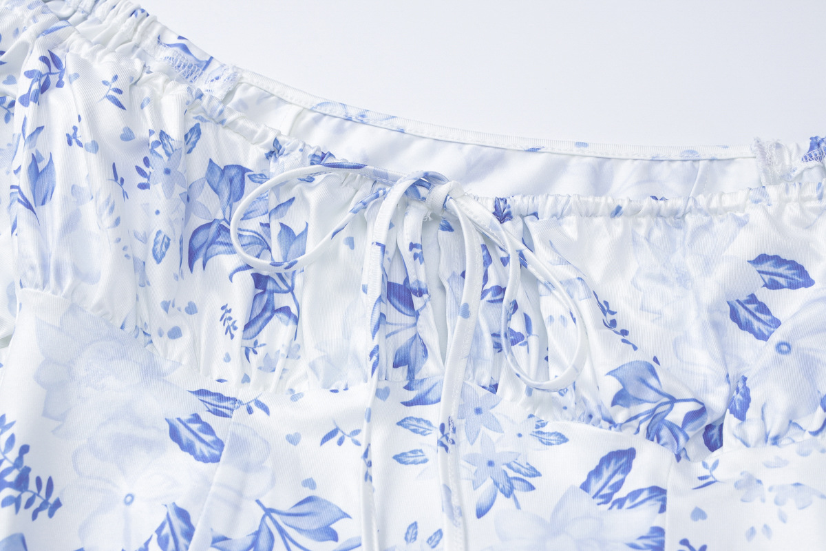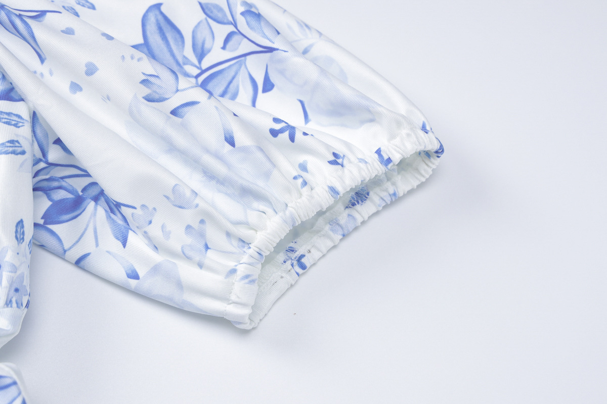 Fall Square Collar Puff Sleeve Floral Tie Neck