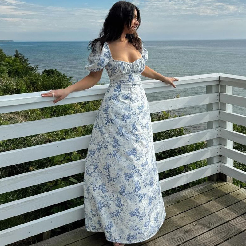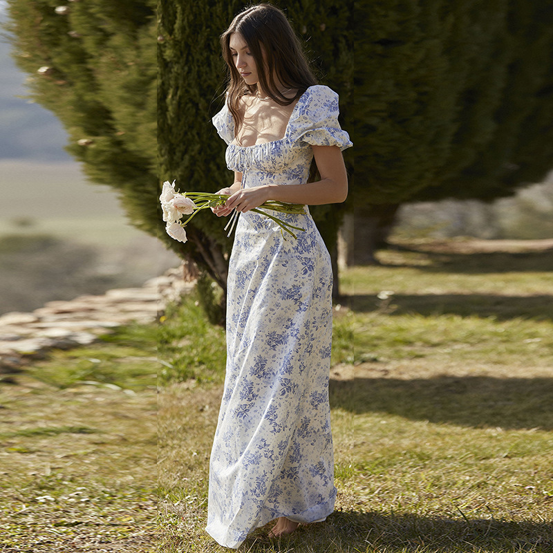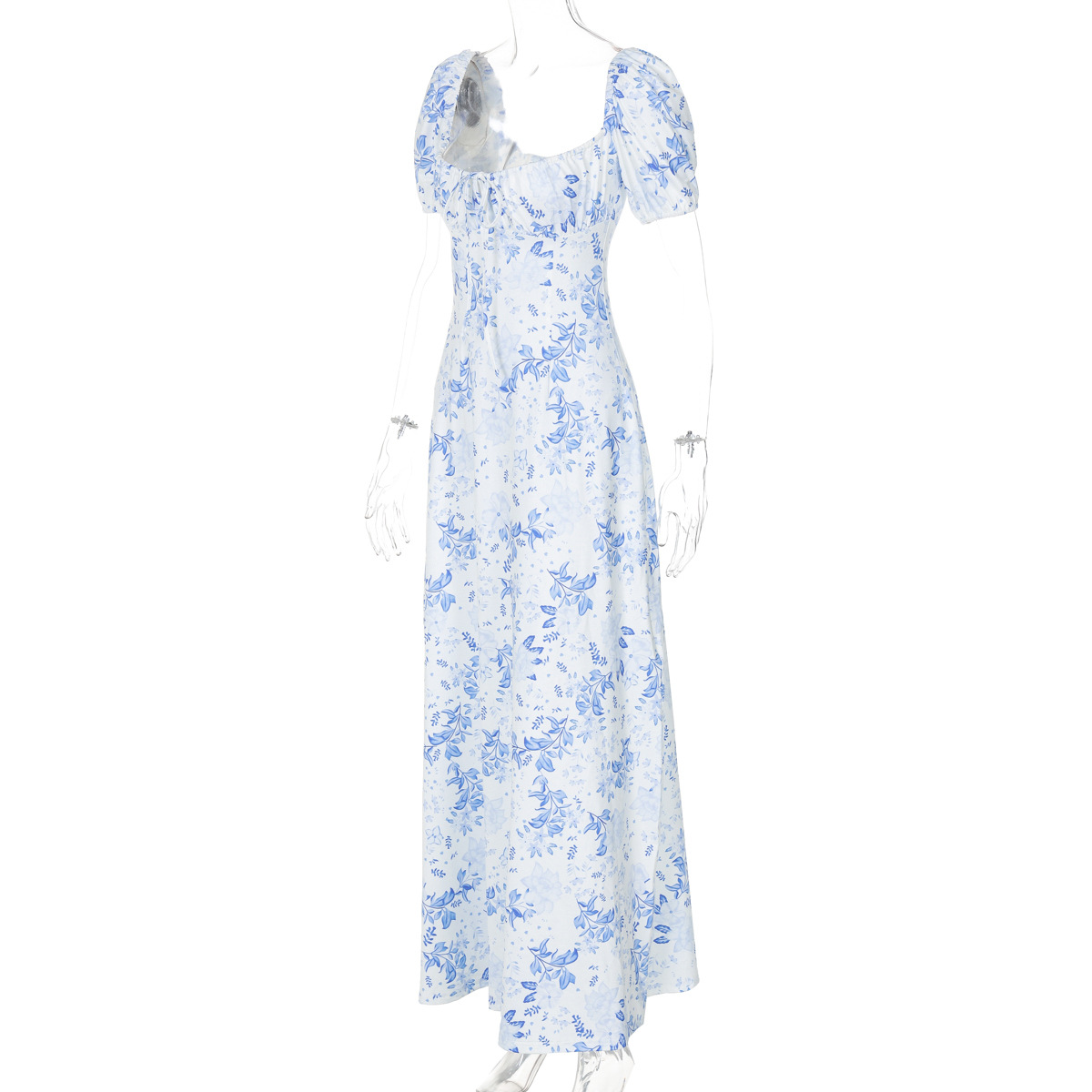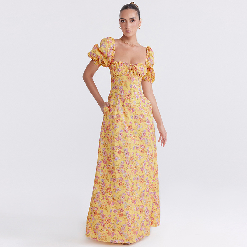 Fall Square Collar Puff Sleeve Floral Tie Neck