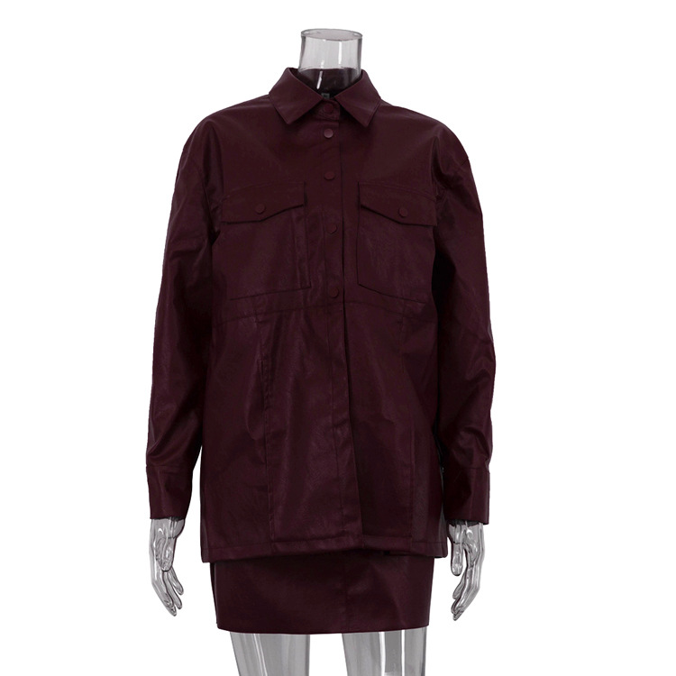 Faux Leather Vintage Dress Set Design Collared Long Sleeve Cardigan Short Sling Dress Two Piece Sets