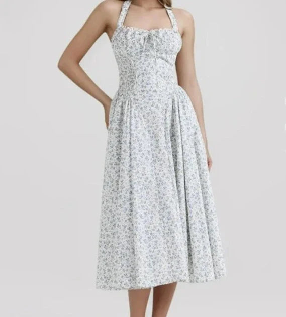 Floral Bow Halter Neck Lacing Up Midi Dress