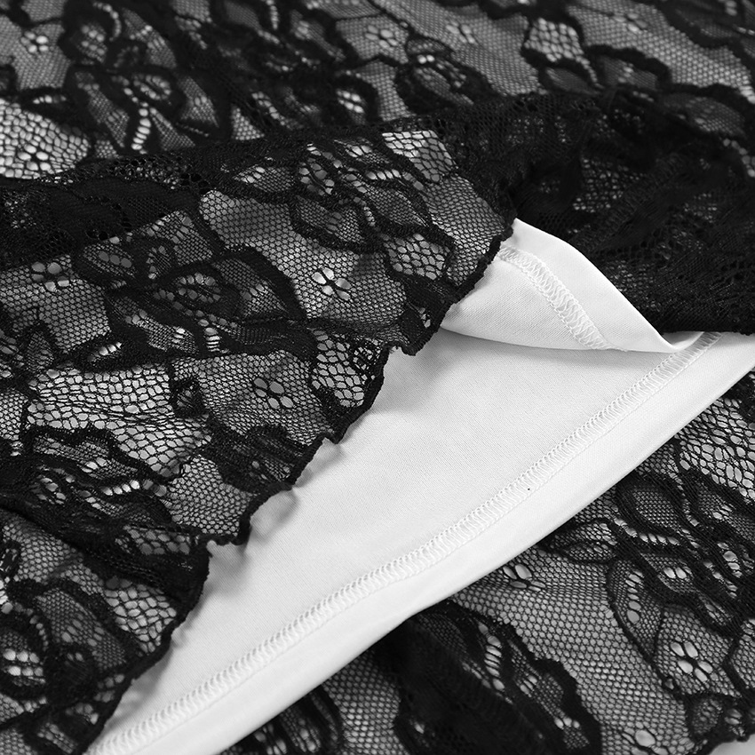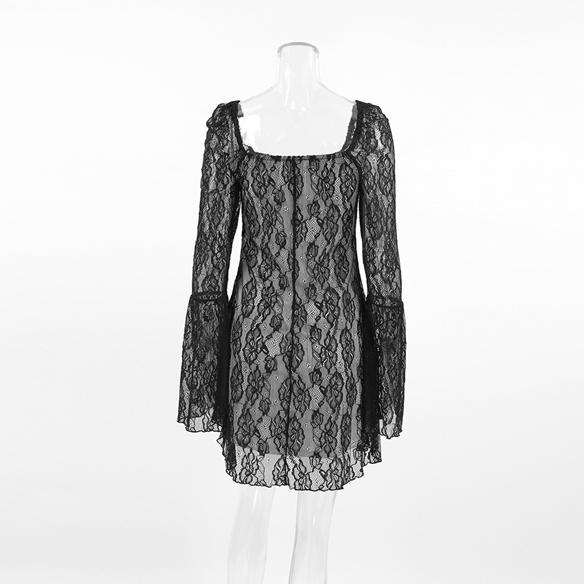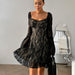 French Black Design Lace Hollow Out Cutout out Elegant Square Collar Puff Sleeve Slim Fit Tied