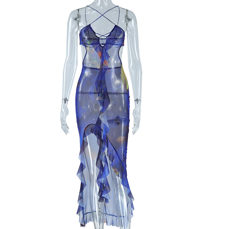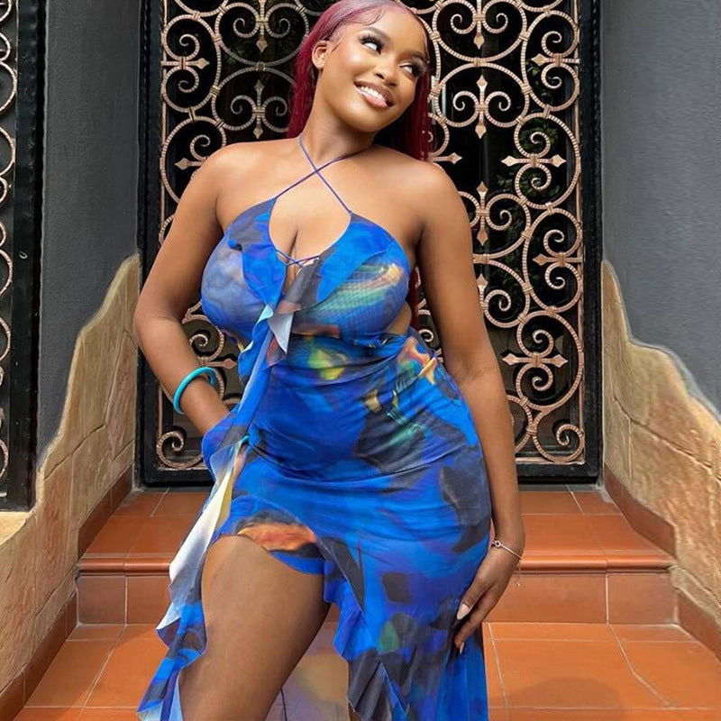Halter Dress Sleeveless Printed Cut out Ruffled Mid Waist Pullover Asymmetric