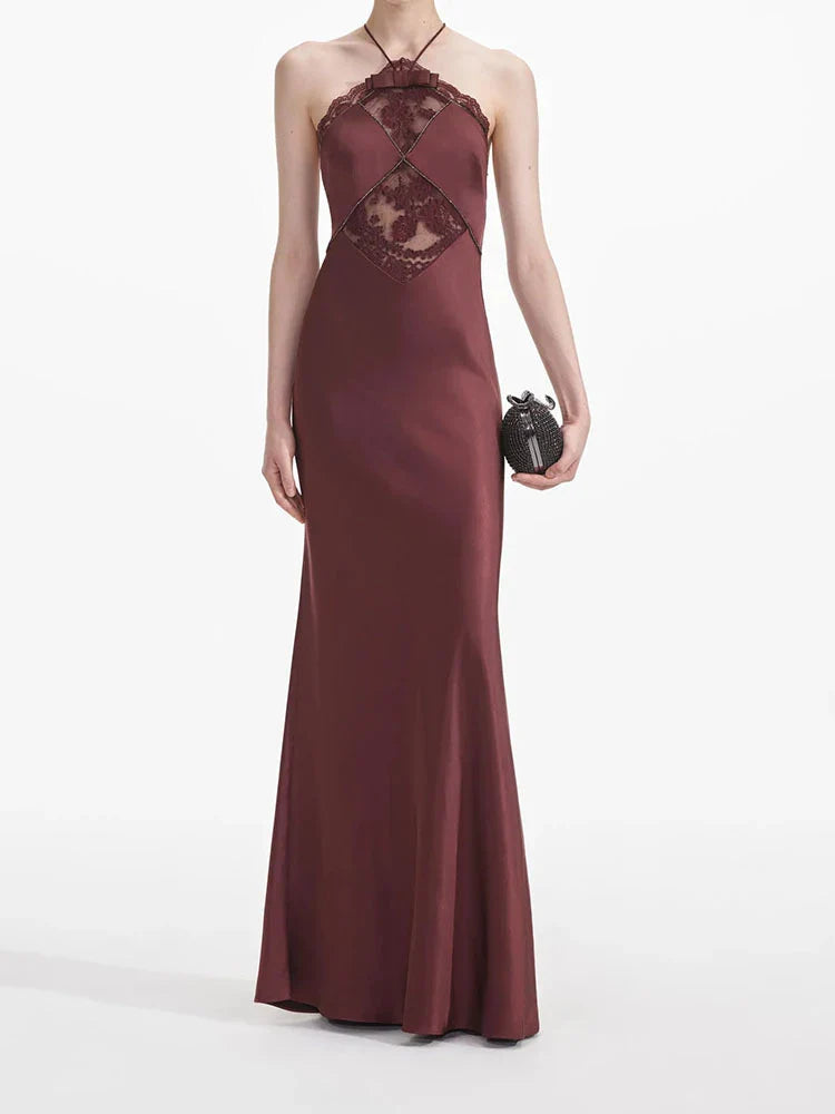 Halter Neck Bowknot Lace Patchwork Long Dress