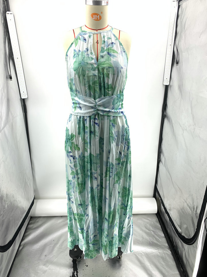 Halter Sleeveless V Neck Printed Large Swing Maxi Dress