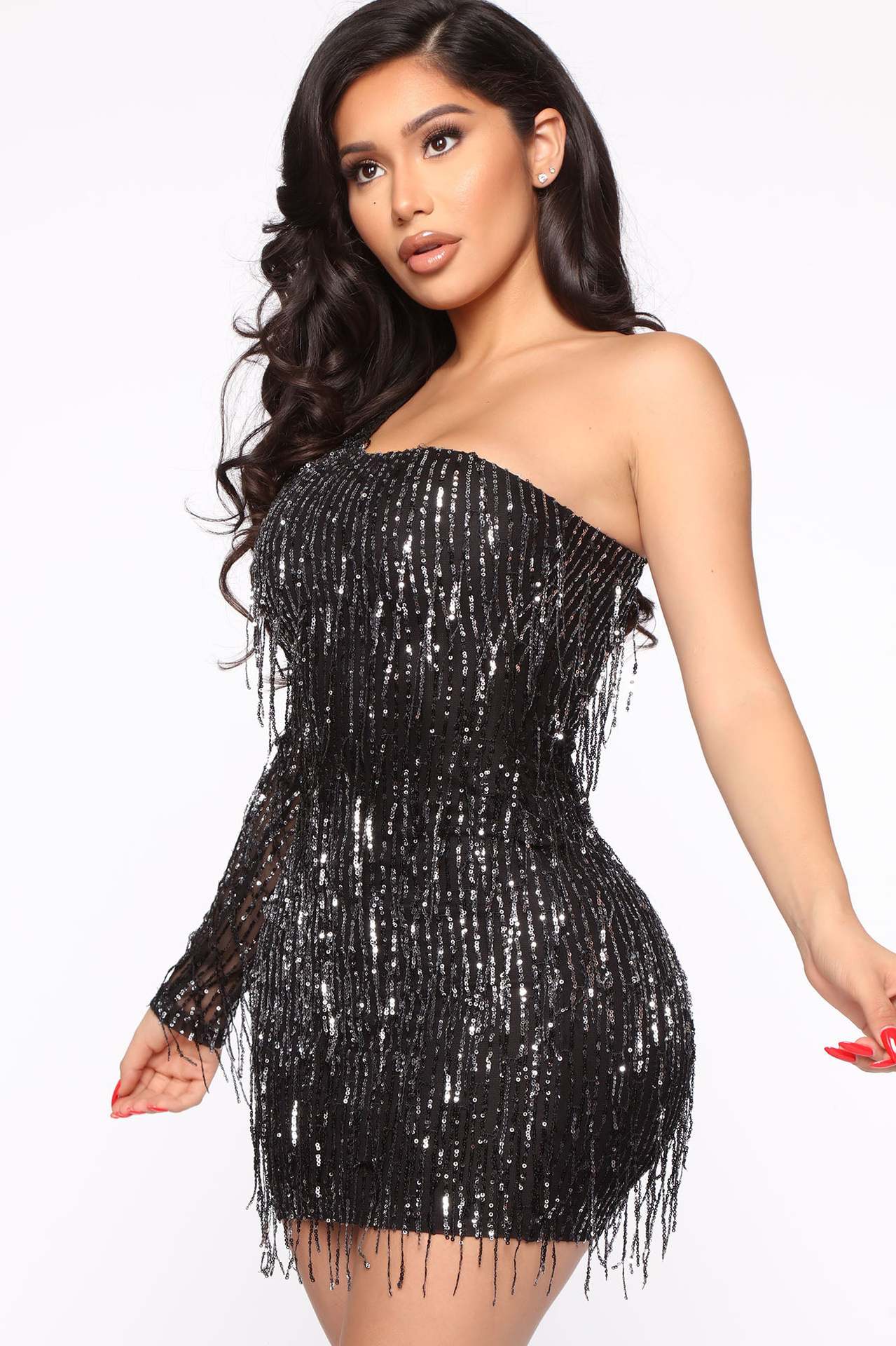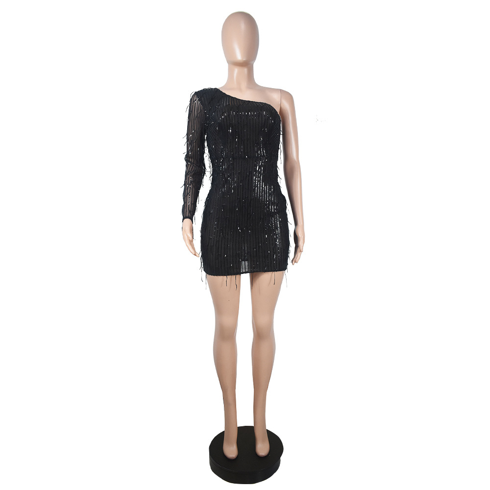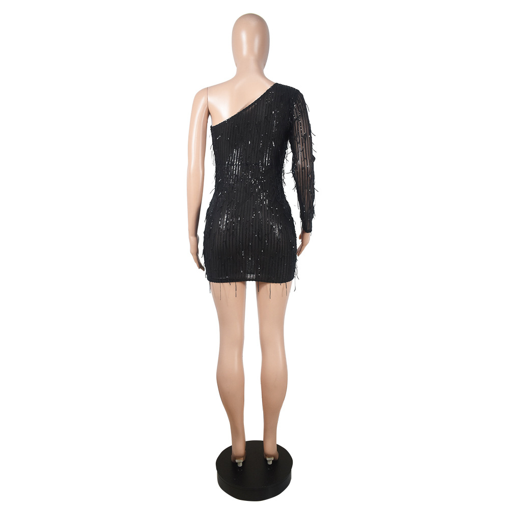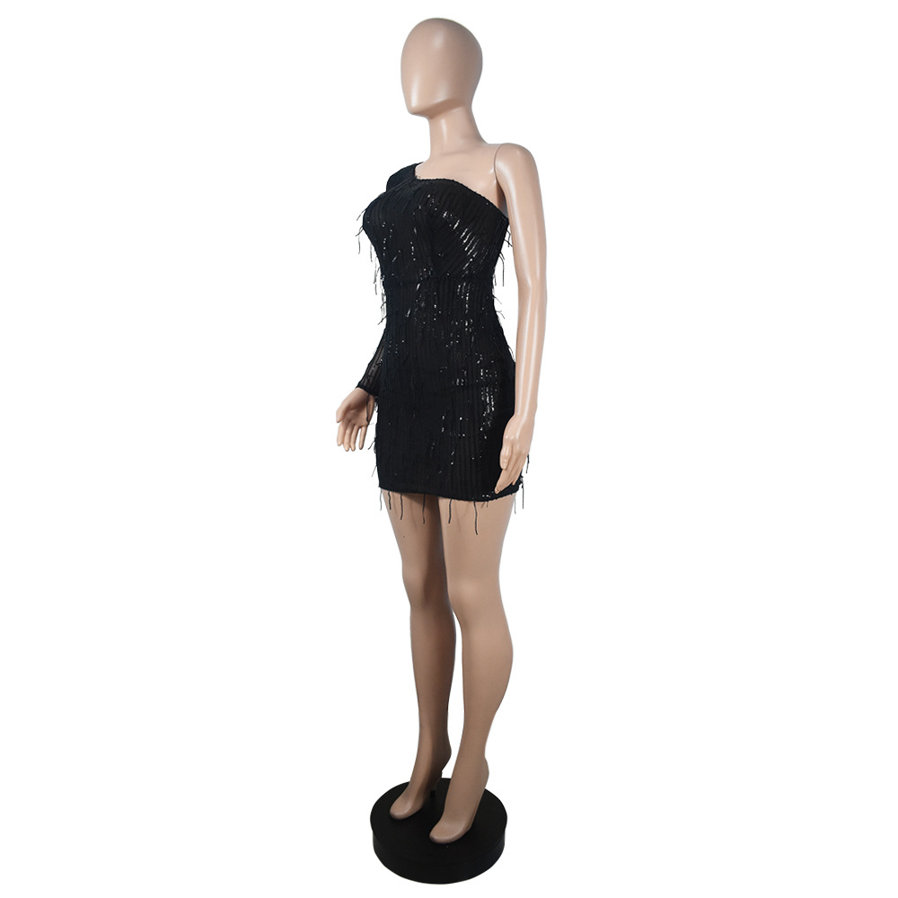 Hip Unilateral Long Sleeve Sequined Tassel Party Nightclub