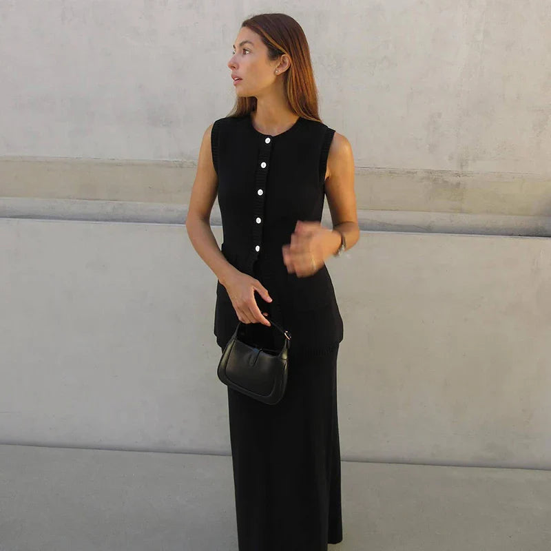 Knitted Sleeveless Top Slit High Waist Long Skirt Suit