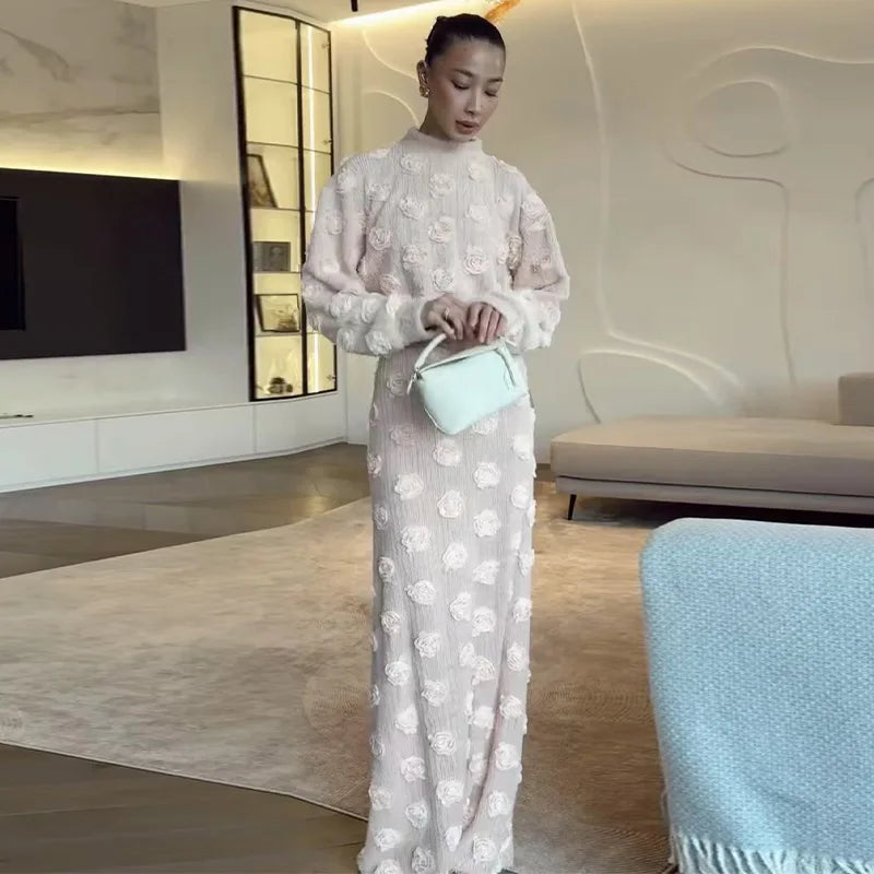 Knitting 3D Flower Lantern Sleeve Top and Long Skirt Suit