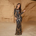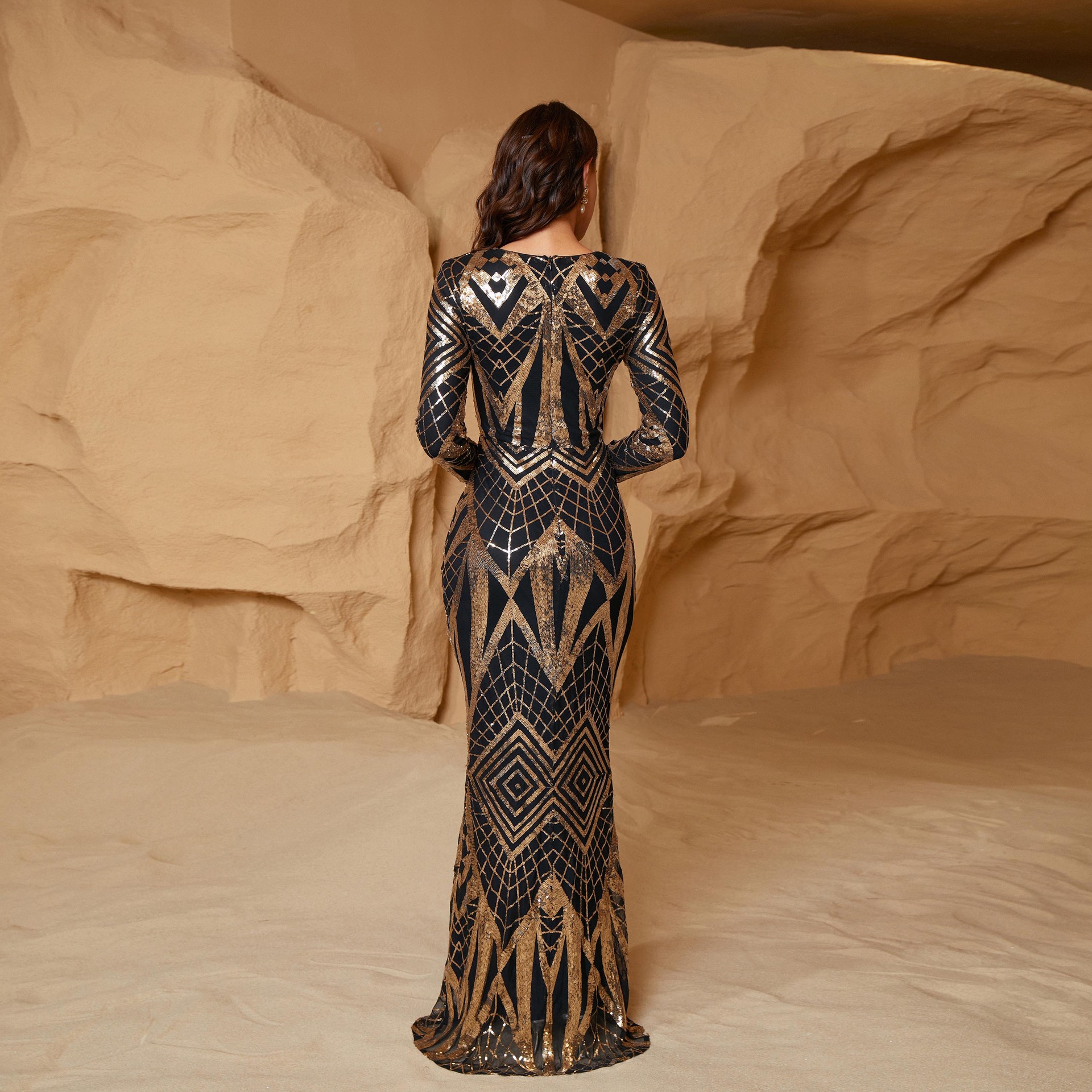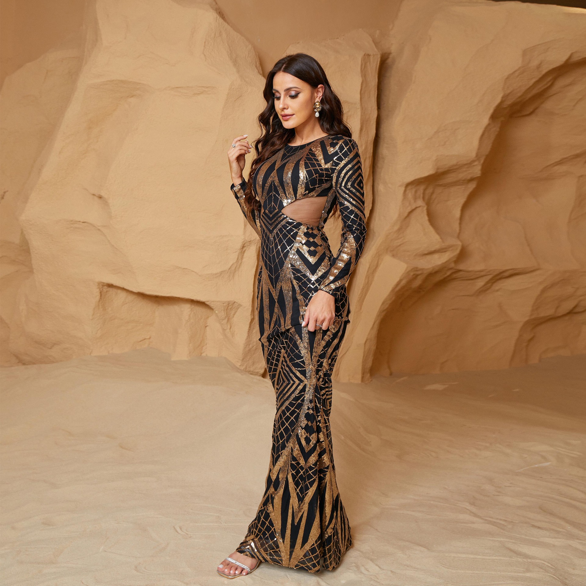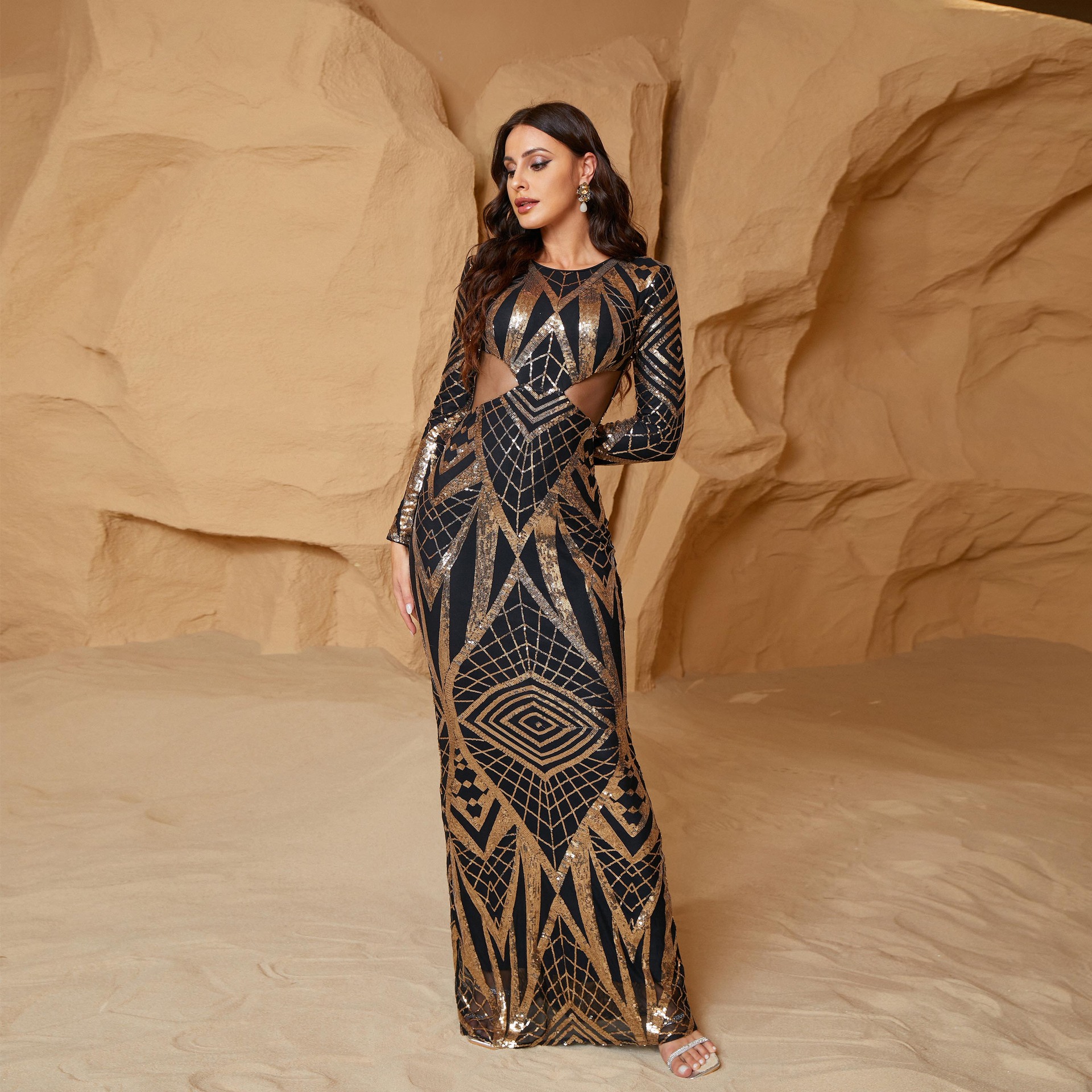 Long Sleeve Crew Neck Slim Long Sequined Cocktail Evening Dress Bridesmaid