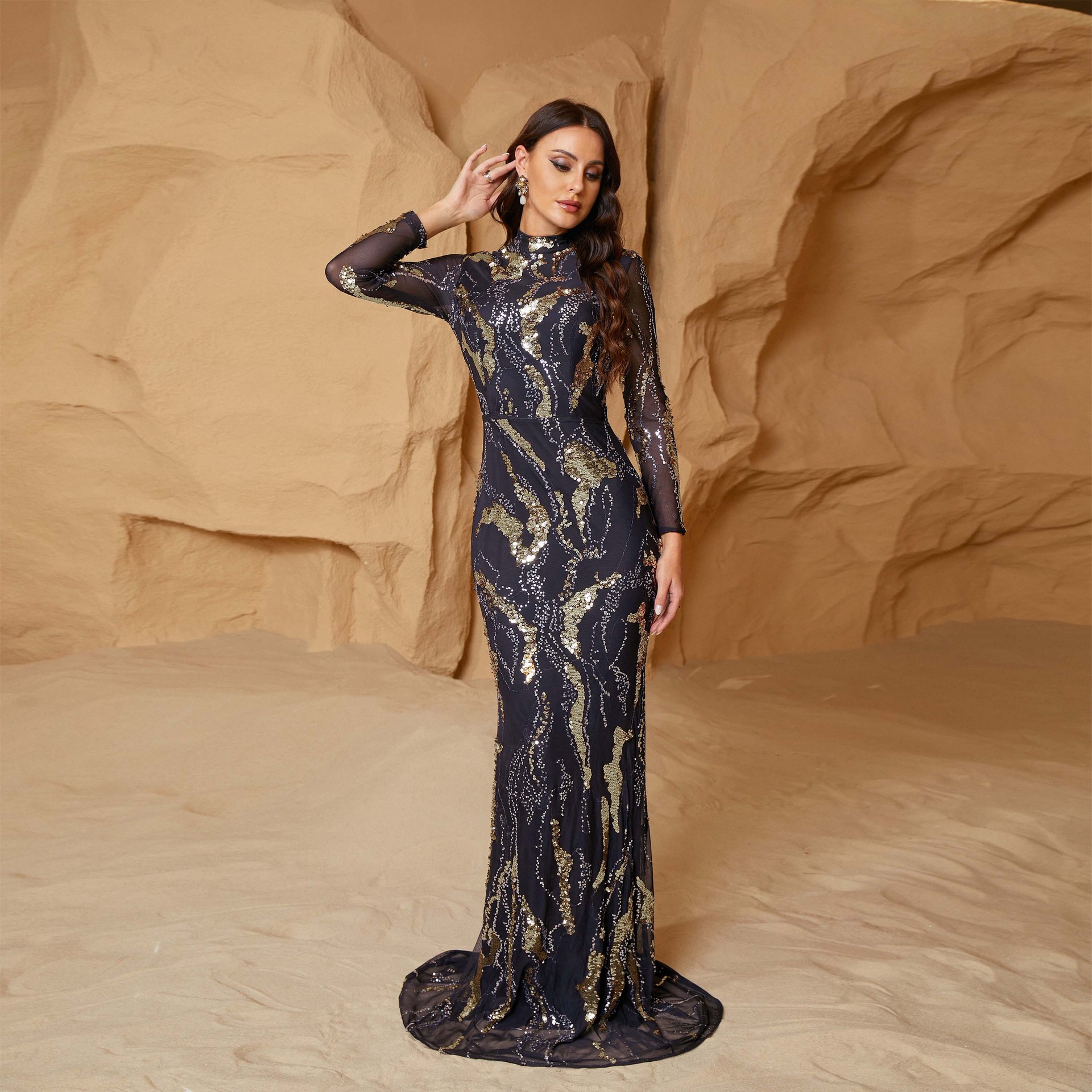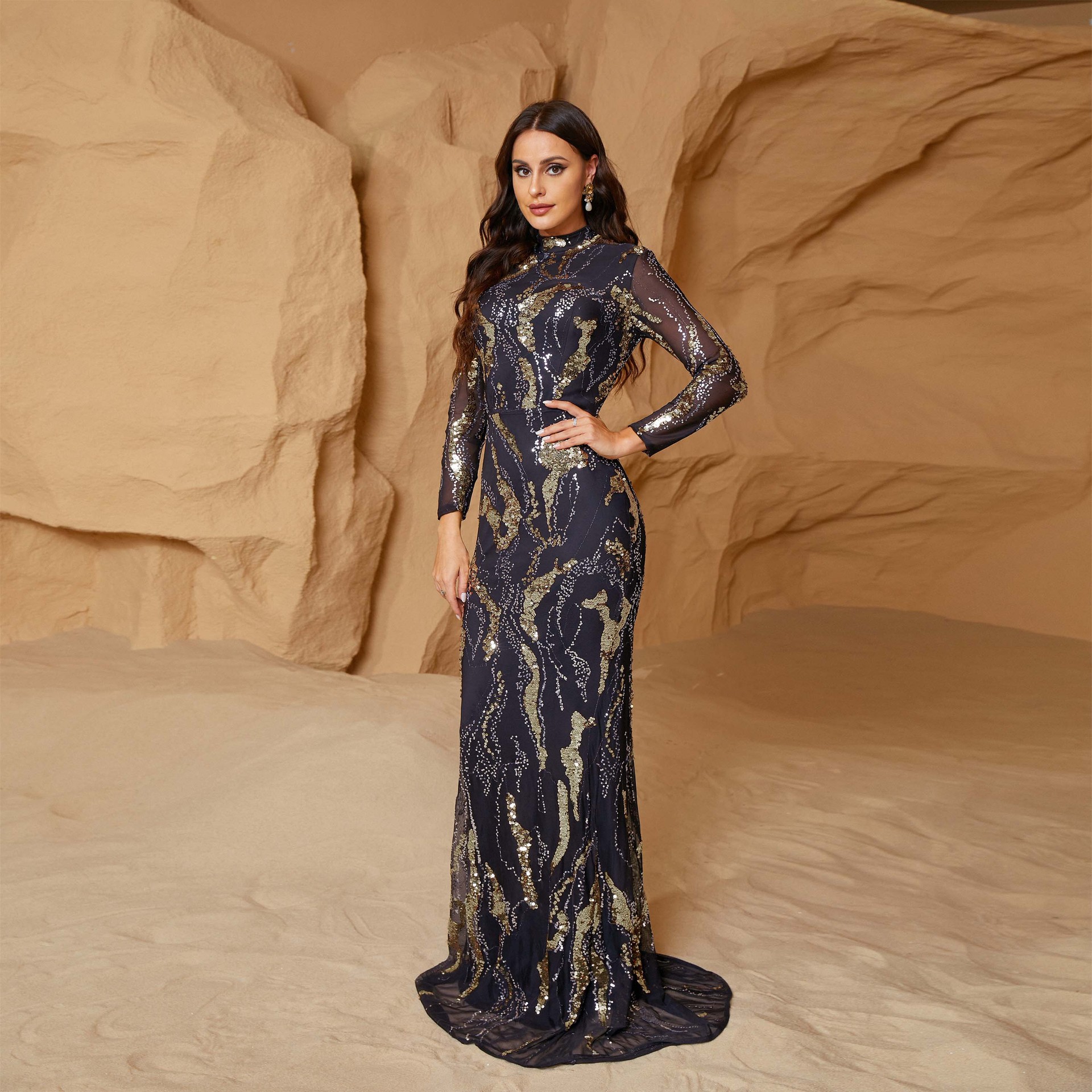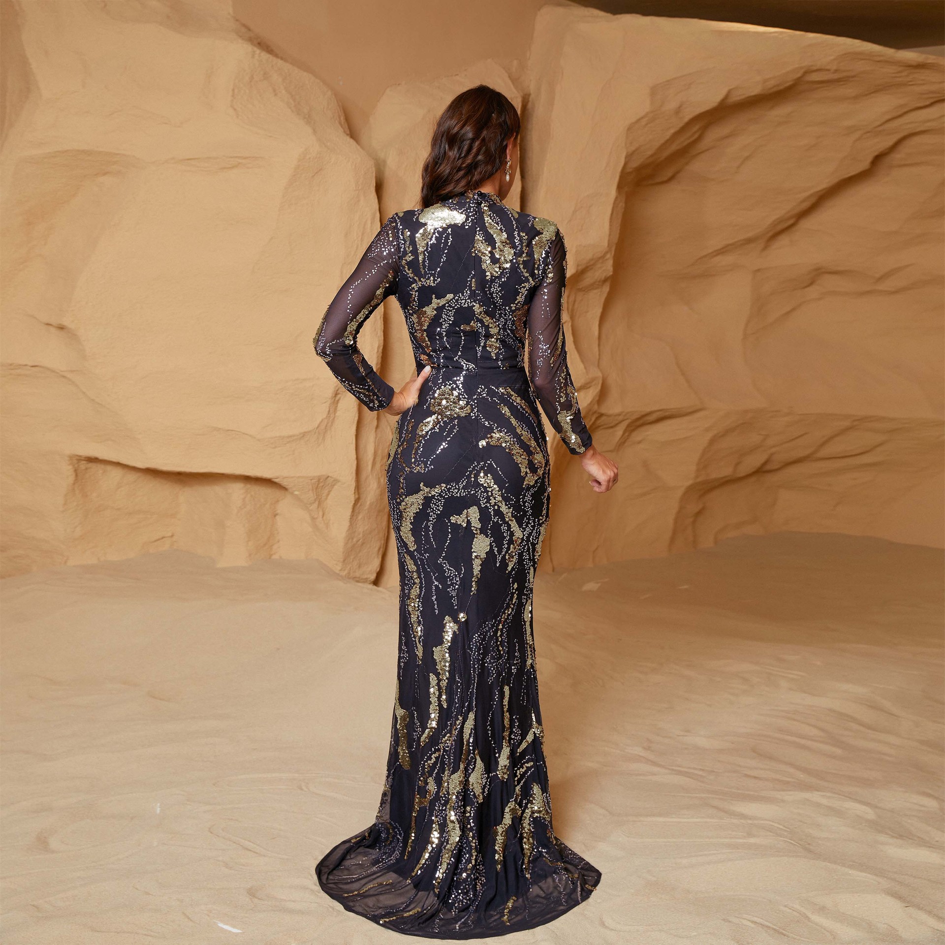Long Sleeve Crew Neck Slim Long Sequined Cocktail Evening Dress Bridesmaid