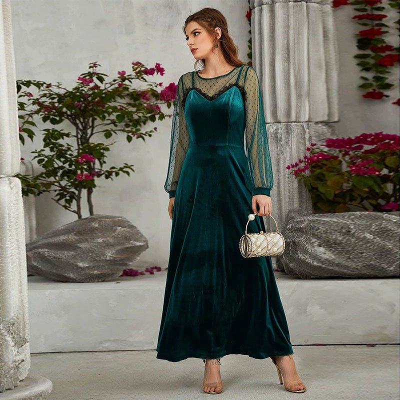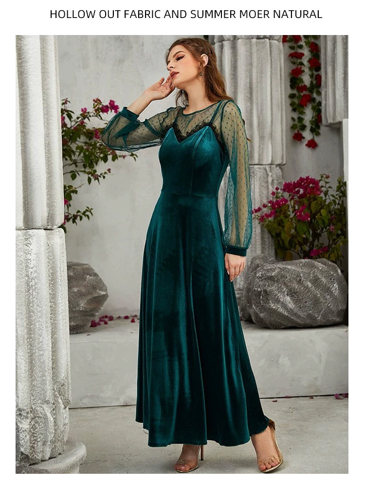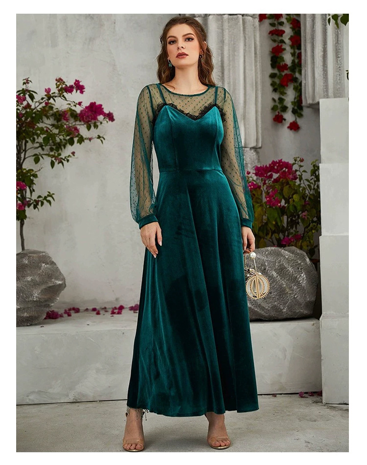 Long Sleeve round Collar Gauze Lace Velvet Cami Dress