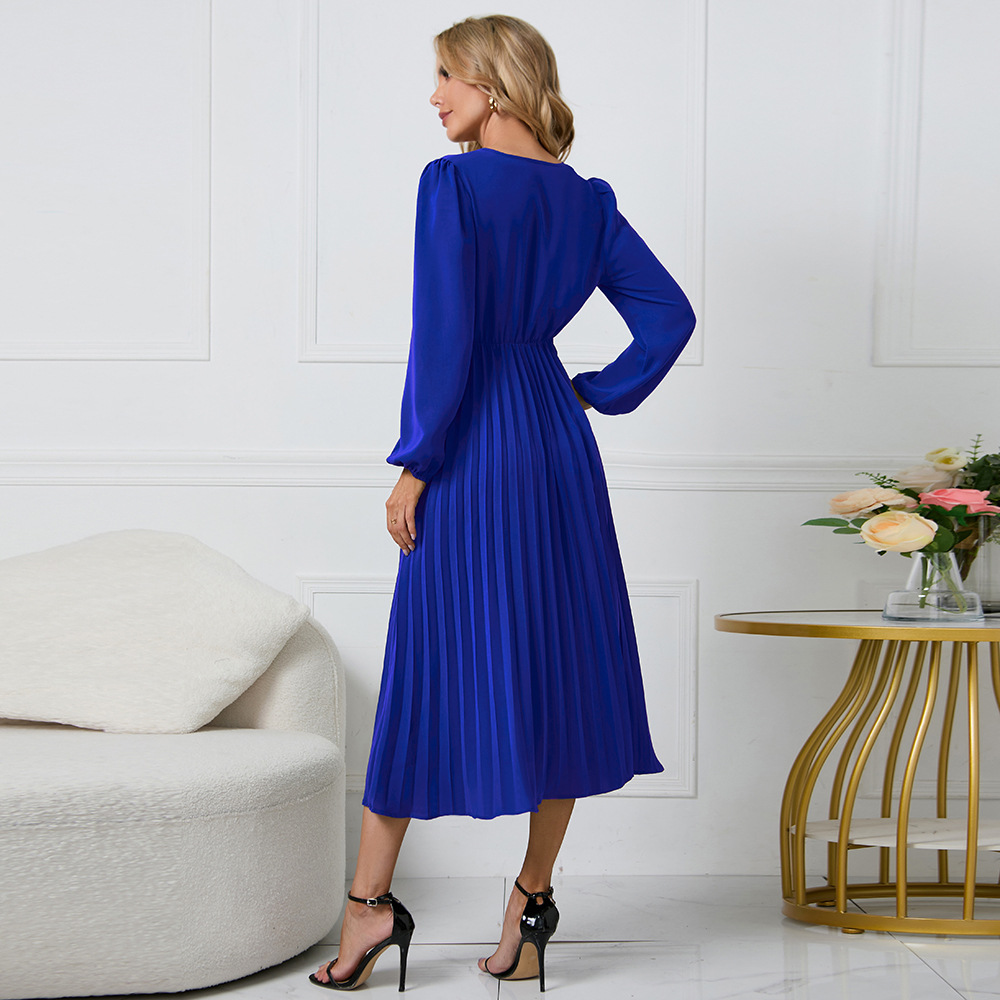 Long Sleeve Slim Fit Pleated Belt V neck Dress A line Dress