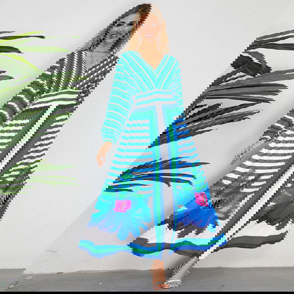 Long Sleeve V Neck Swing A Line Printed Dress Slim Retro Maxi Dress