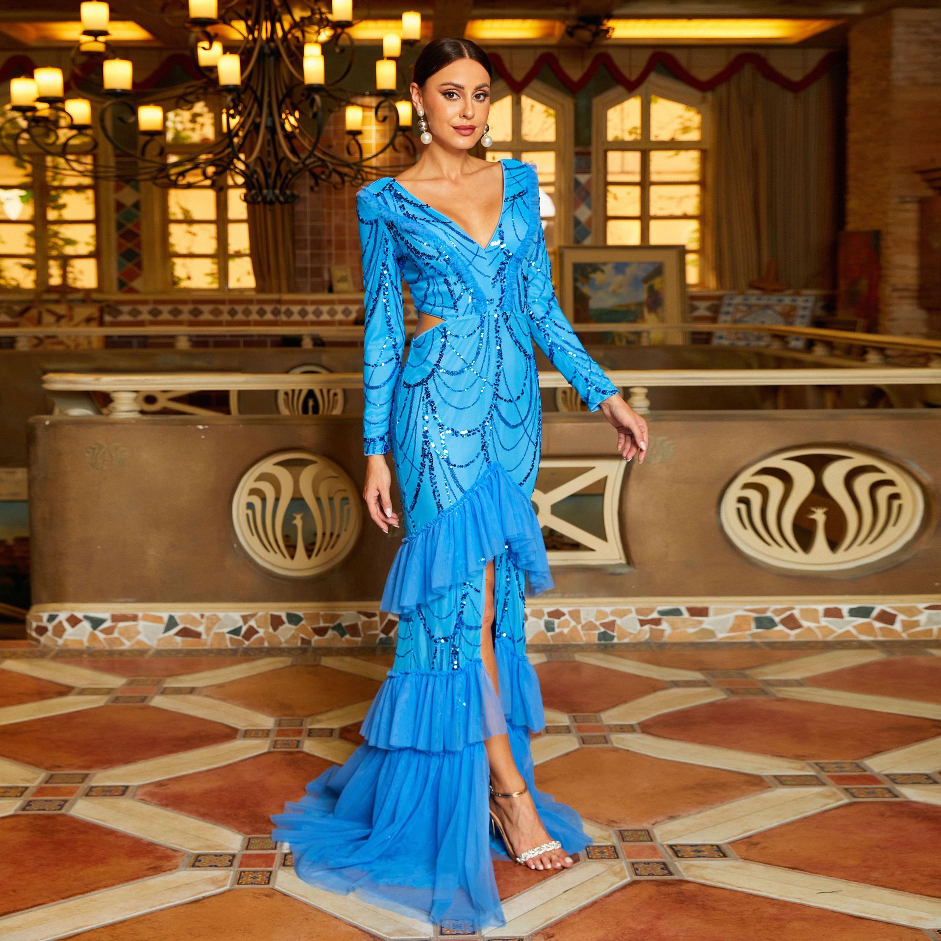 Long Sleeved Elegant V neck Long Sequined Split Cocktail Evening Dress Bridesmaid Dress for