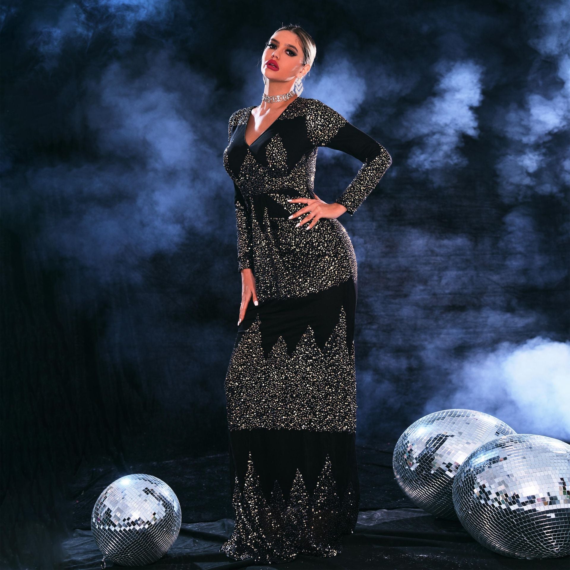 Long Sleeved Elegant V Neck Slim Fit Long Sequined Cocktail Evening Dress Bridesmaid Dress