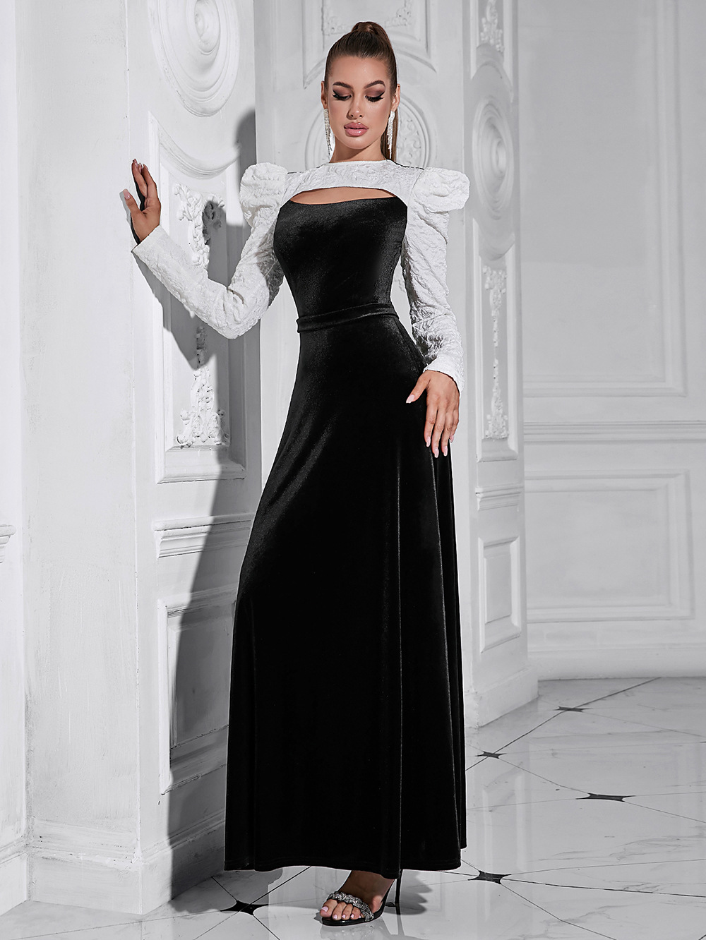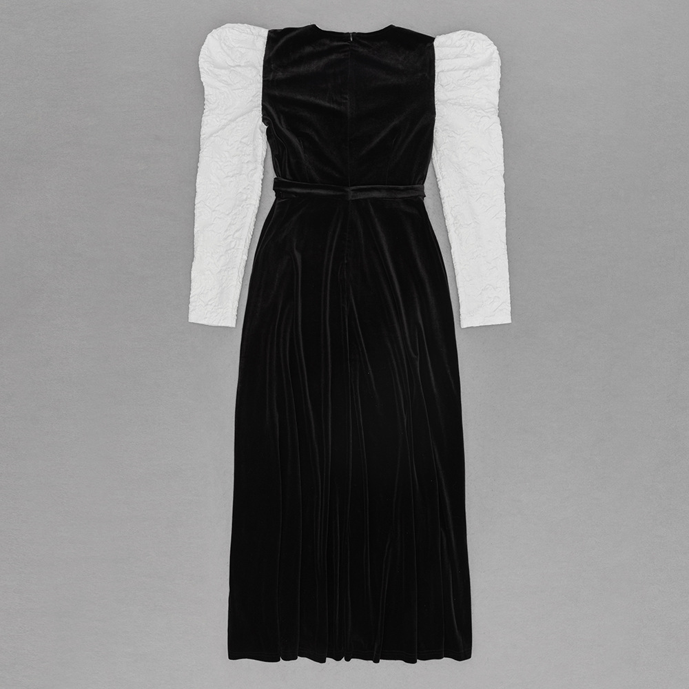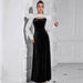 Long Sleeved Evening Dress Stitching Contrast Color Hollow Out Cutout round Neck Slim Fit Maxi Dress