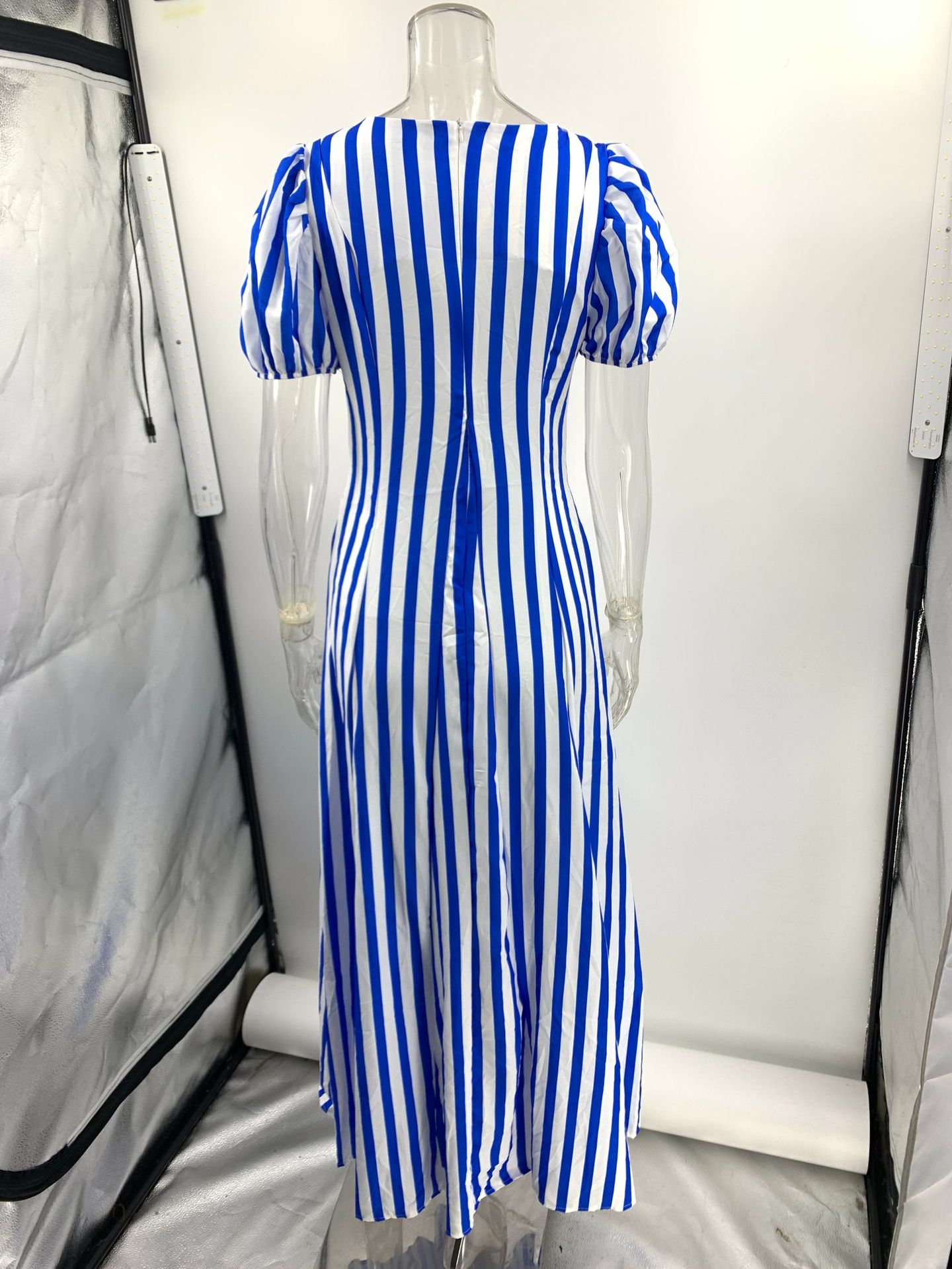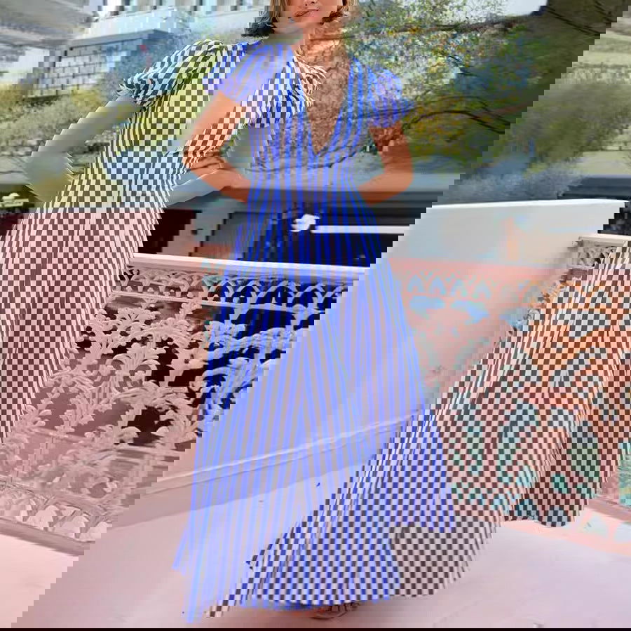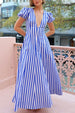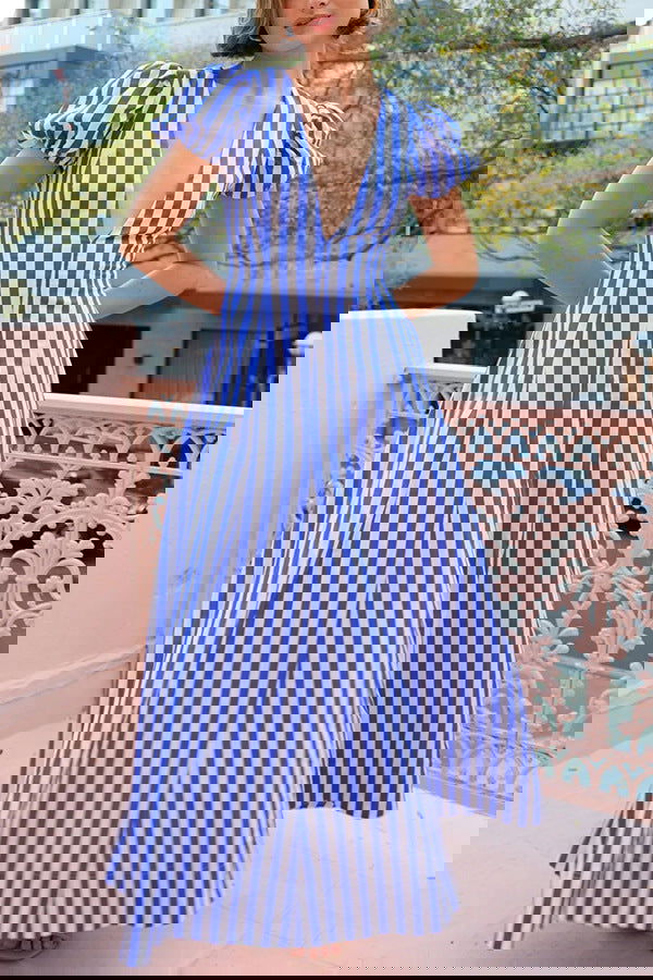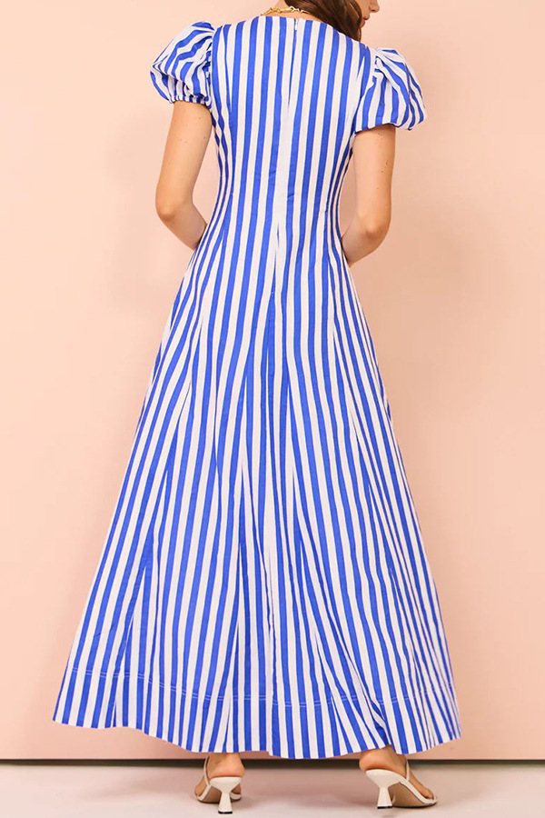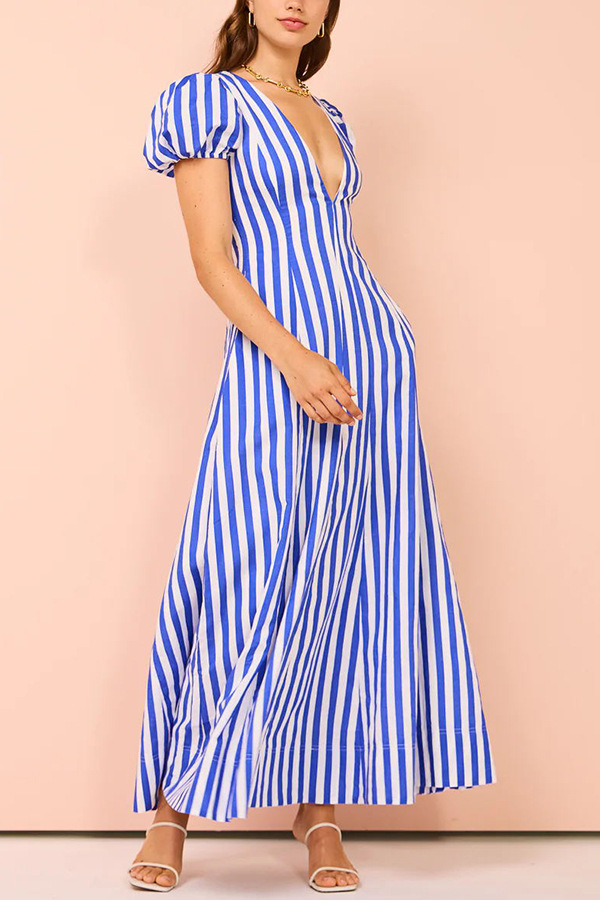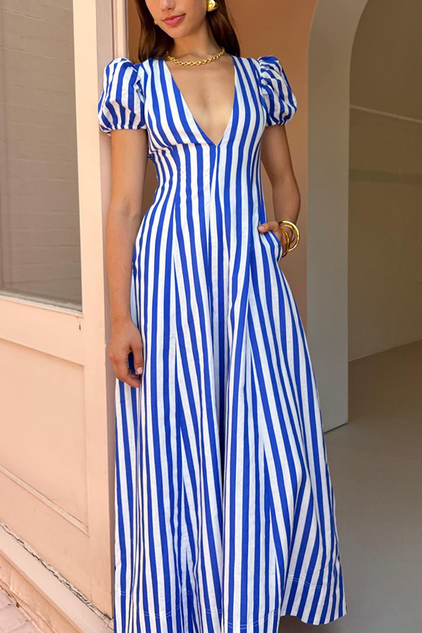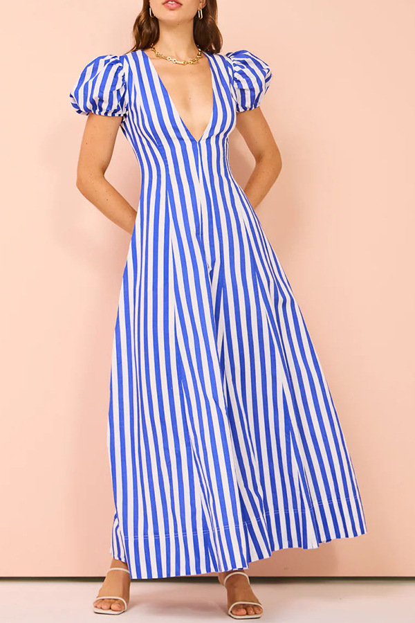 Low Cut V neck Striped Puff Sleeve Large Swing Dress