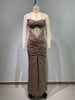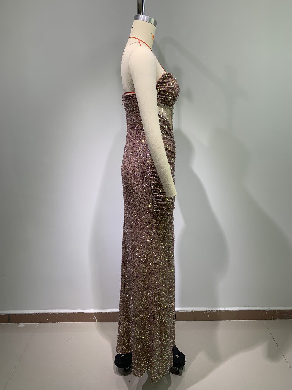 Luxury Heavy Embroidery Sequ Beaded Drill Chain Mesh Sleeveless Split Pleated Dress Elegant Dinner Gold Dress