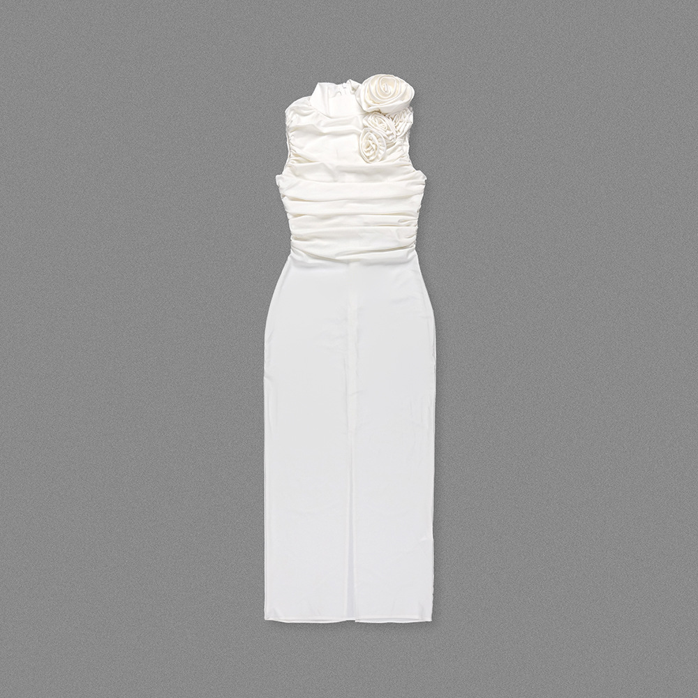 Maxi Dress Pleated Three Dimensional Floral Design Hip Split White Dress