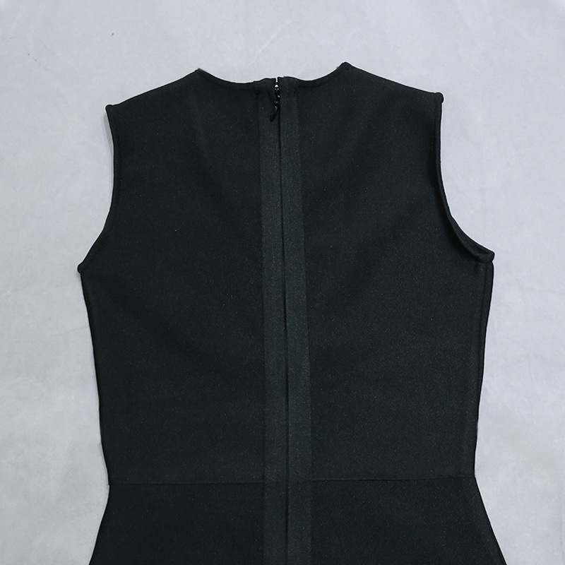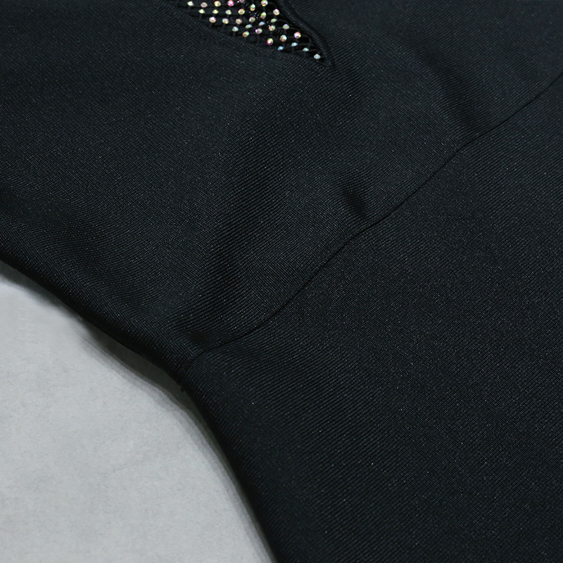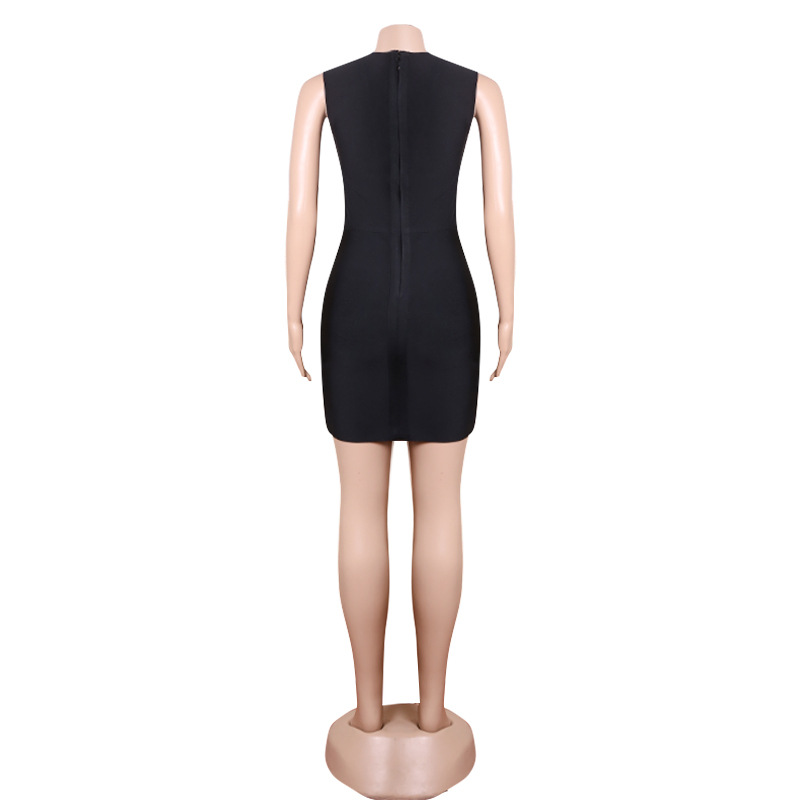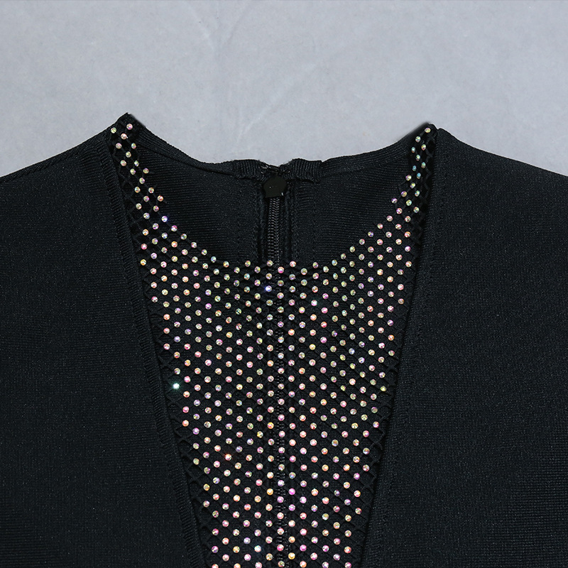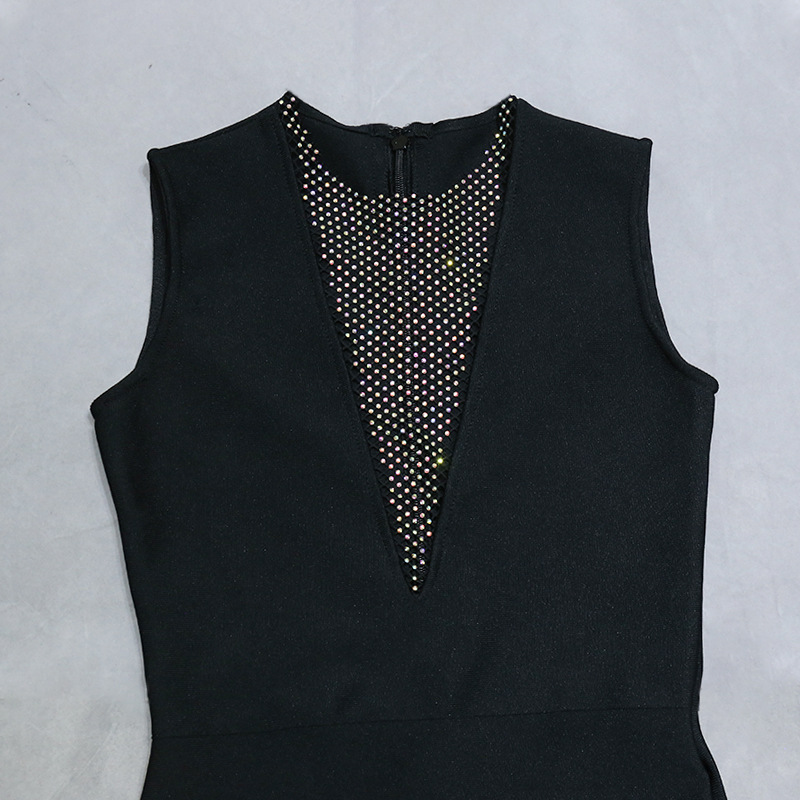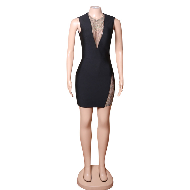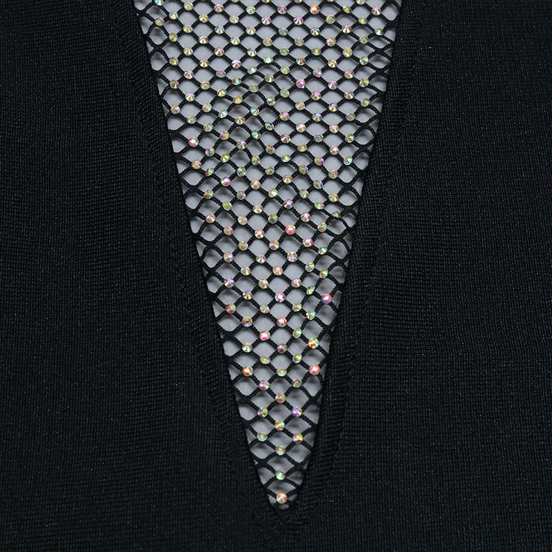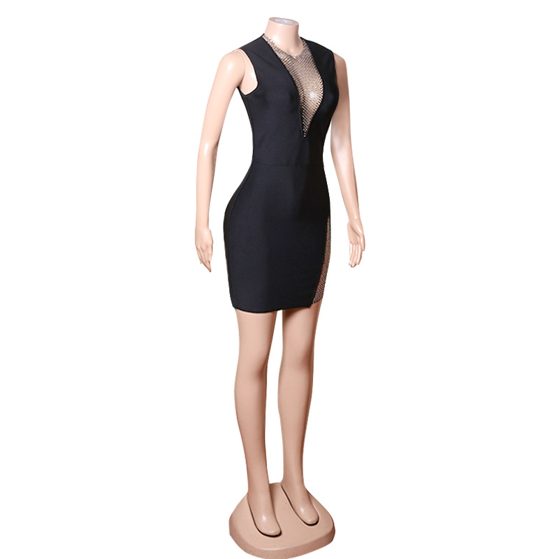 Nightclub Mesh Diamond Hollow Out Cutout Fishing Net Deep V Plunge Sleeveless Dress Flash Diamond Sheath Small Black Dress