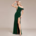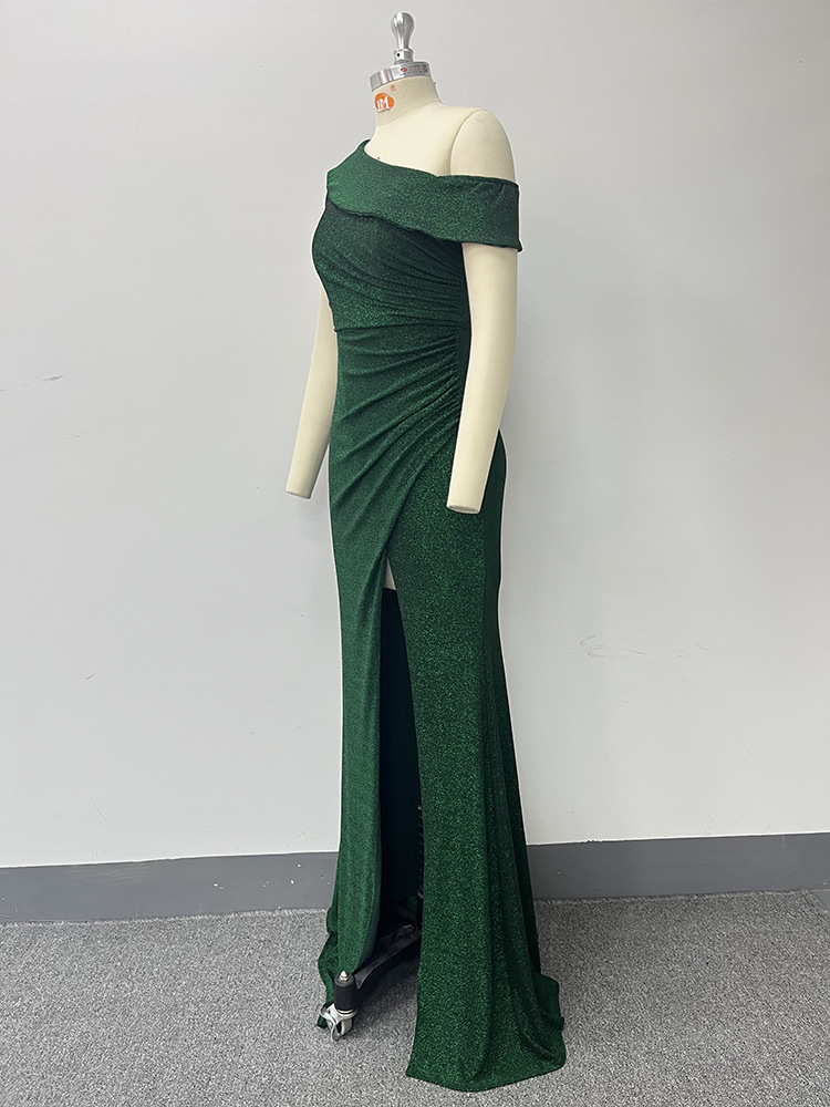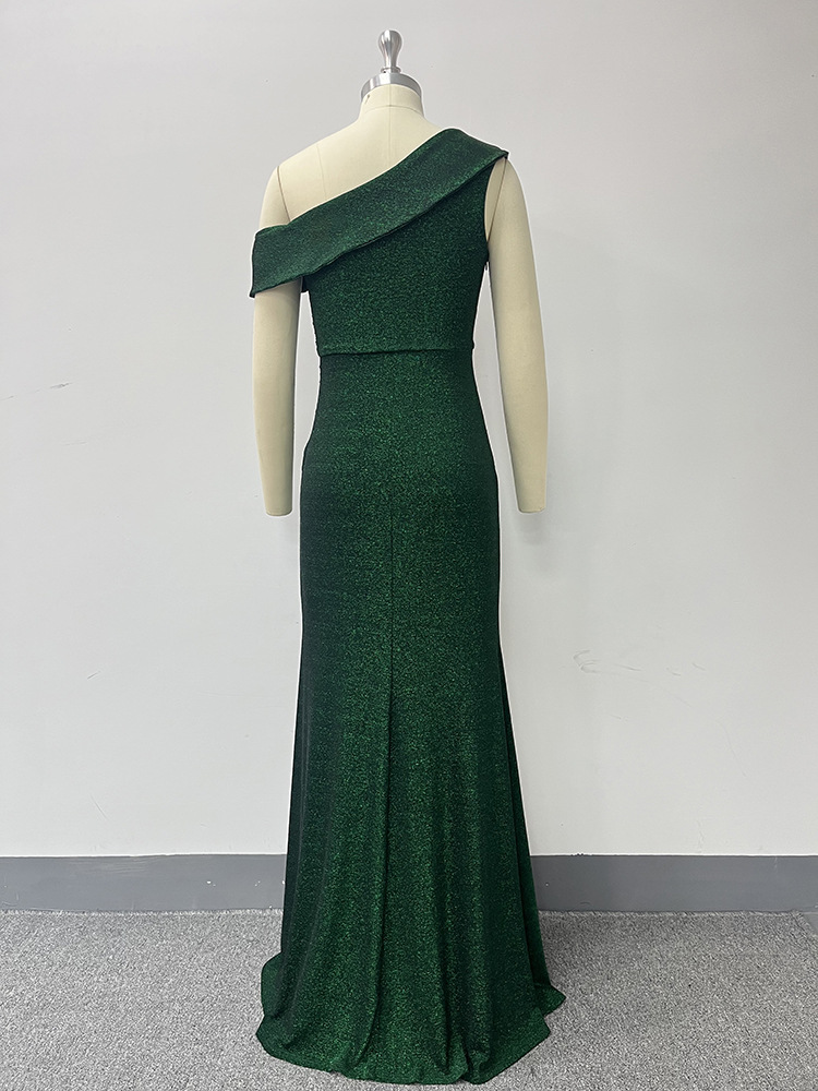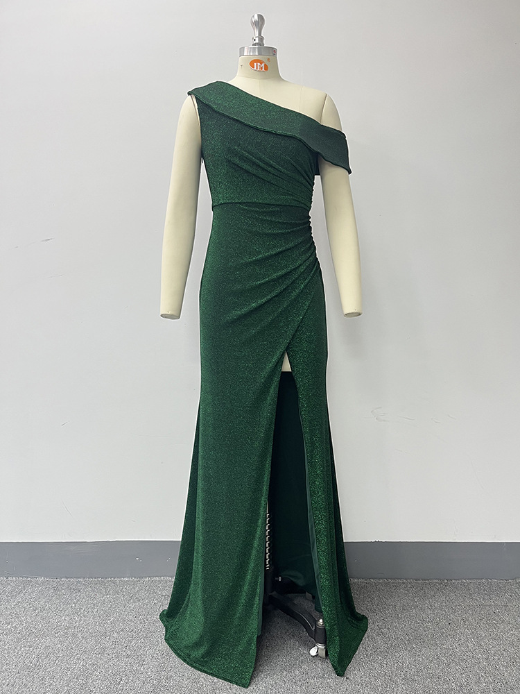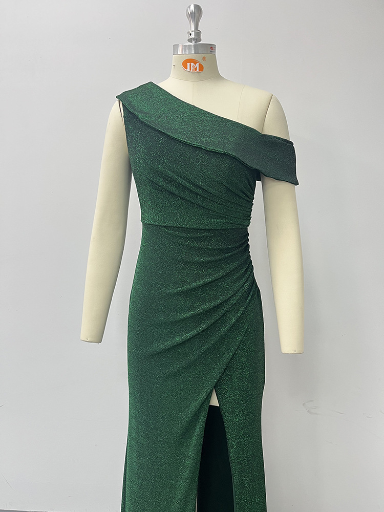Oblique Shoulder Pleated Back Zipper Full Lining High Slit Shiny Bright Dress Straight H Shaped Knitted Jumpsuit