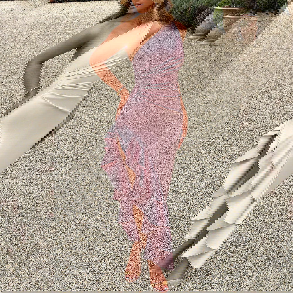 Oblique Shoulder Sleeveless Hip Backless High Slit Slim Fit Dress