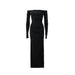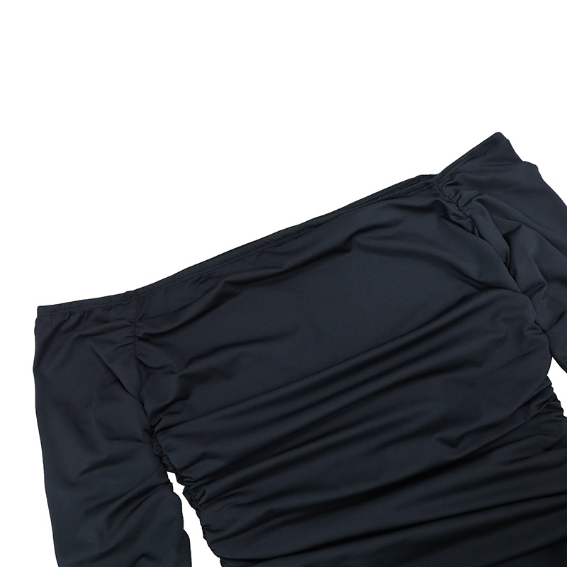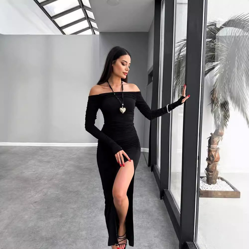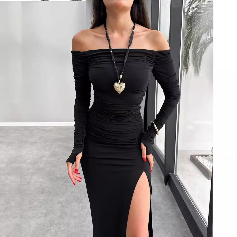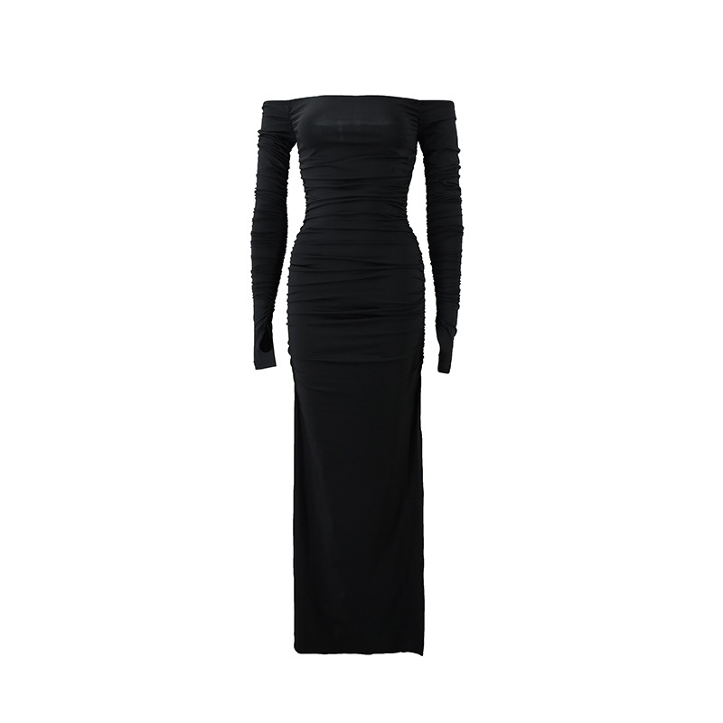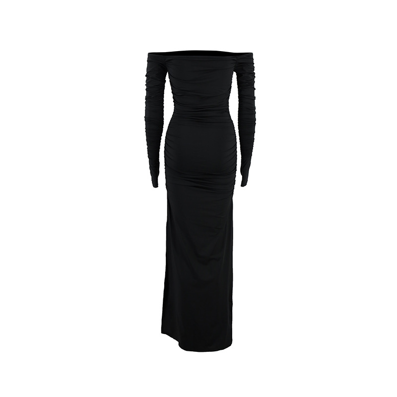 off Neck Backless Pleated Long Sleeve Narrow Split Dress