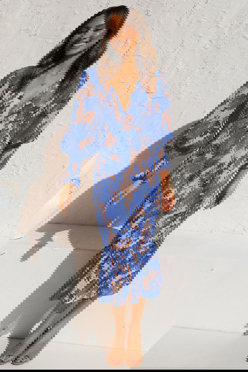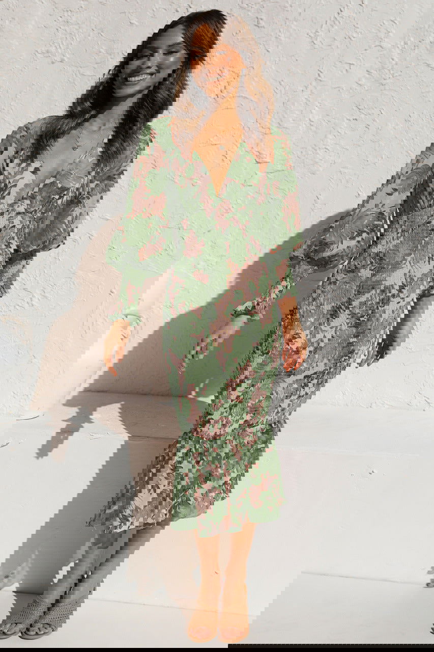 Office Elastic Waist Long Sleeve V neck Printed Flounced Dress