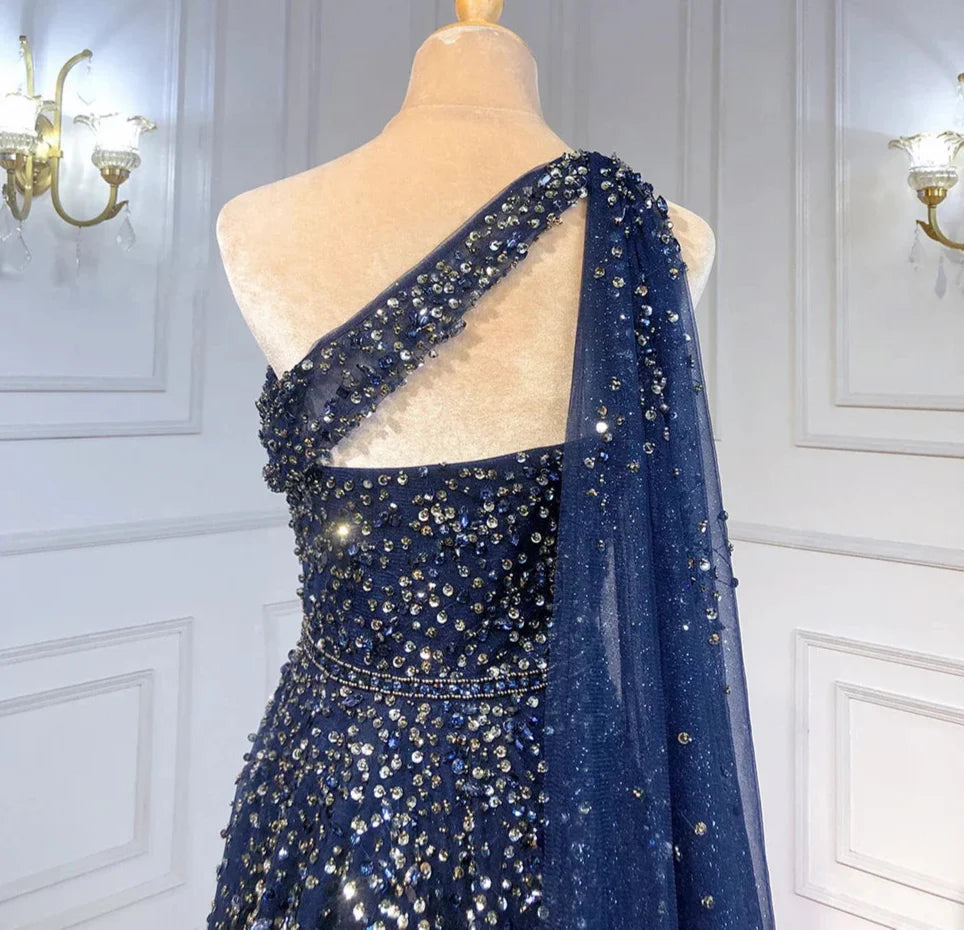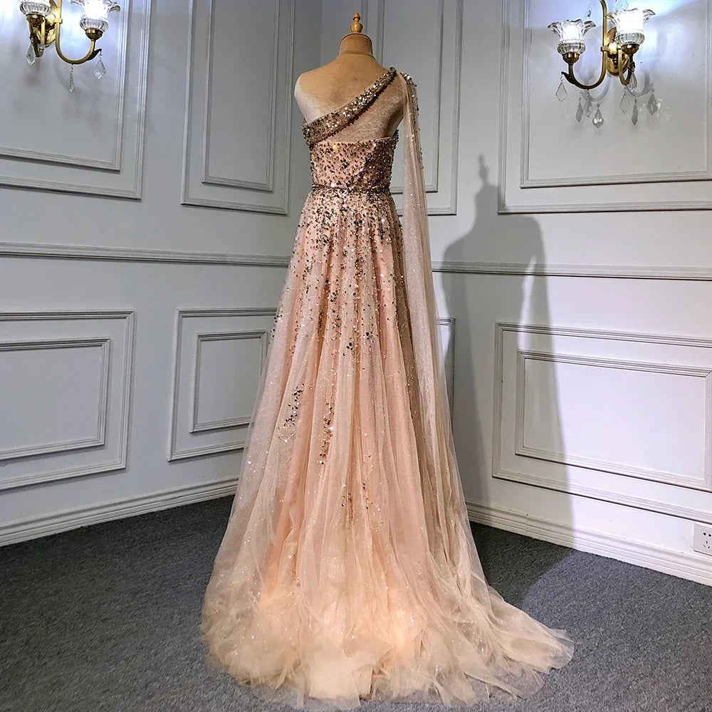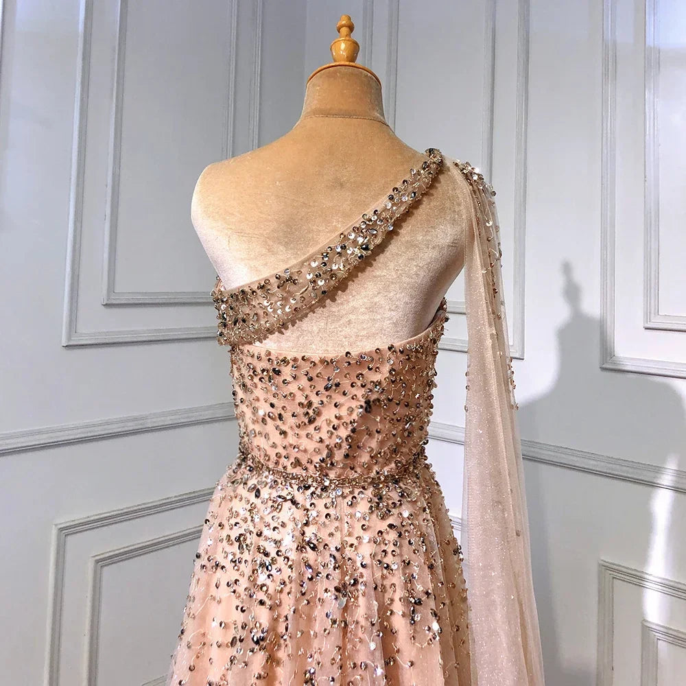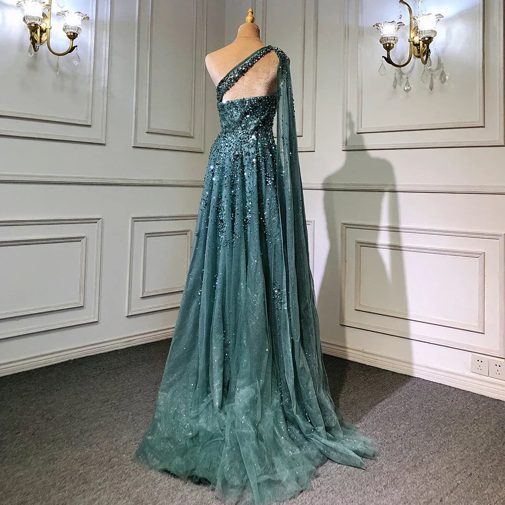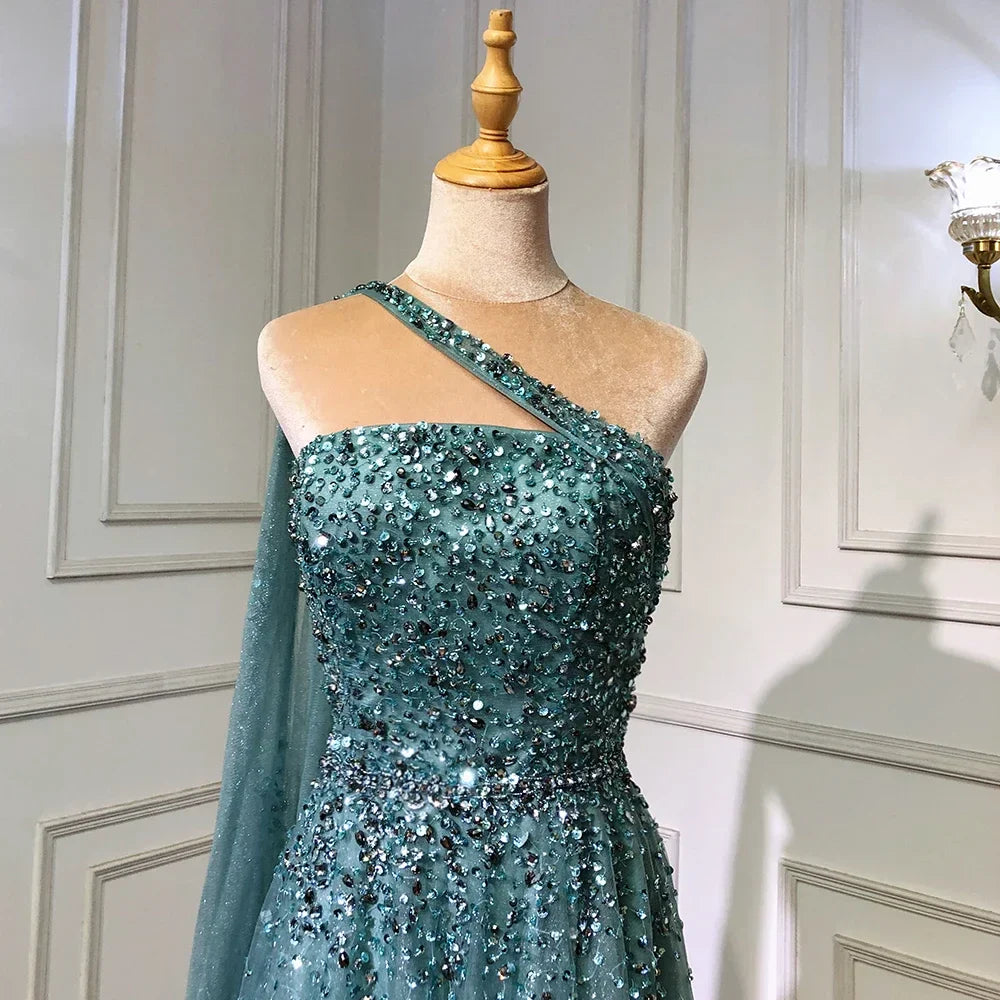 One-Shoulder Cape Sleeve A-Line Beaded Gown