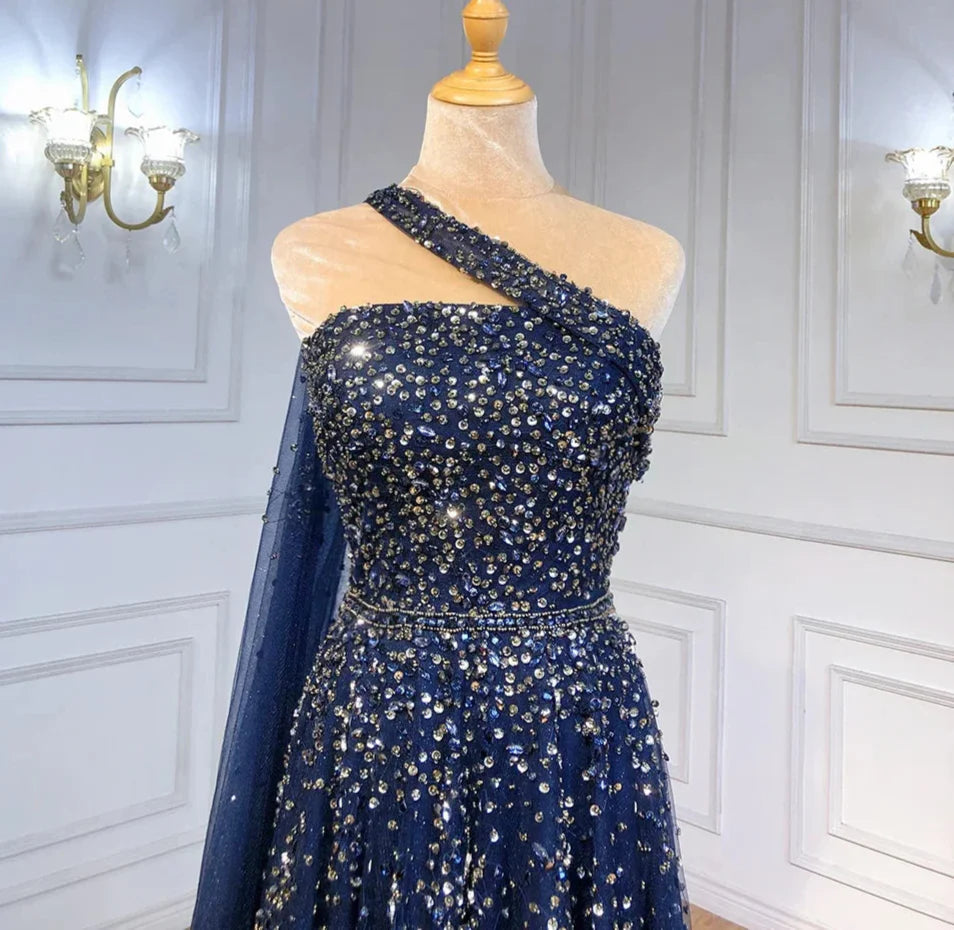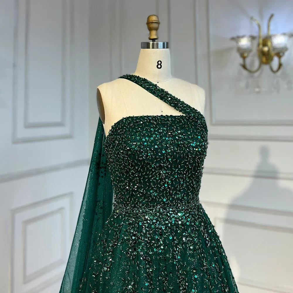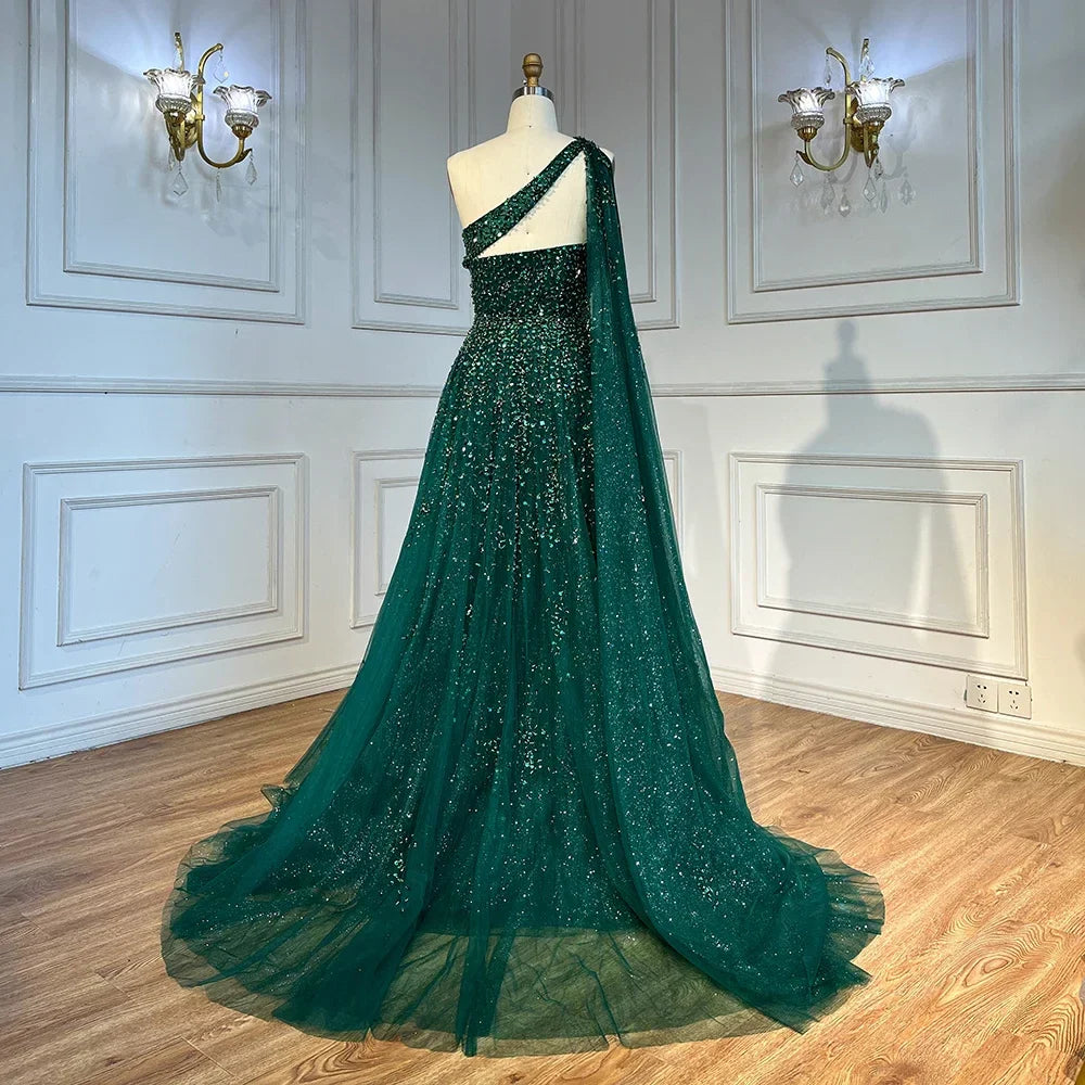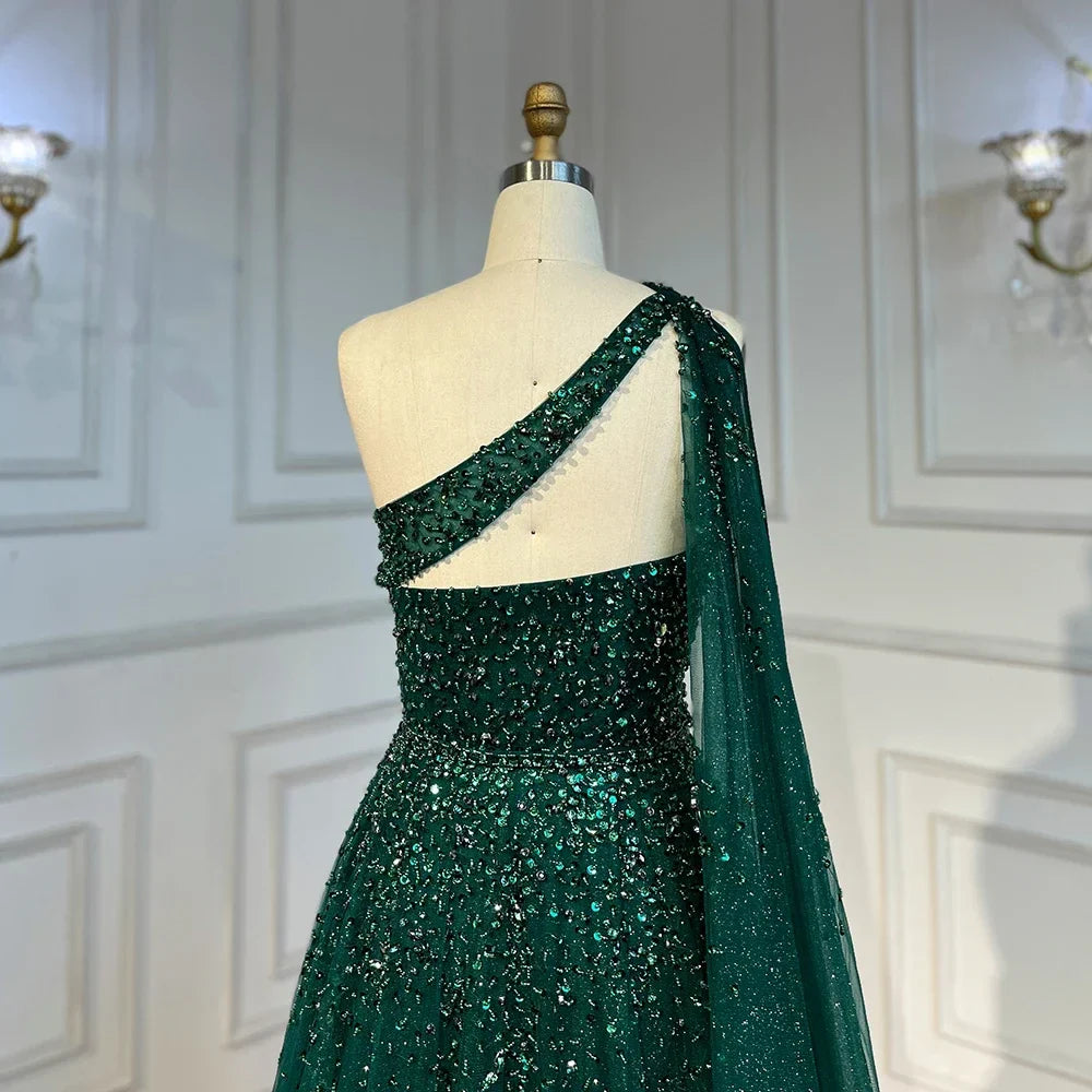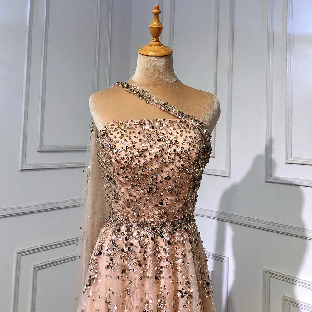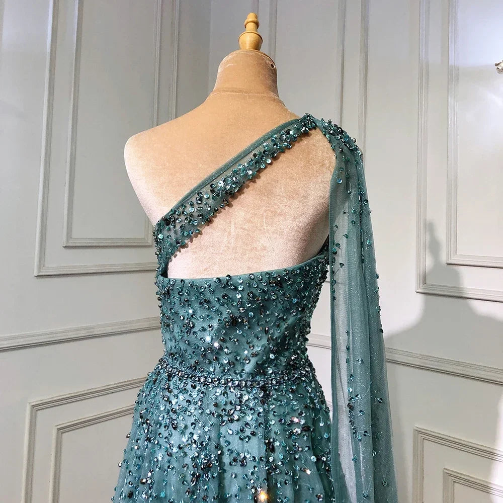 One-Shoulder Cape Sleeve A-Line Beaded Gown