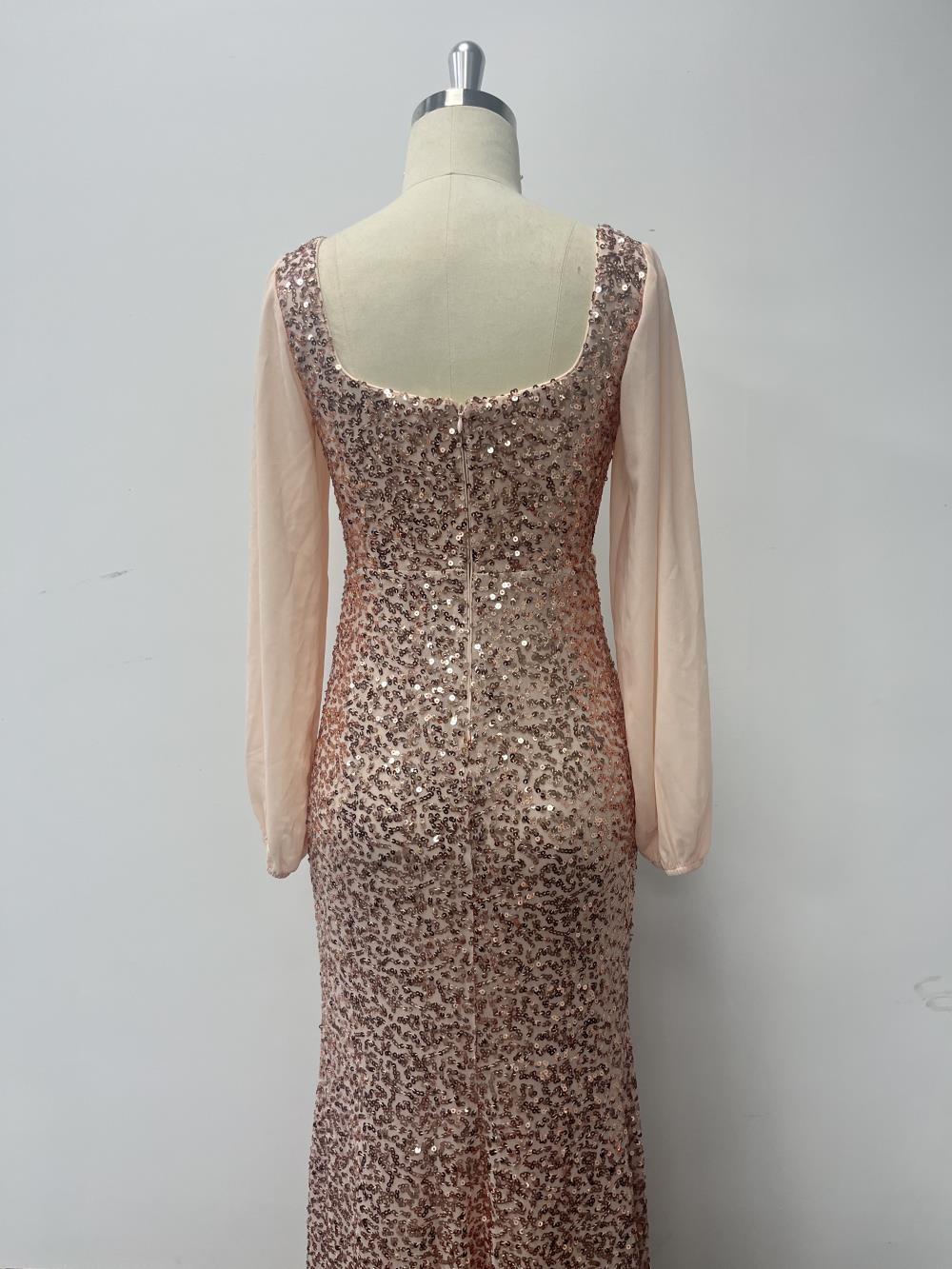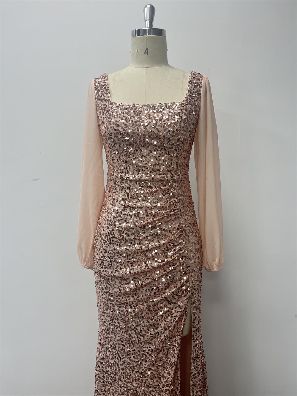 Pairs U Neck Long Sleeved Shiny Bright Evening Dress Chiffon Stitching High Slit Pleated Dress
