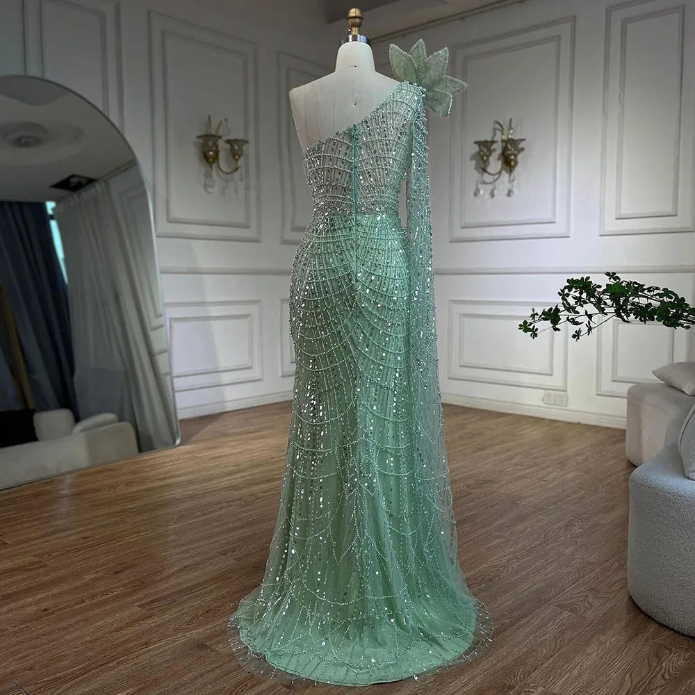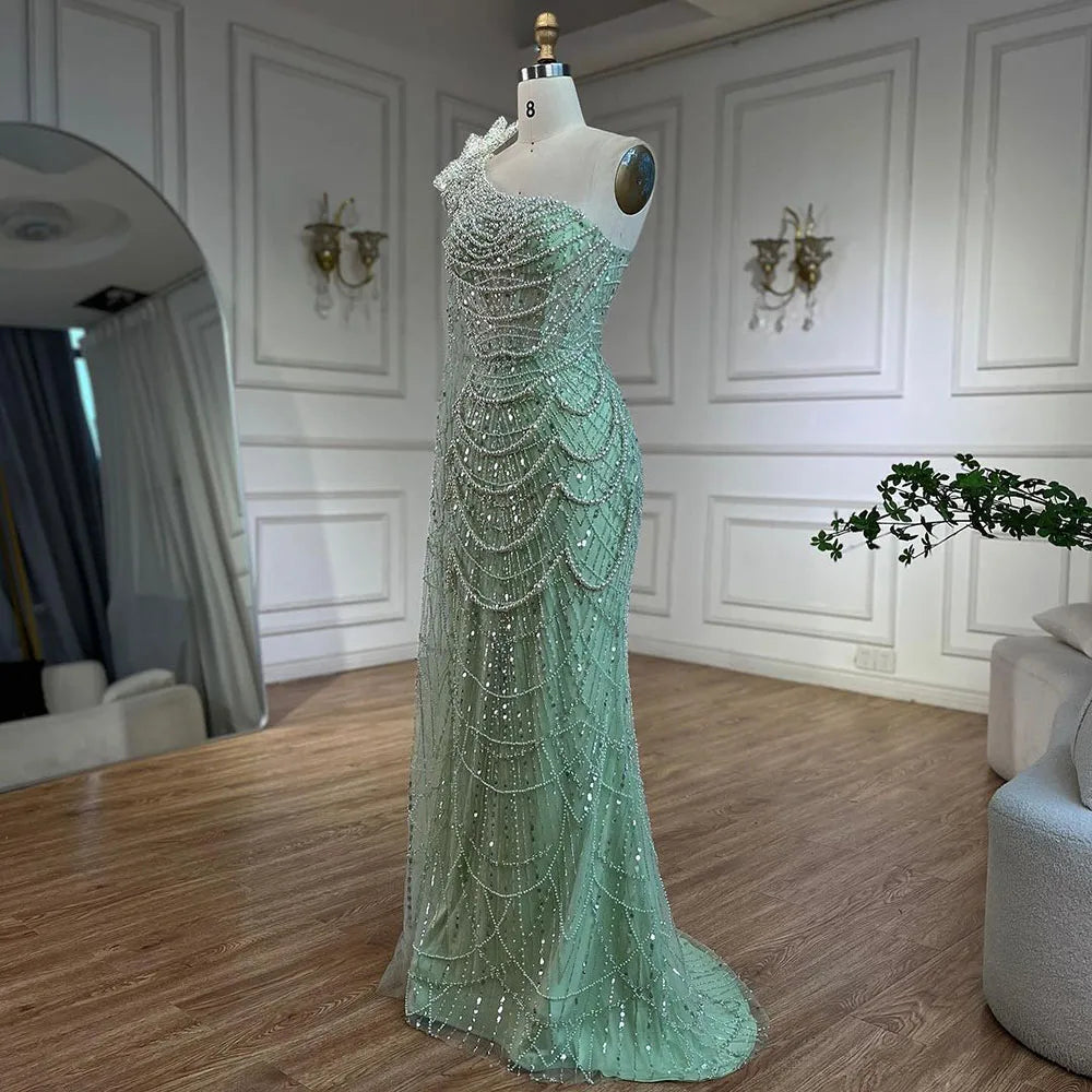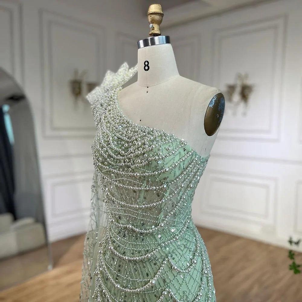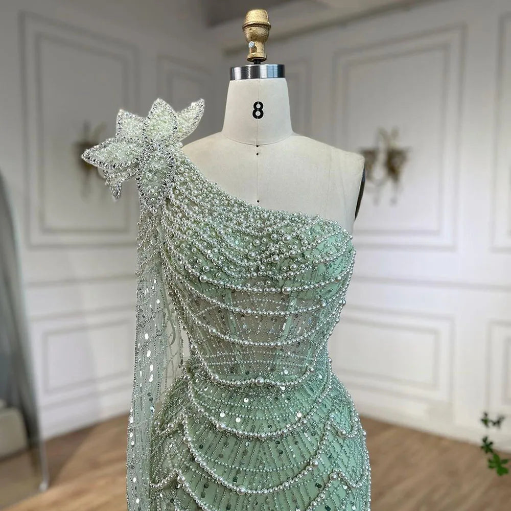Pearl Embellished Sage Green Mermaid Evening Gown