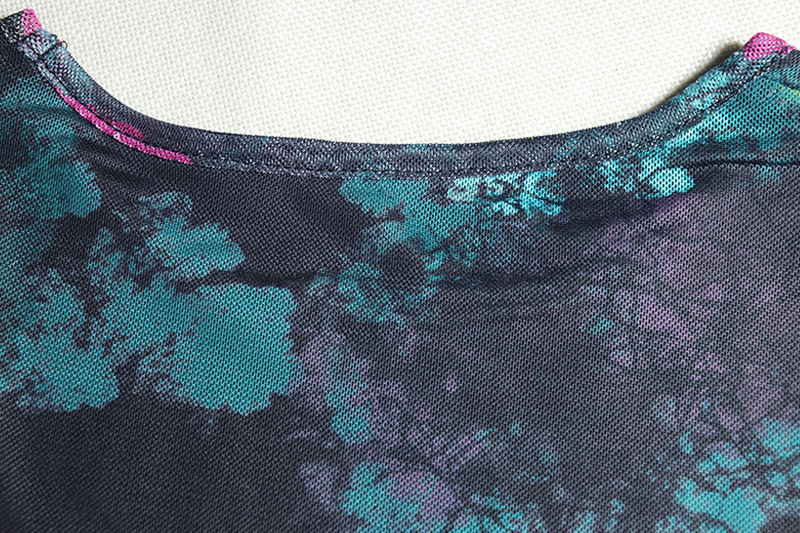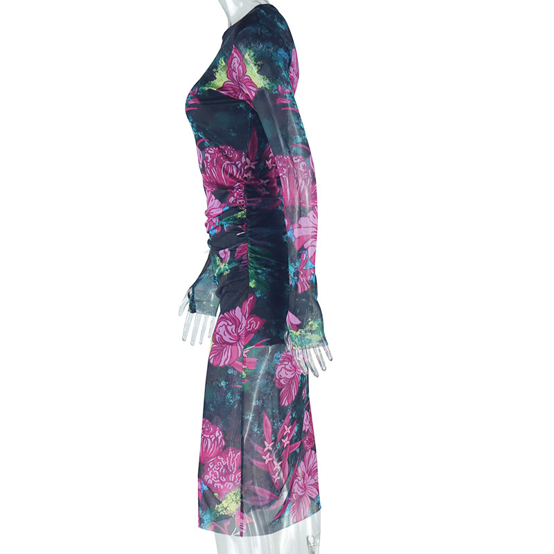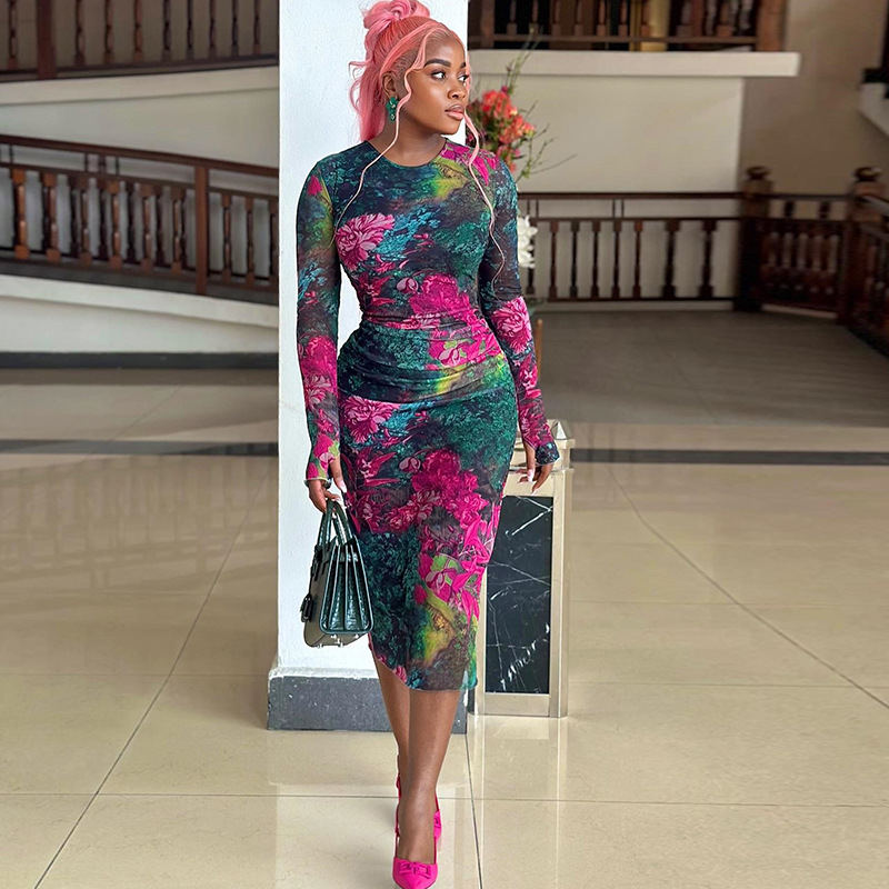 Personality Wear Elegant Printed Office Lady Sheath Dress round Neck Long Sleeve Slim Length Dress