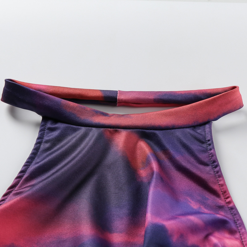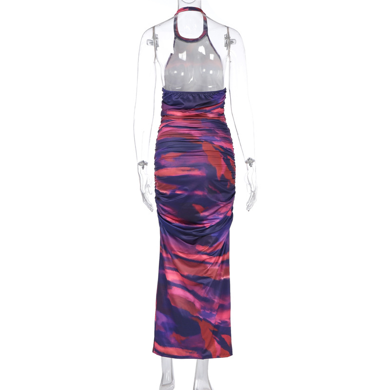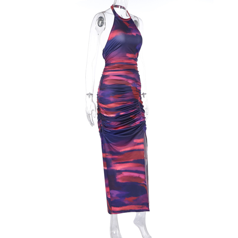 Personalized Printed Pleated Tight Backless Halter Split Dress