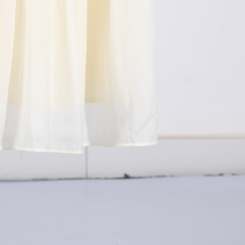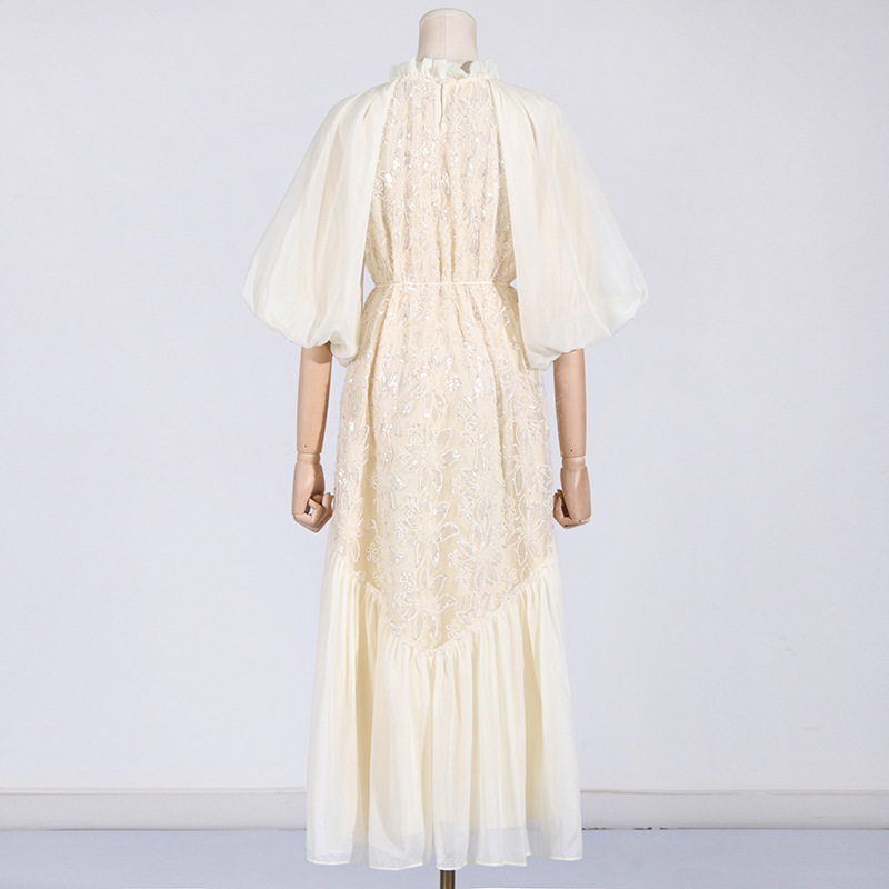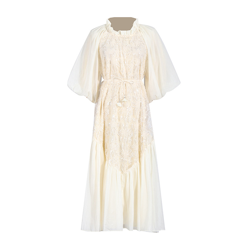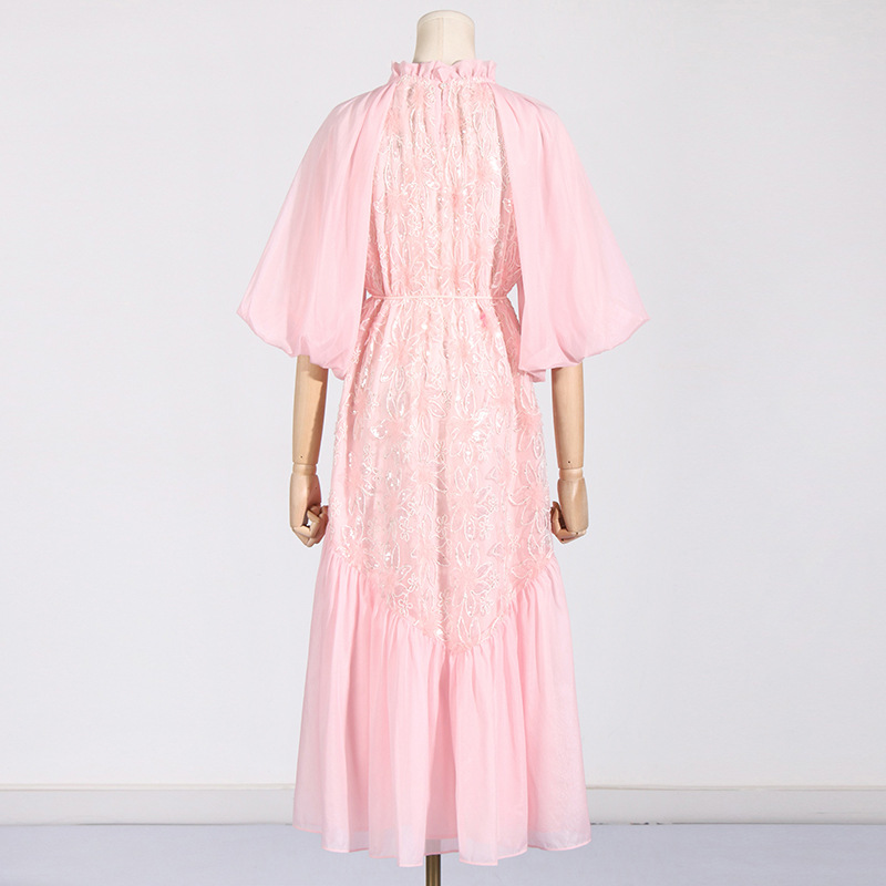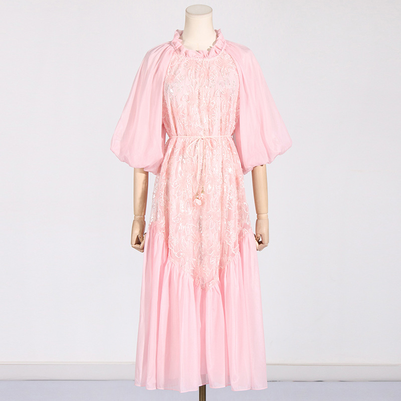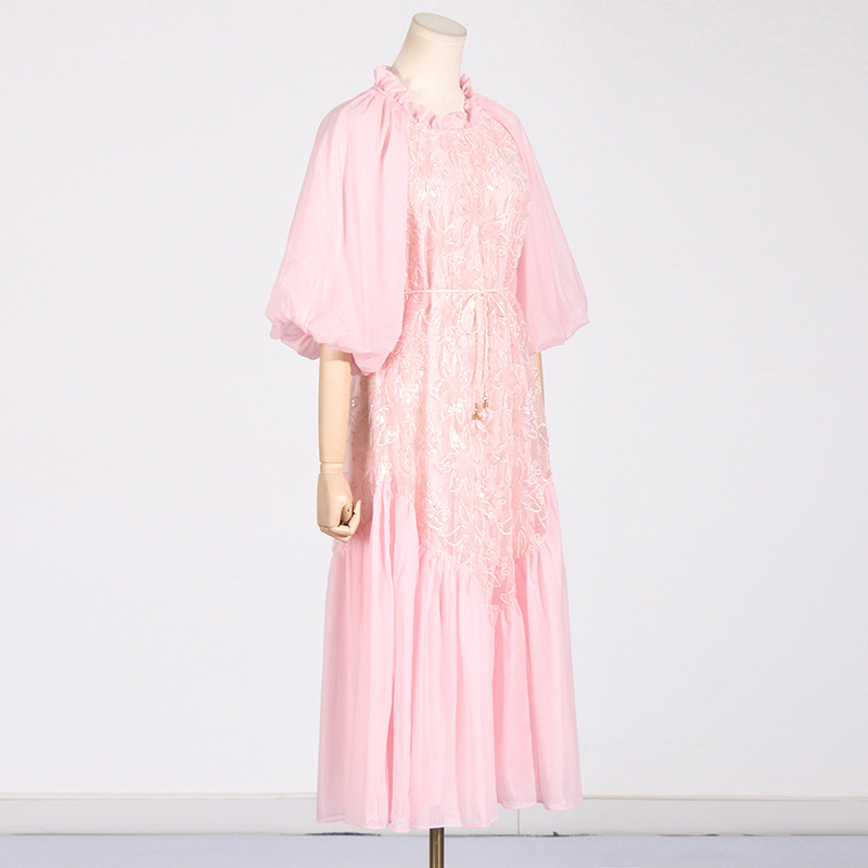 round Neck Wooden Ear Embroidery Tie Neck Slim Waist Solid Color Dress