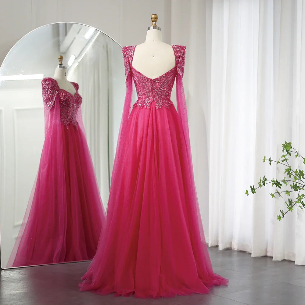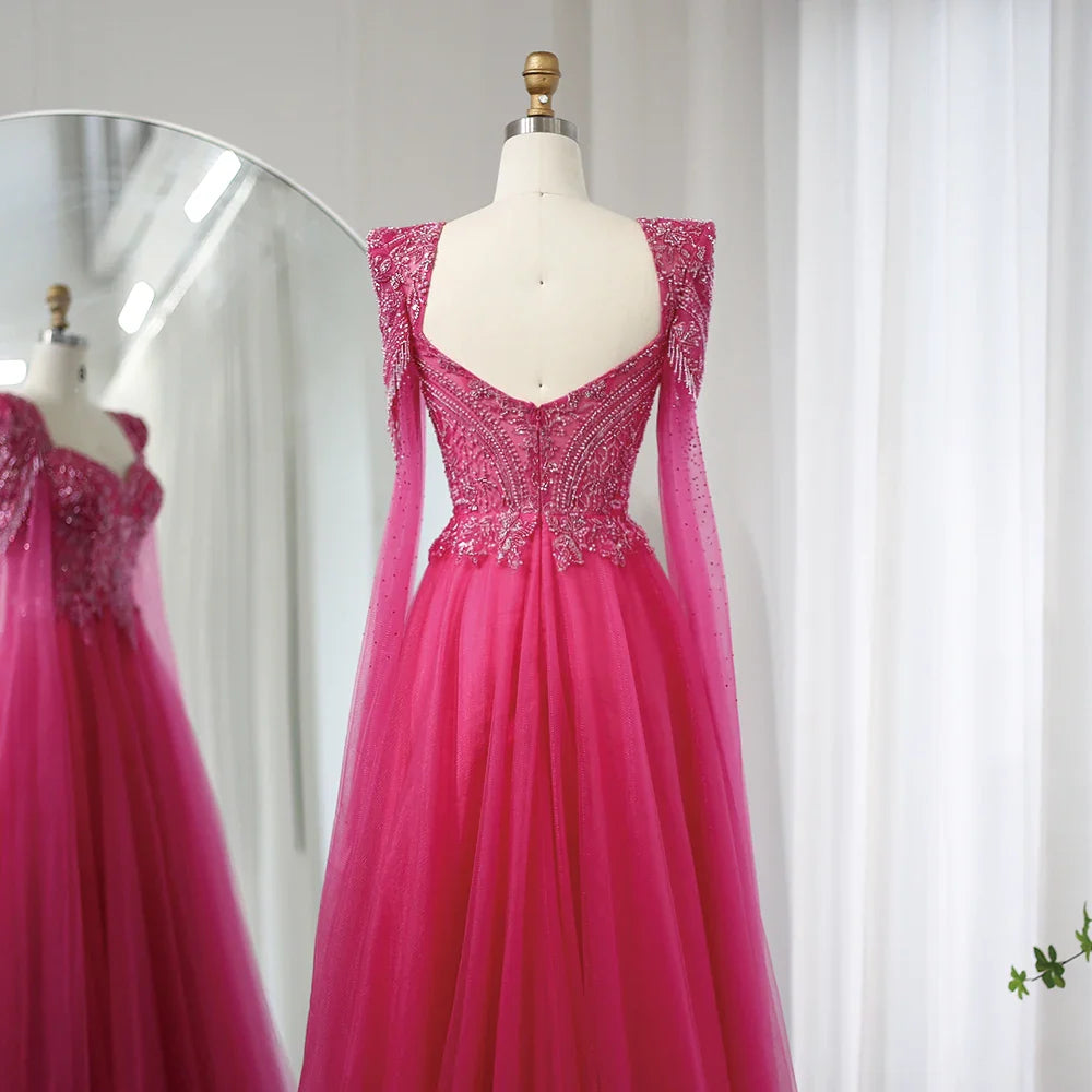 Fuchsia Beaded Evening Gown with Cape Sleeves