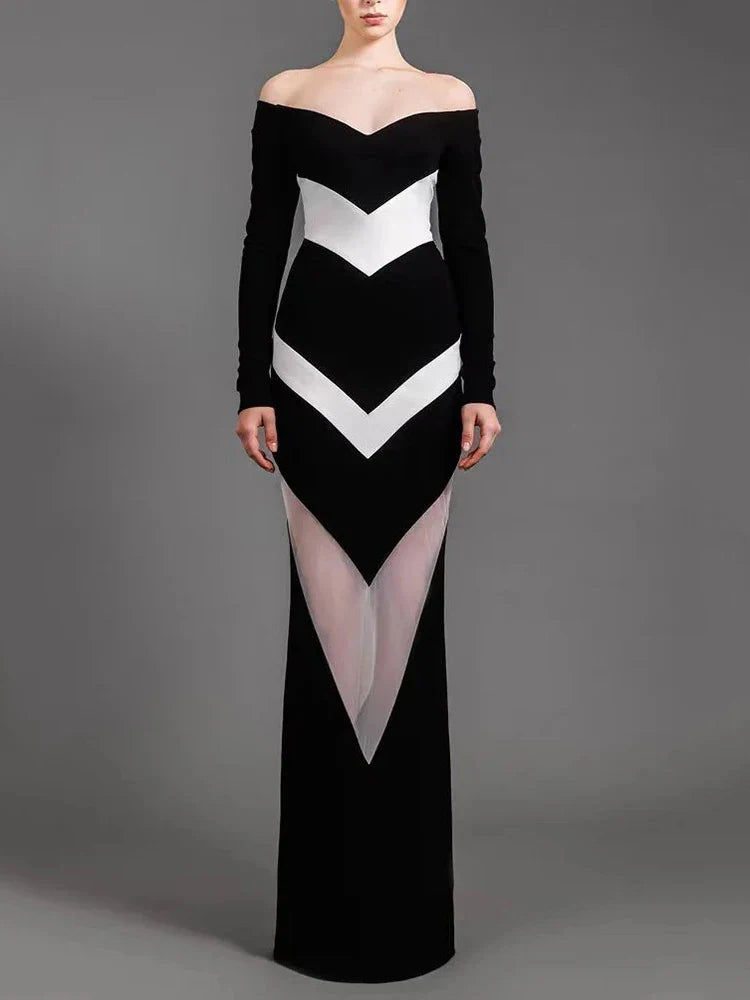 Slash Neck Gauze Patchwork Contrast Long Dress