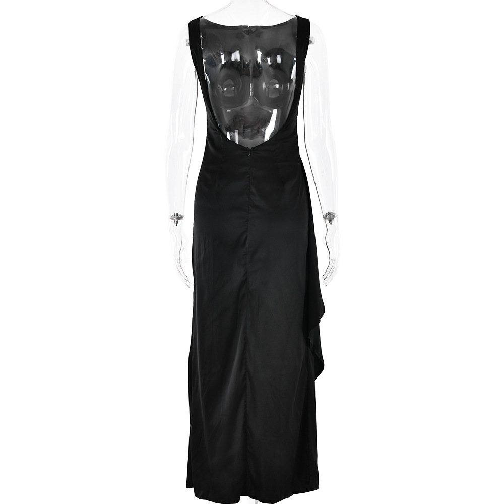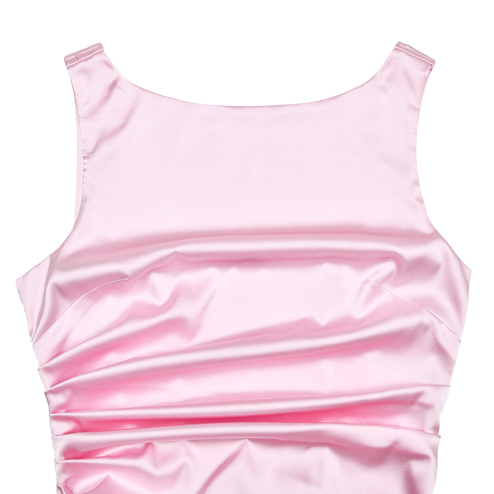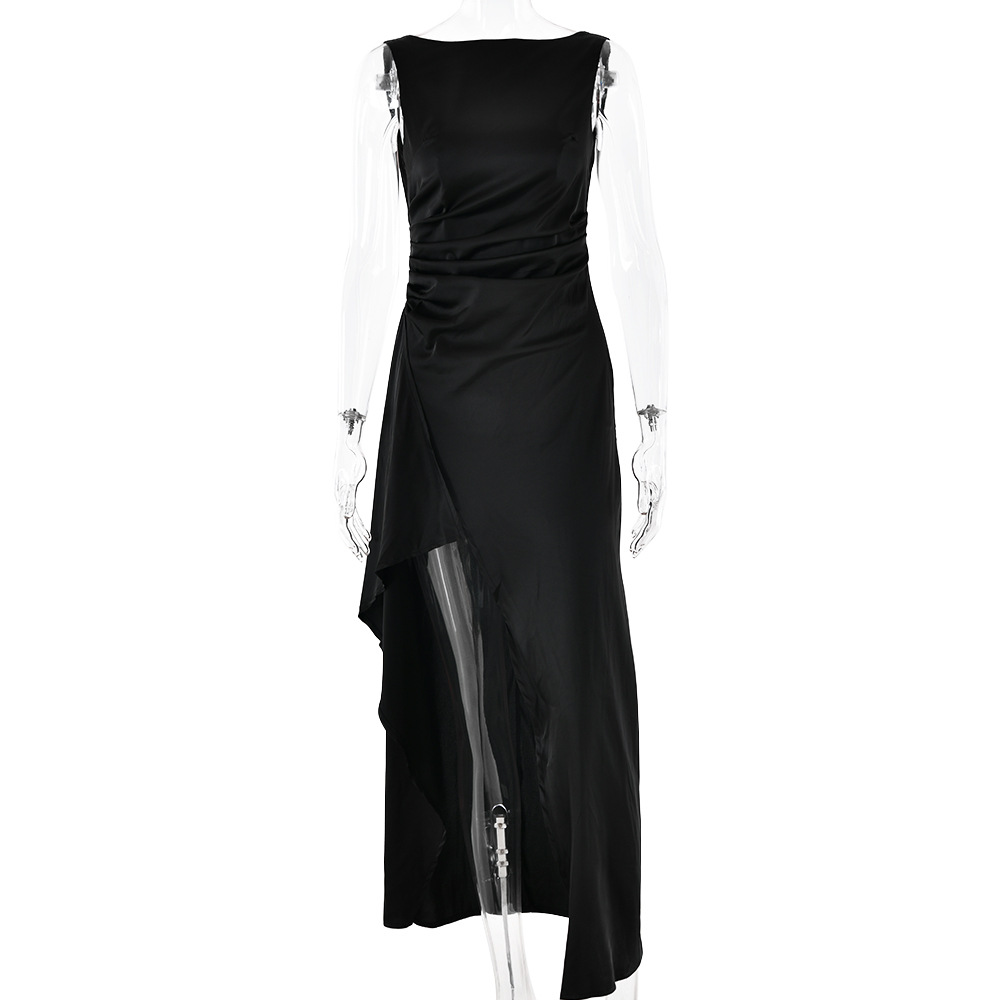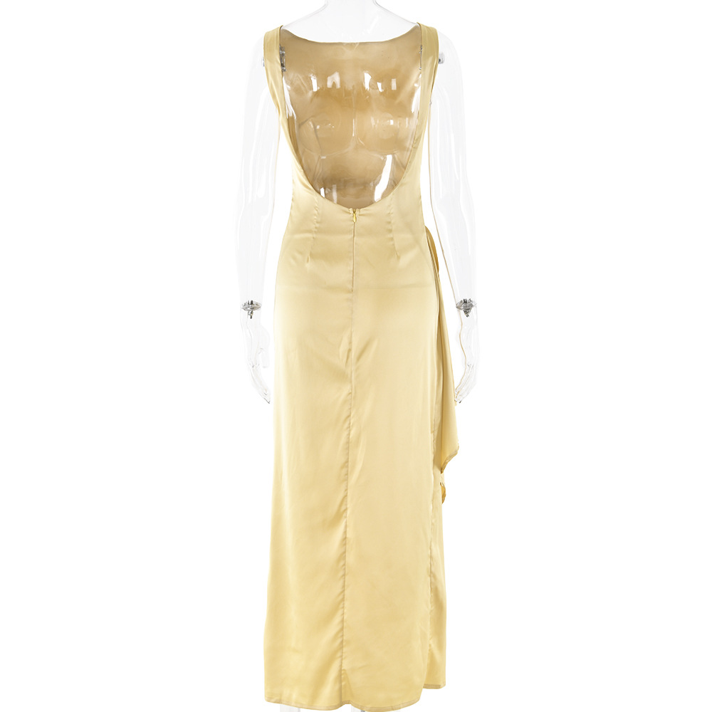 Slim Sleeveless Backless Satin Dress Pleated High Slit Dress