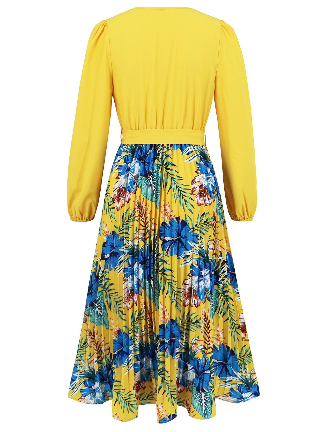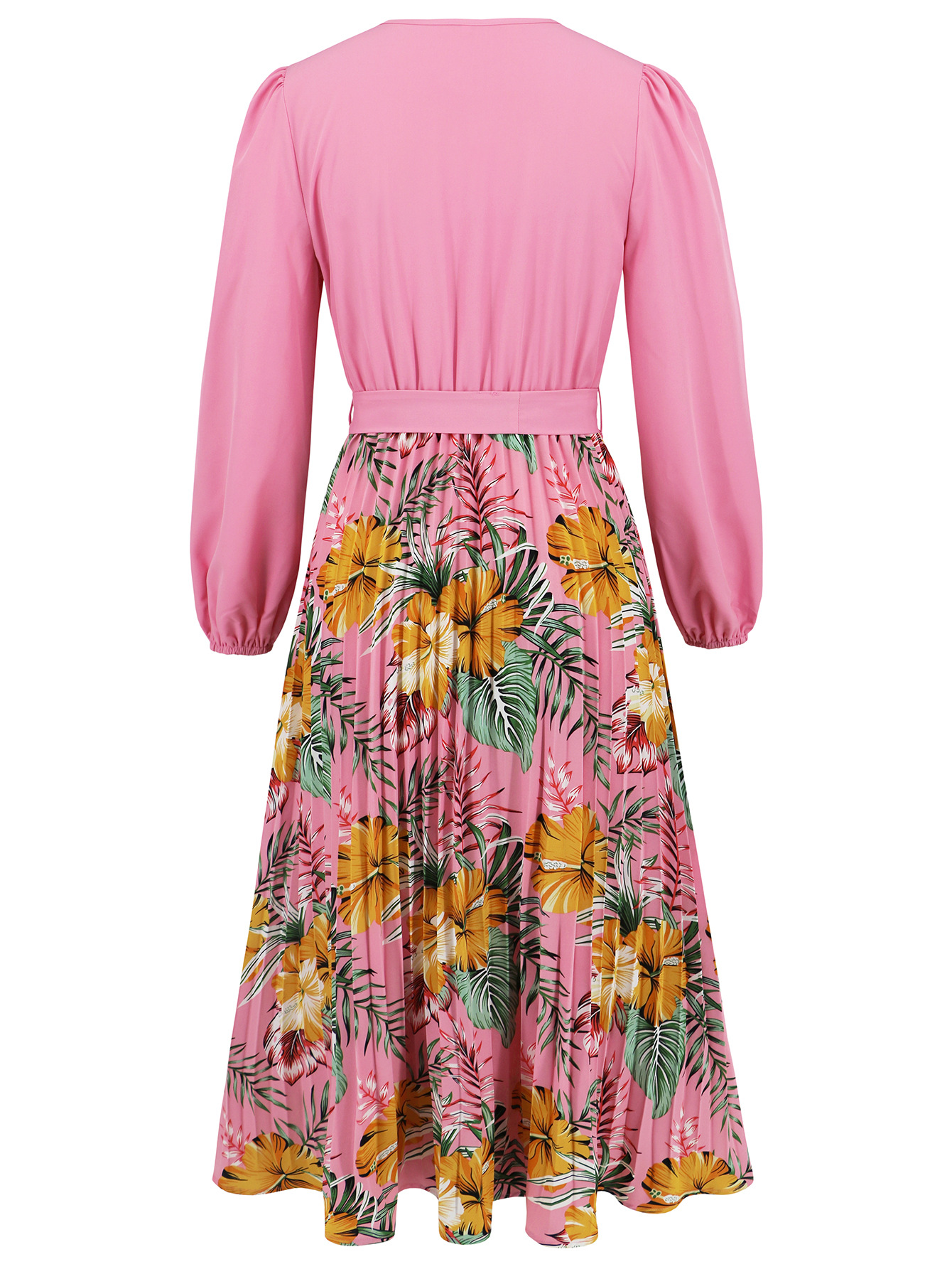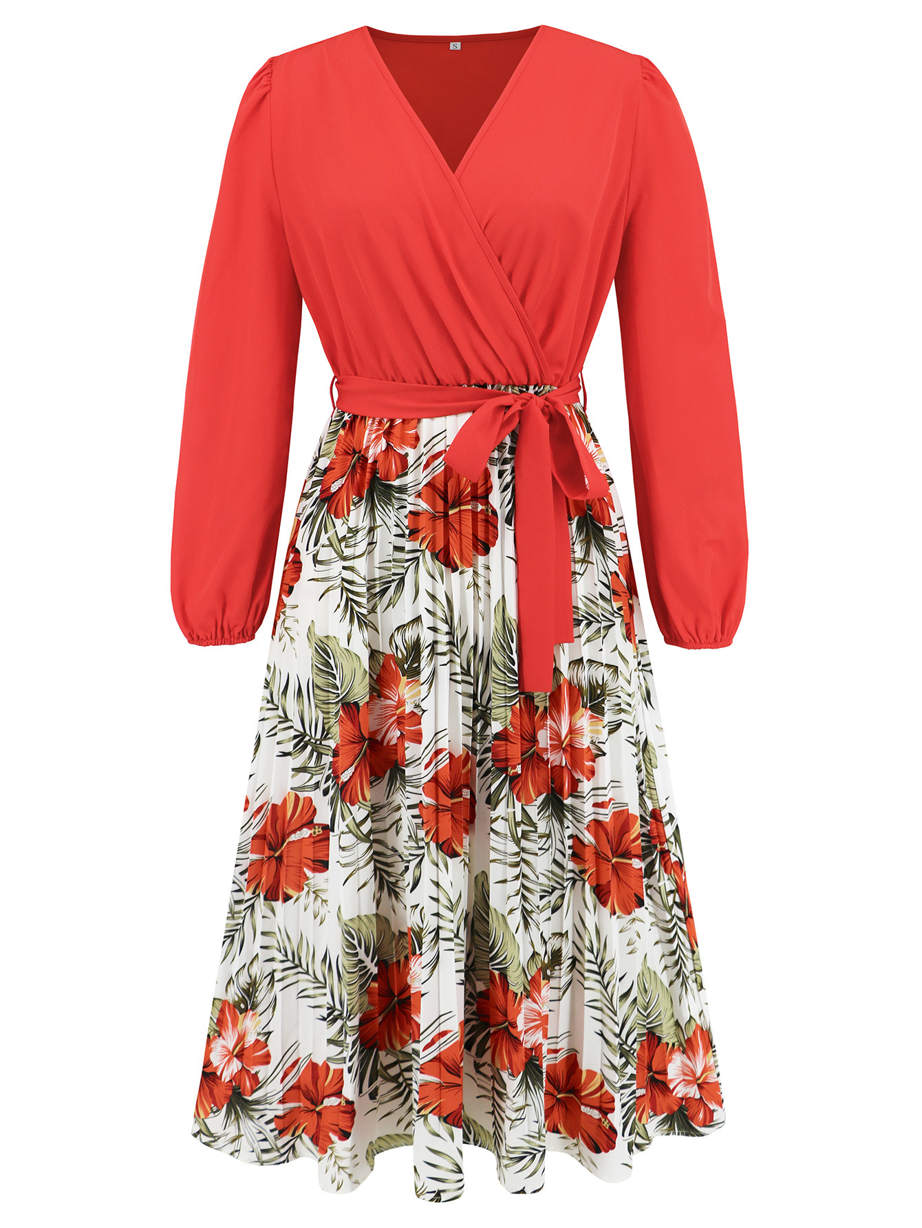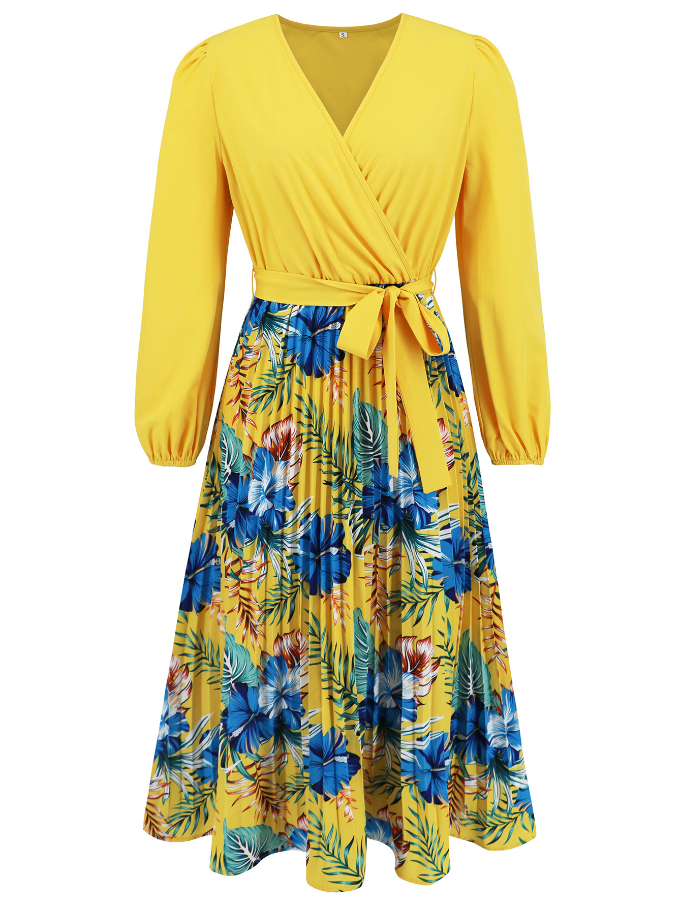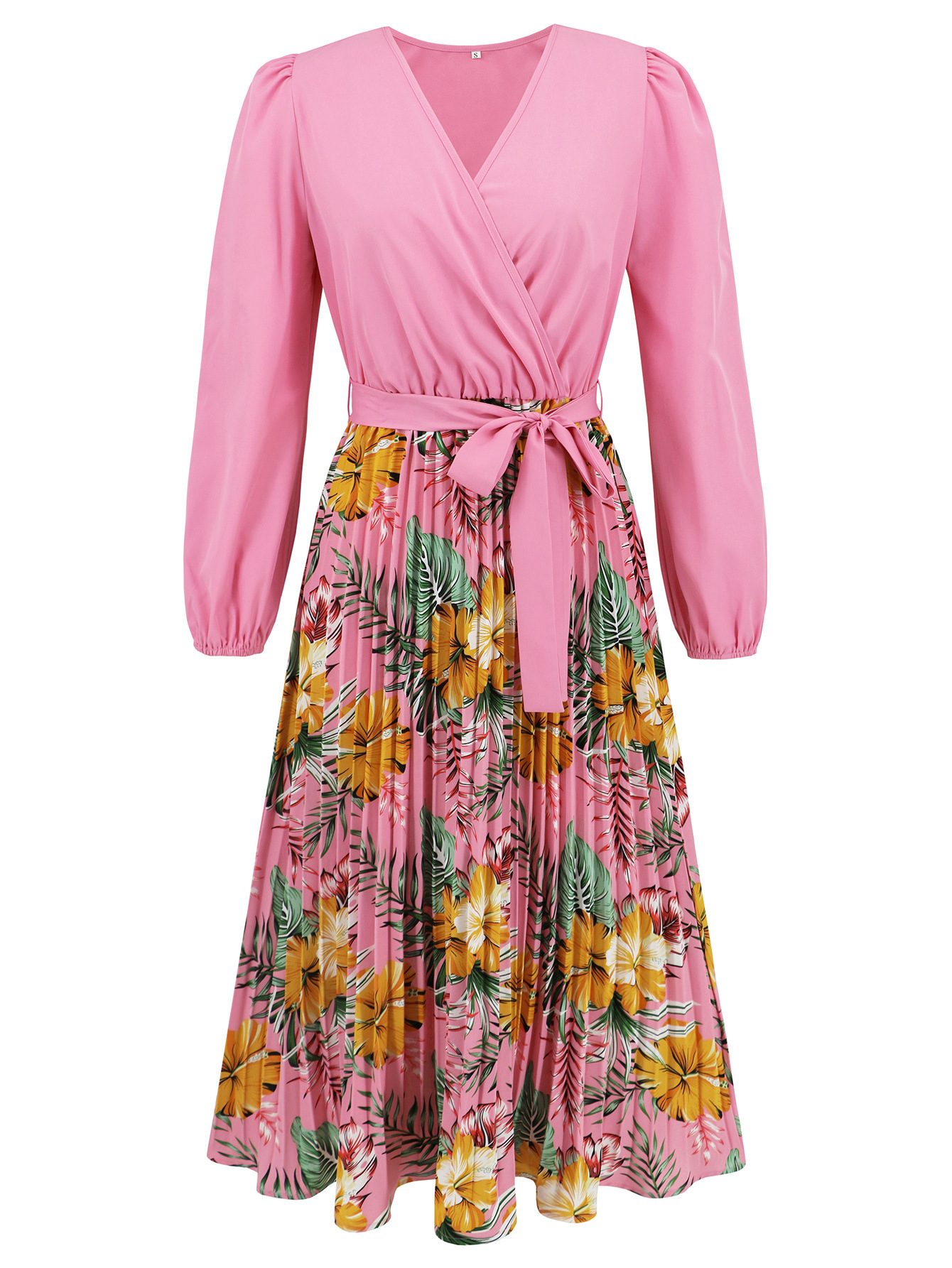Slim V Neck Printed Dress Long Sleeve Pleated Dress