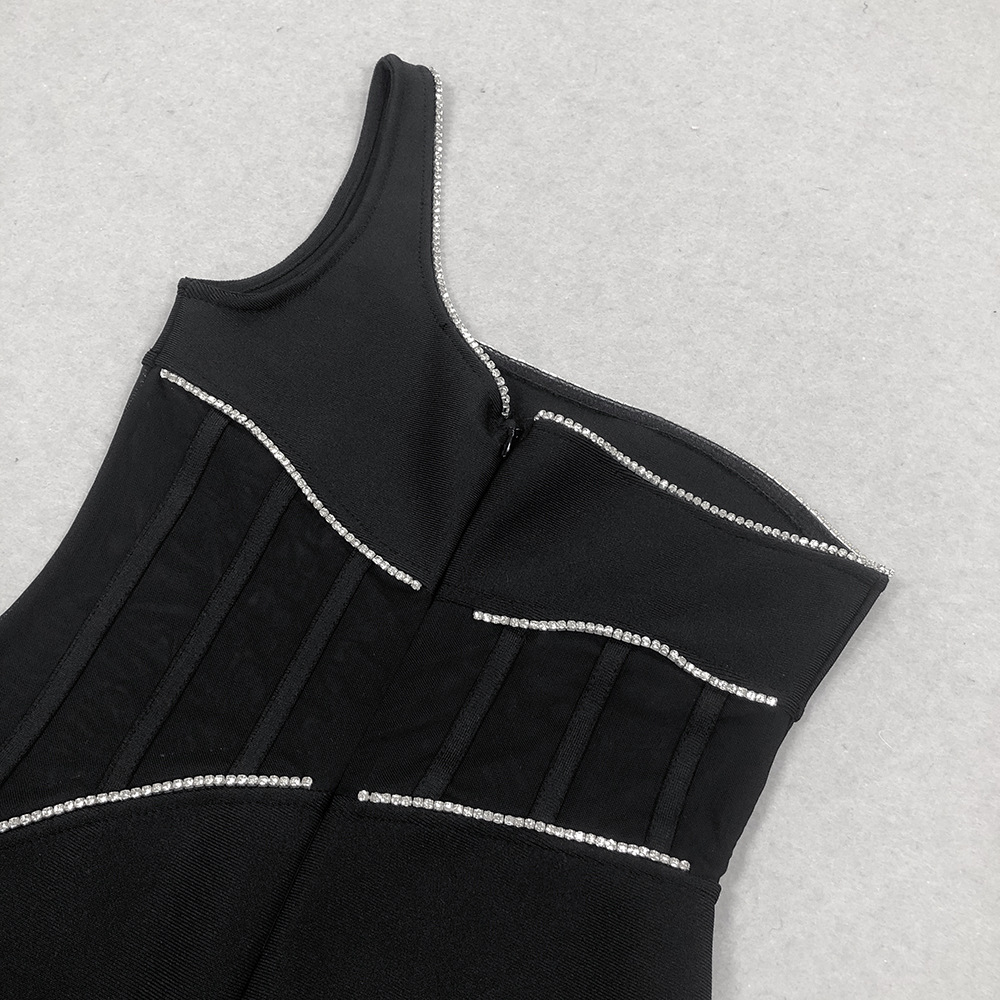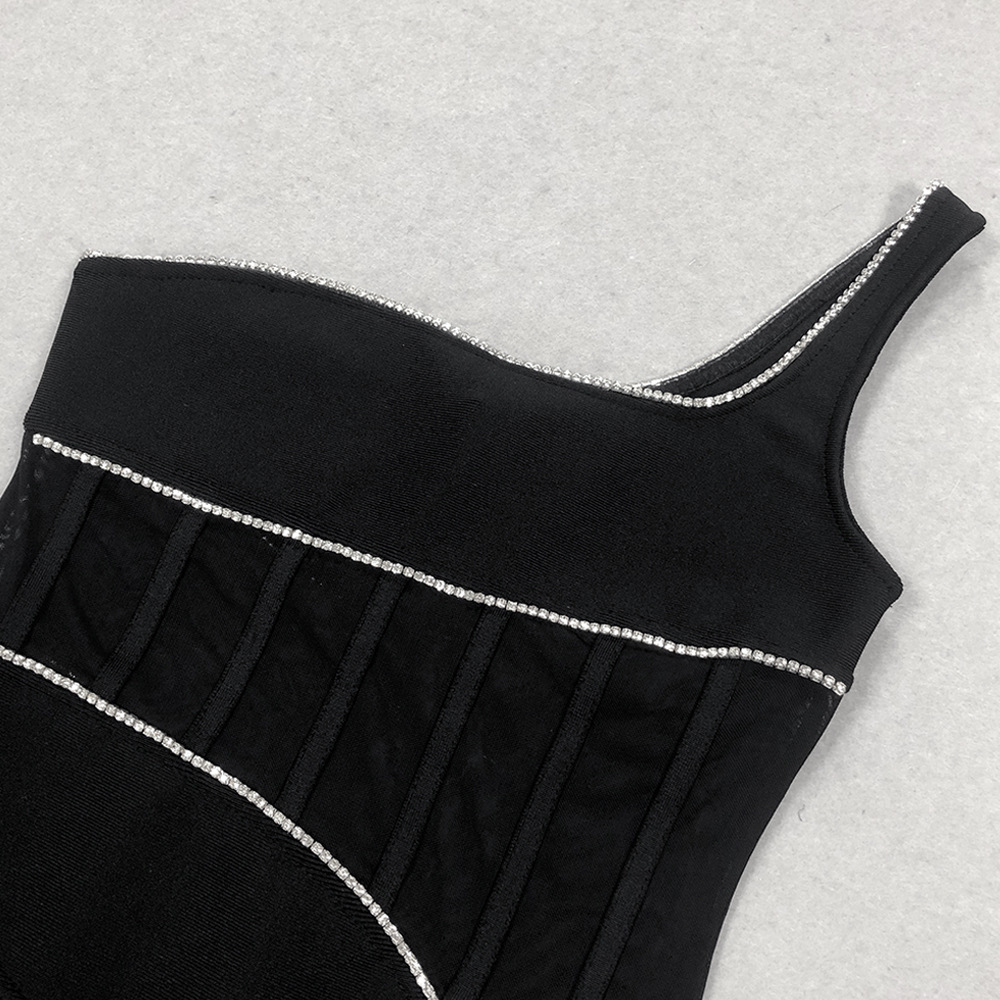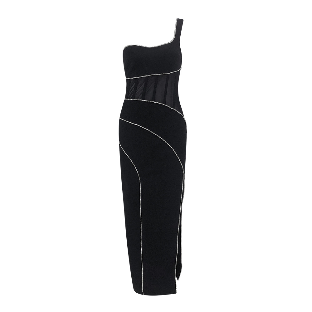 Socialite Dress Black Slim Set Diamond Mesh Boning Corset One Shoulder Split Bandage Dress