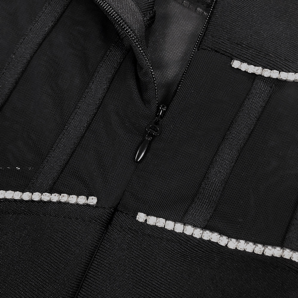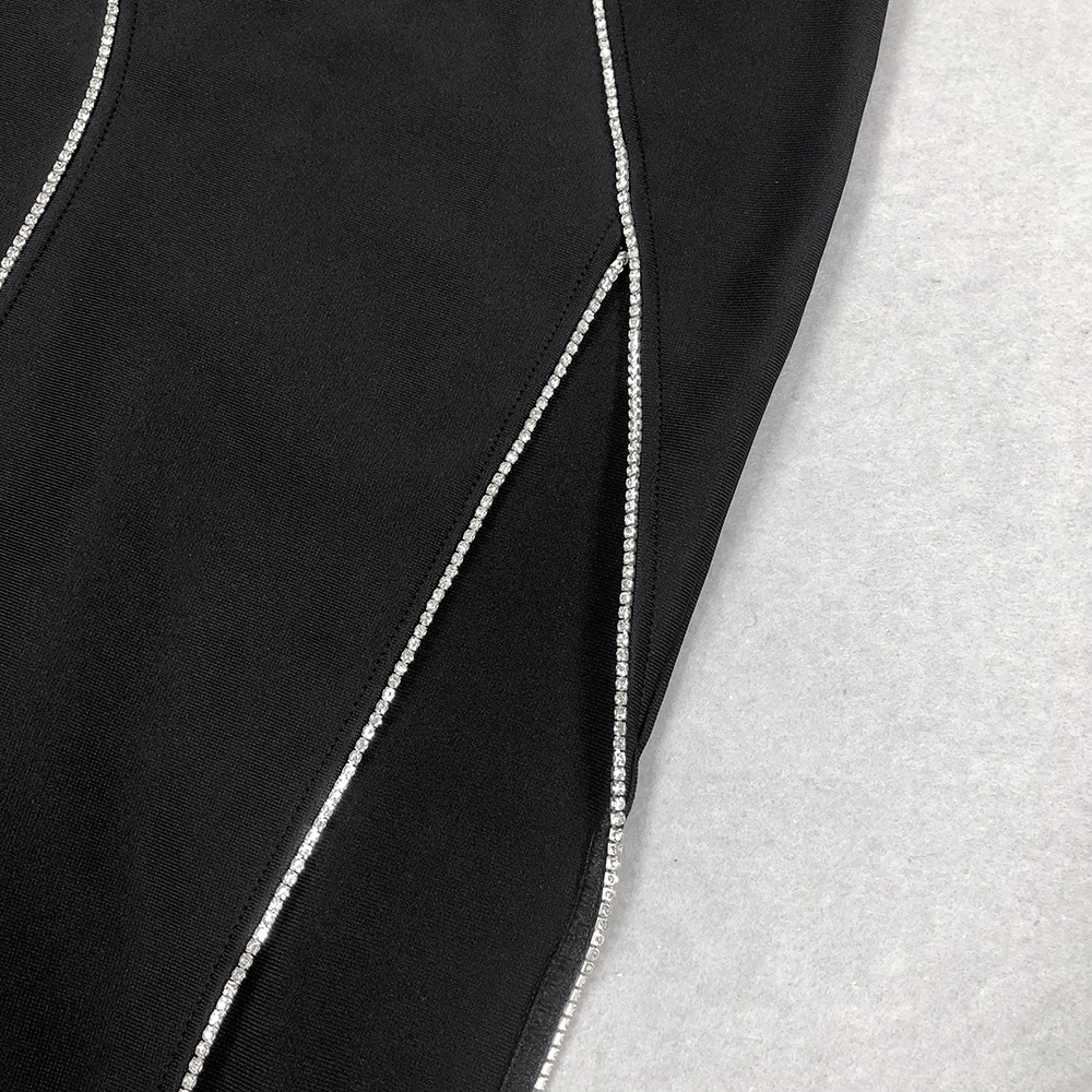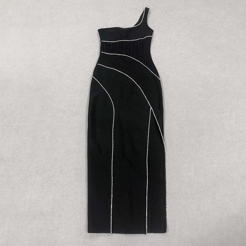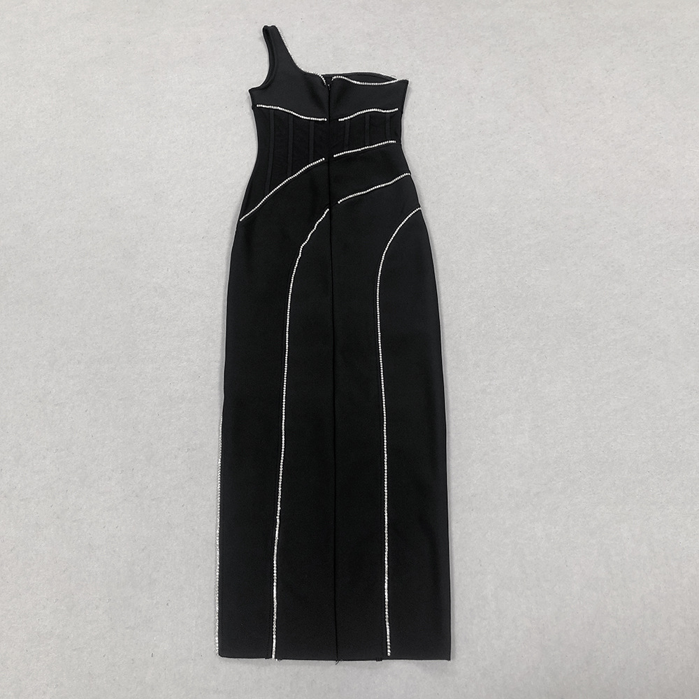 Socialite Dress Black Slim Set Diamond Mesh Boning Corset One Shoulder Split Bandage Dress