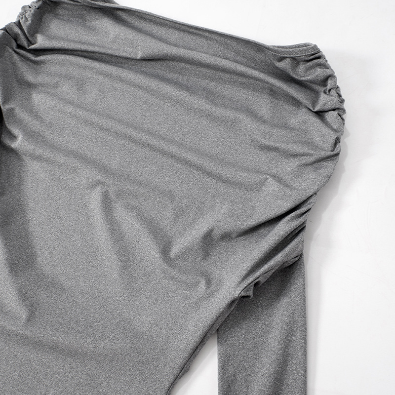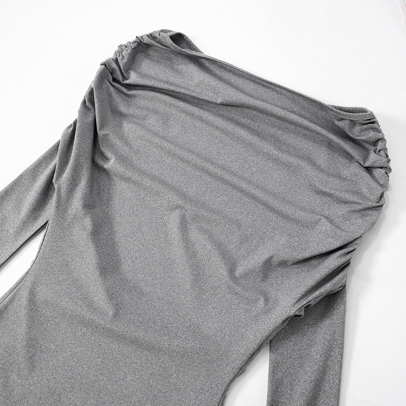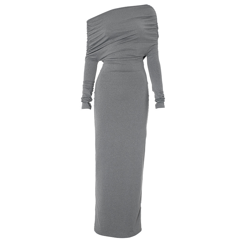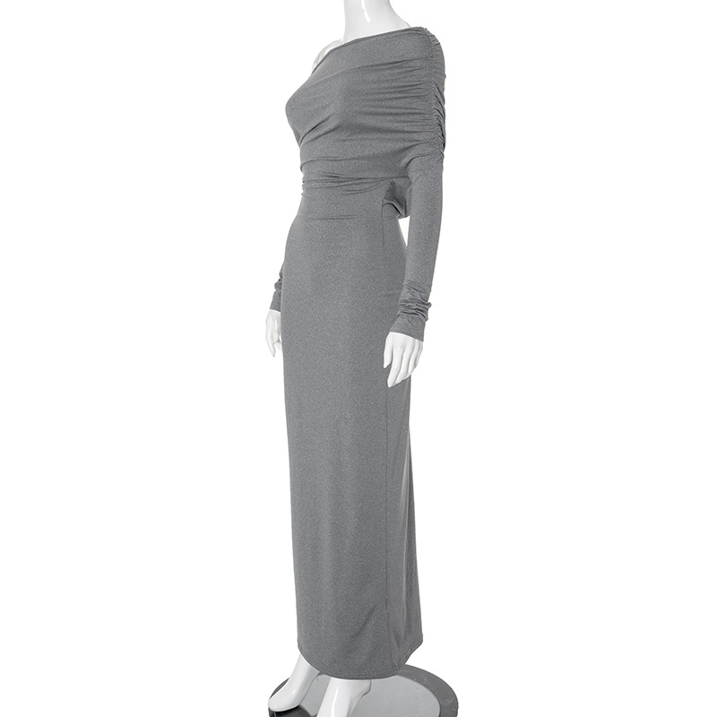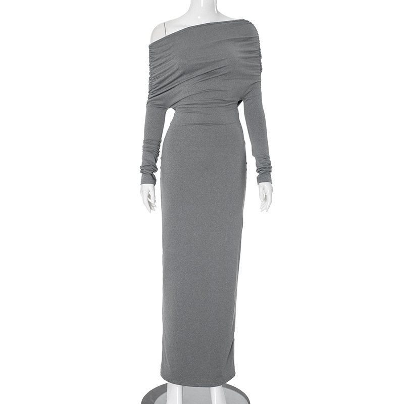 Solid Color Diagonal Collar Drop Shoulder Long Sleeve Waist Tight Maxi Dress