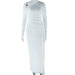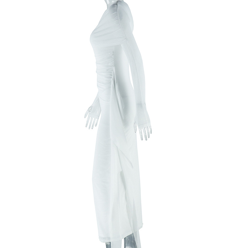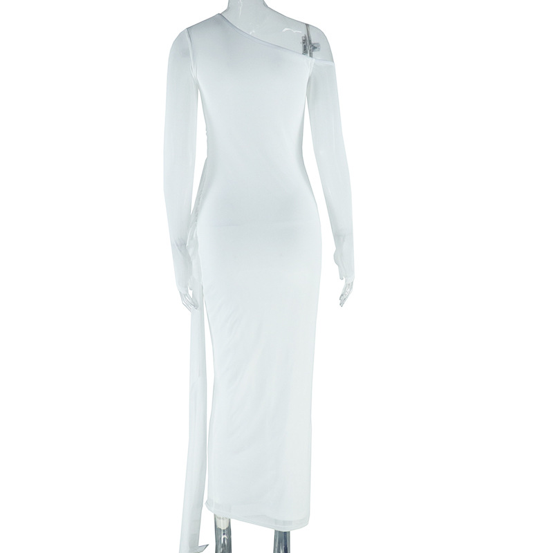Solid Color Dress Off Shoulder Long Sleeve Mesh Stitching Dress