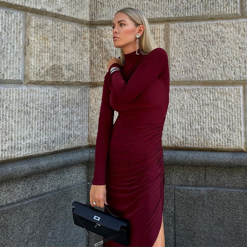 Solid Color Half High Collar Long Sleeves Slit Slim Fit Long Dress
