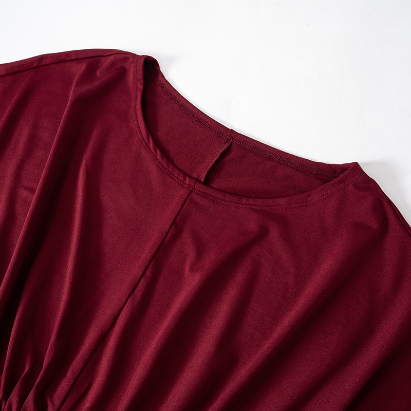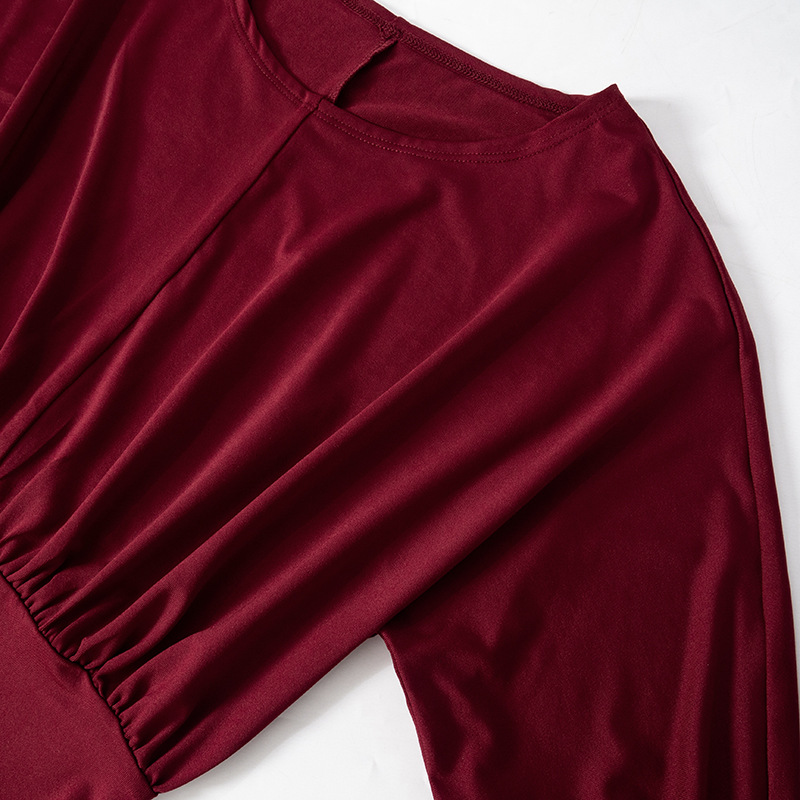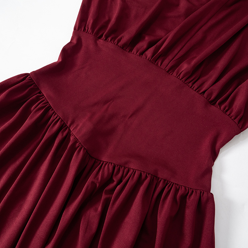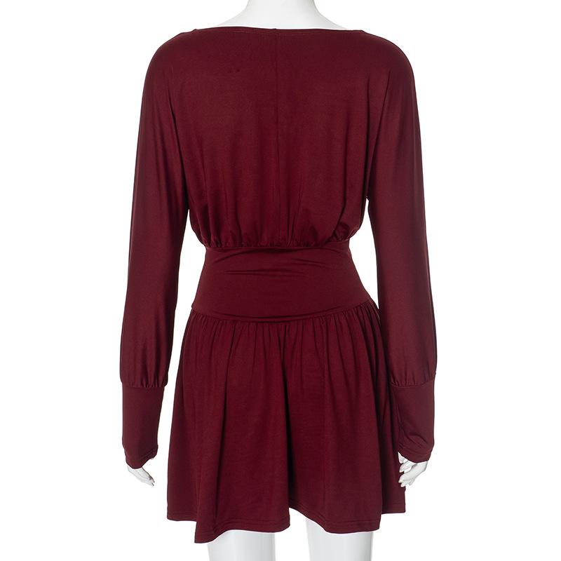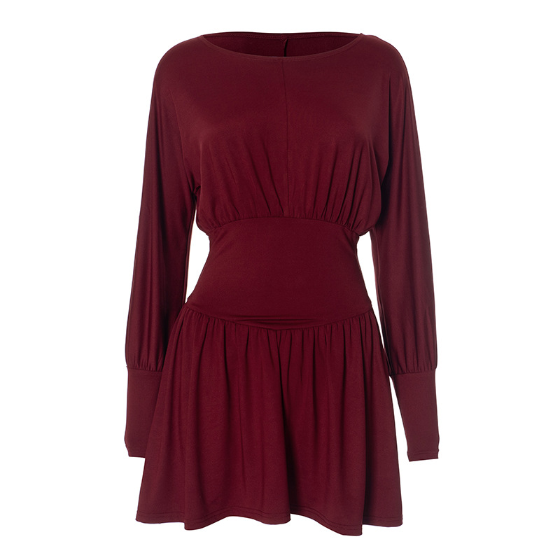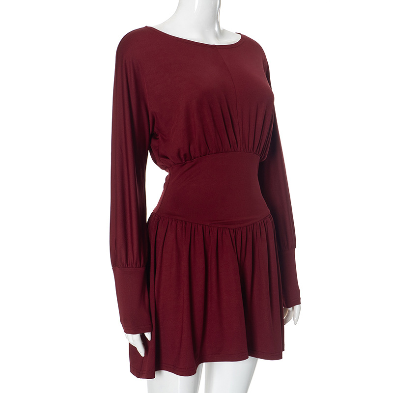 Solid Color Retro Long Sleeve Waist Tight Pleated Short Dress