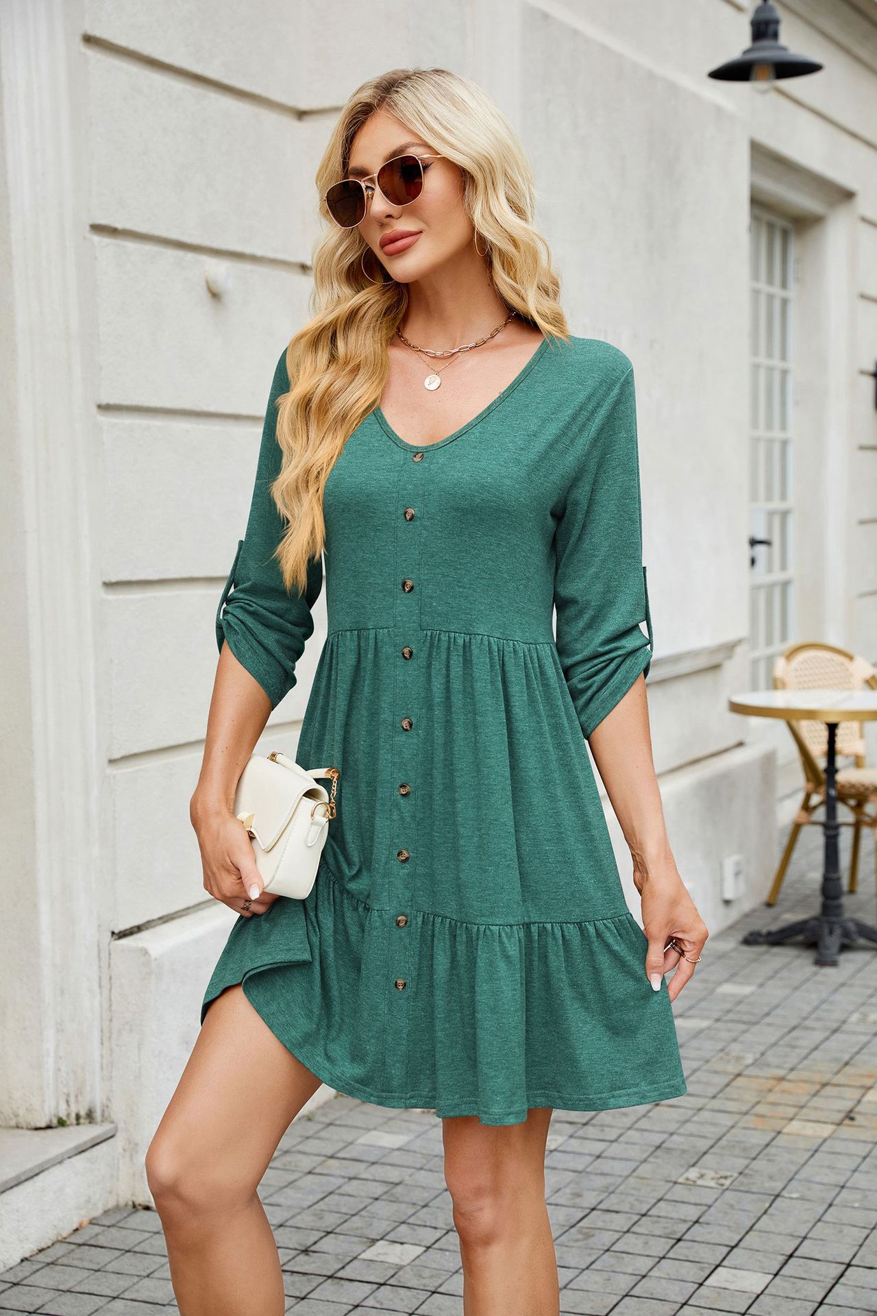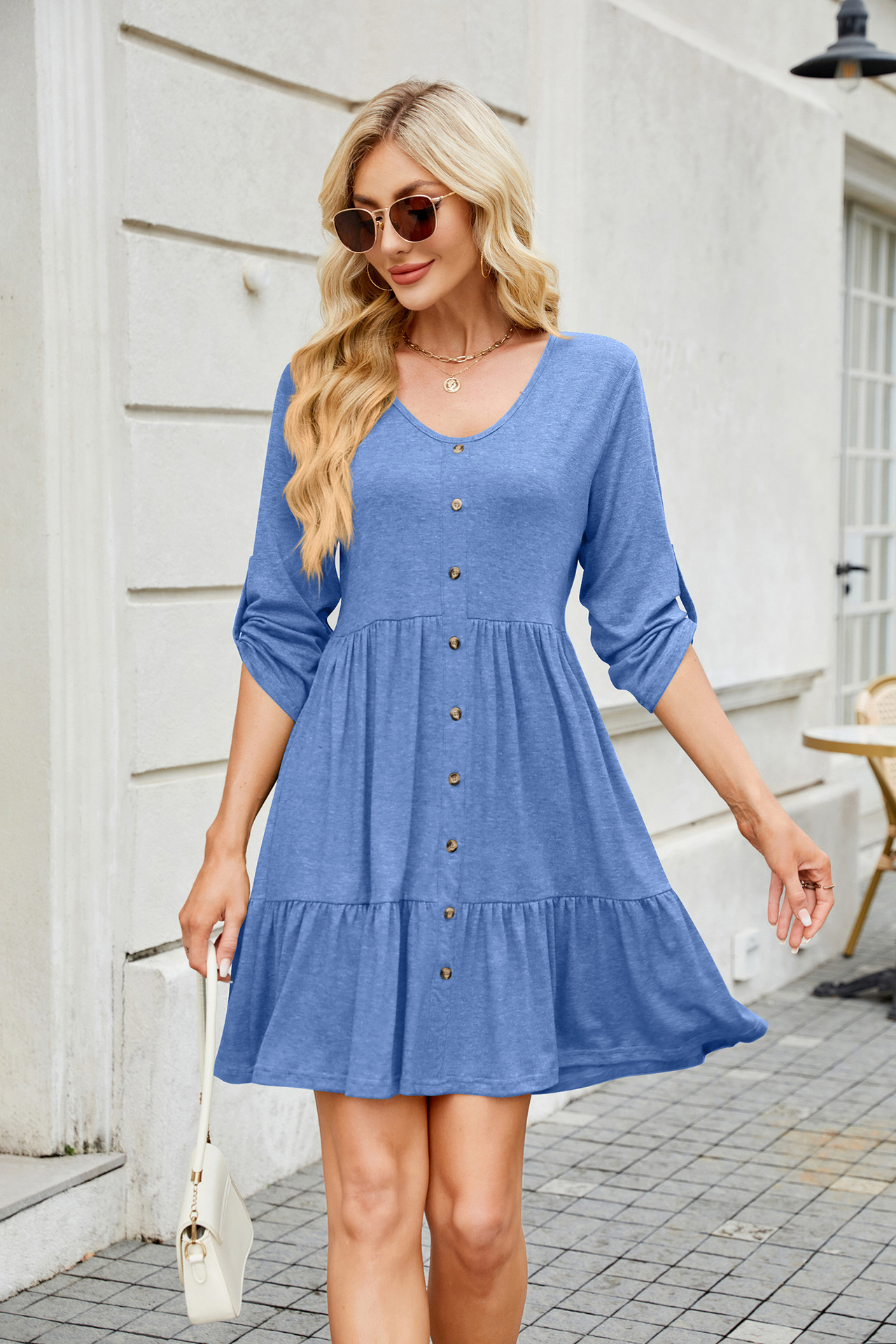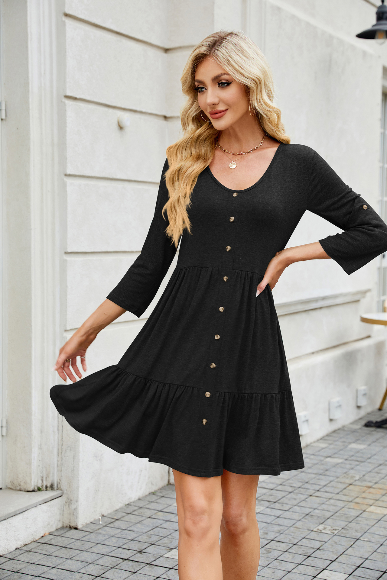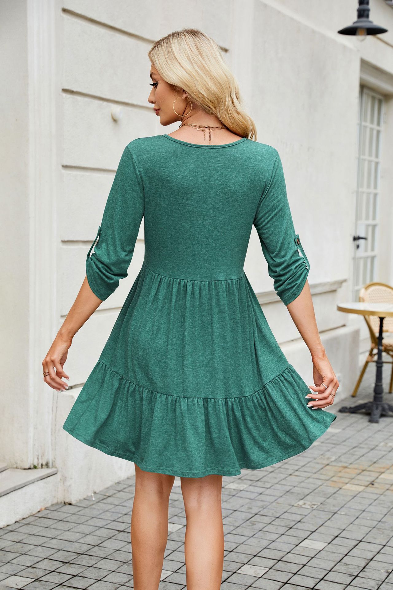 Solid Color round Neck Button Pleated Half Sleeve Dress