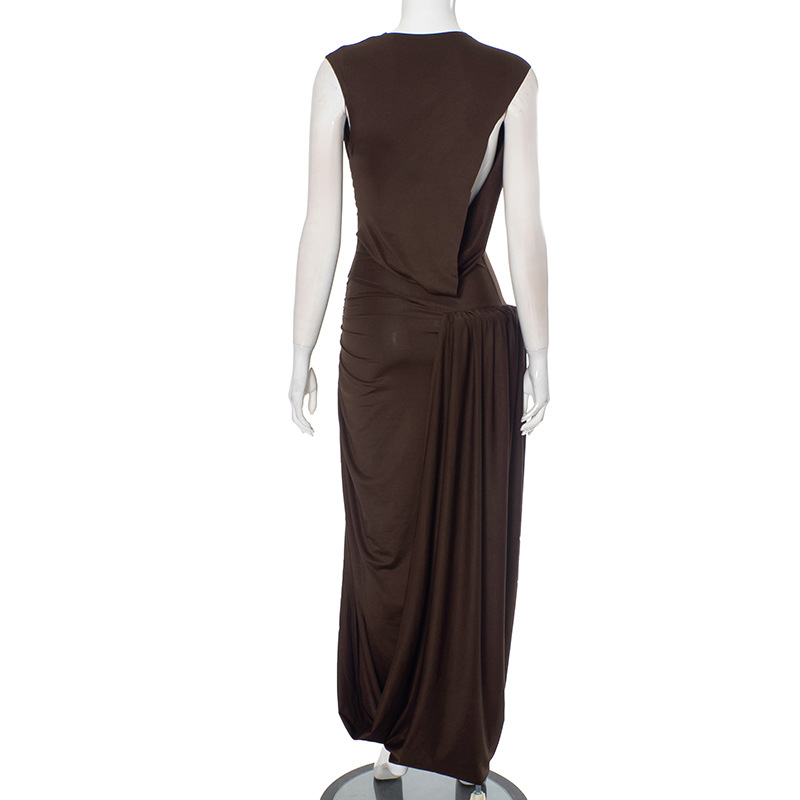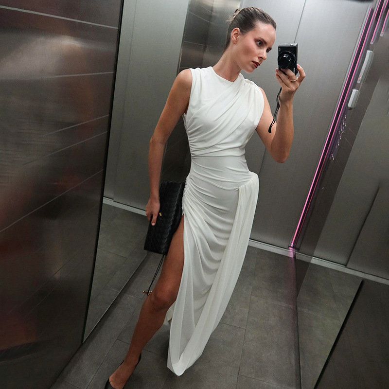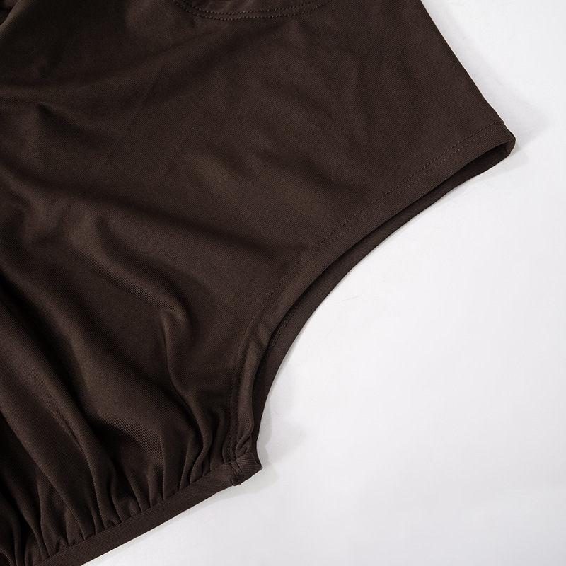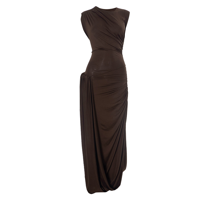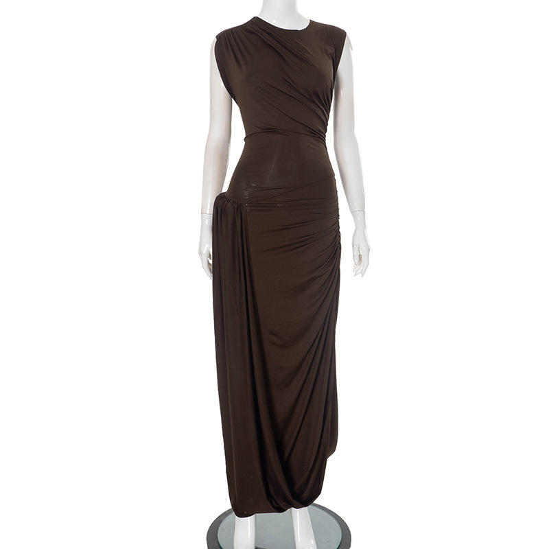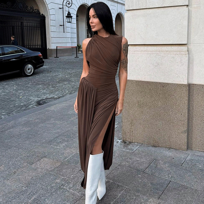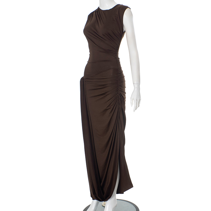 Solid Color round Neck Sleeveless Waist Tight Pleated Backless Elegant Dress
